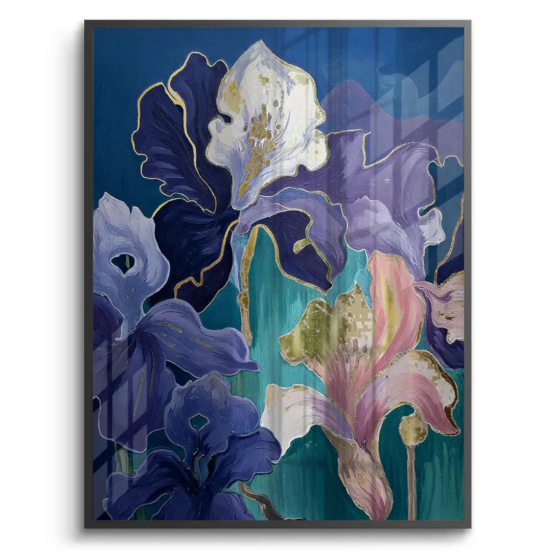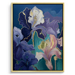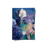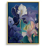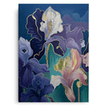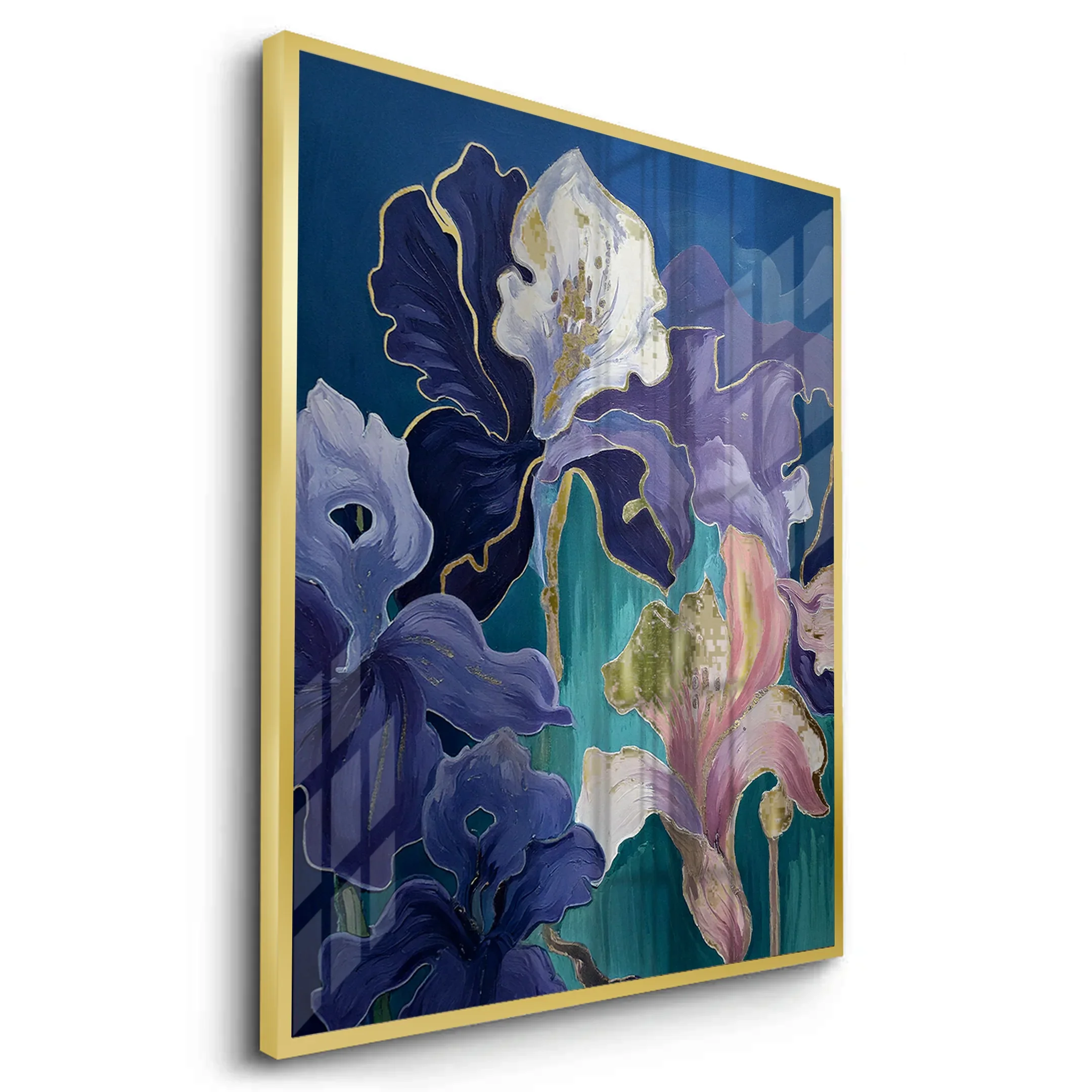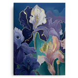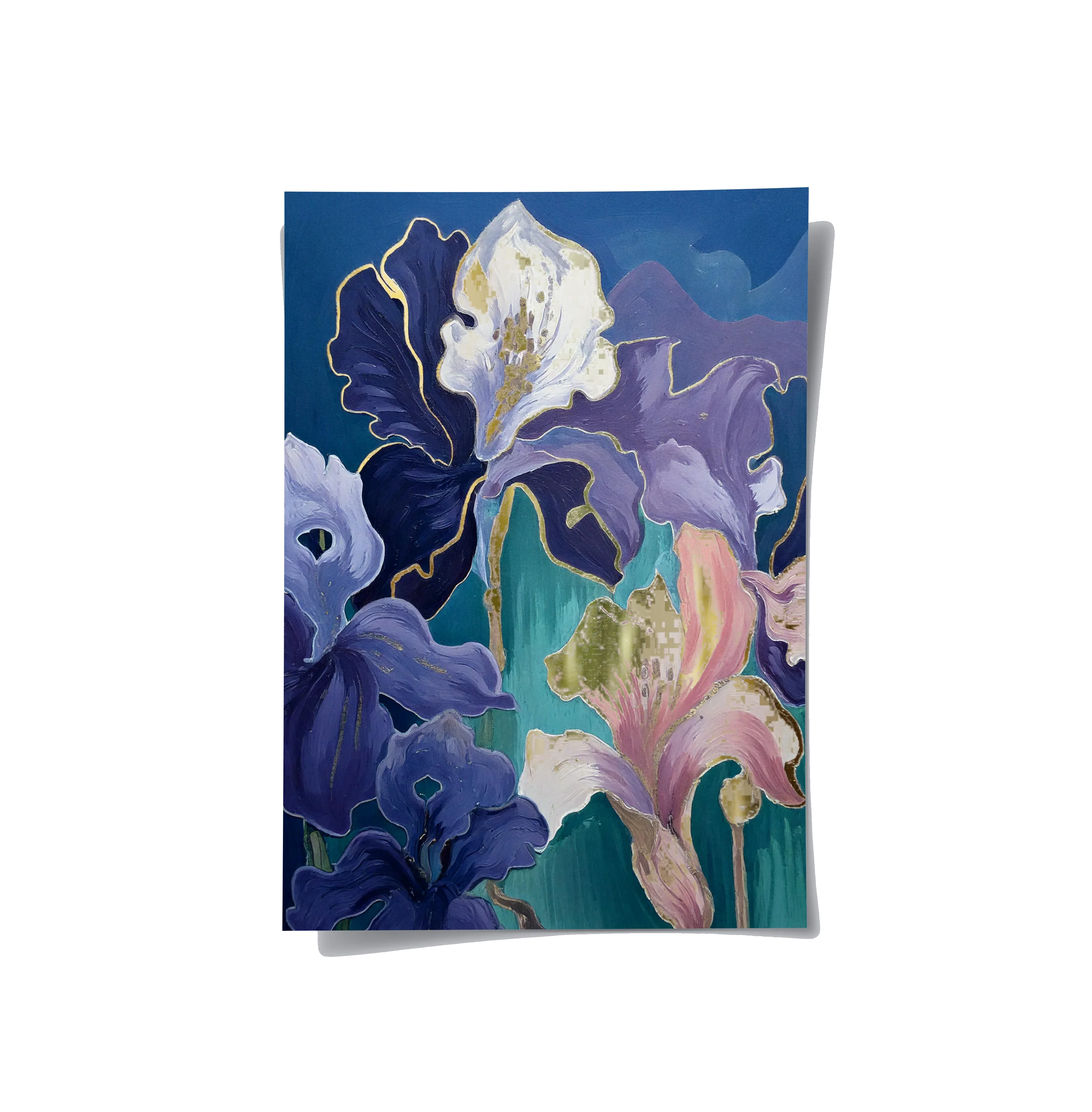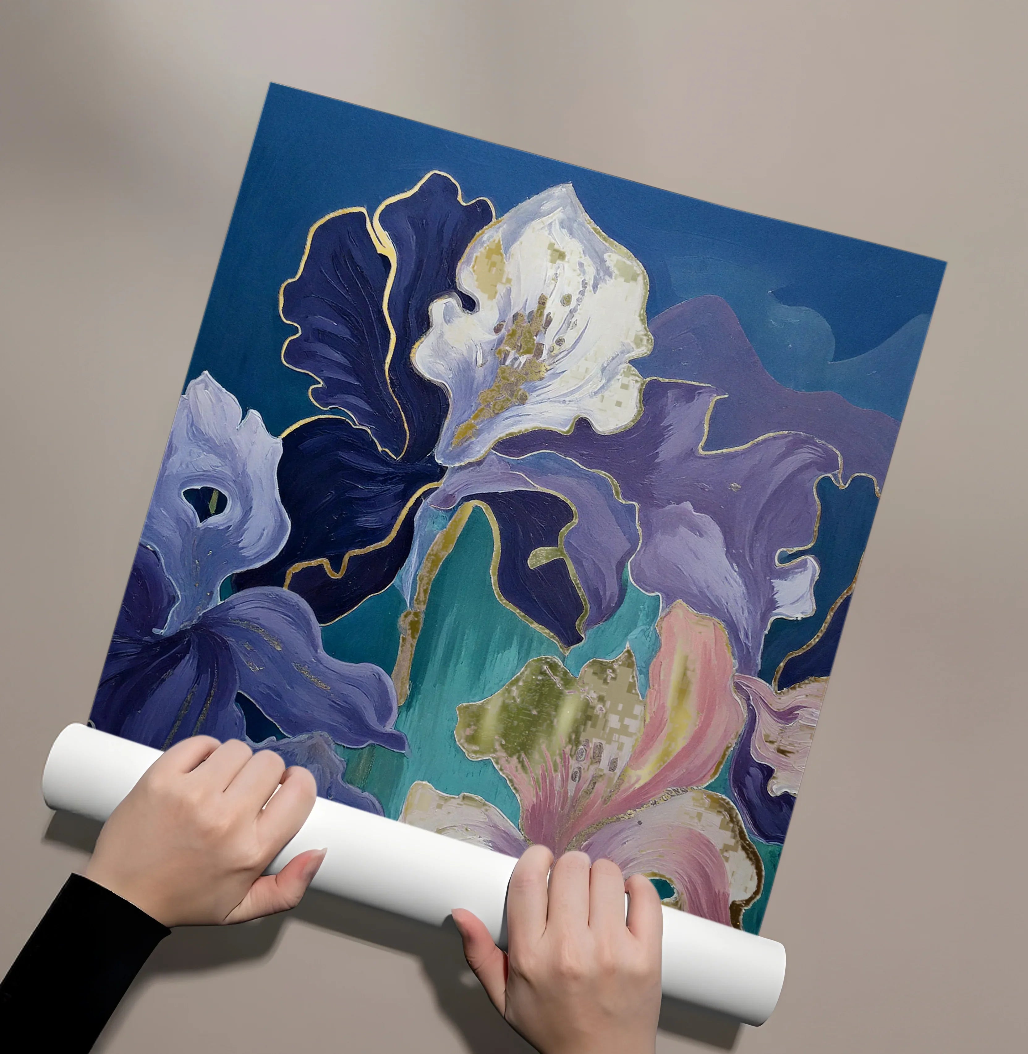 Bold irises in purple, white, and blush unfold against rich blue and green hues, highlighted with gold foil accents. Ideal for feature walls in bedrooms, lounges, or creative studios—adds vibrance, movement, and an artistic floral statement.