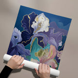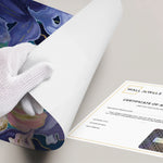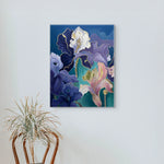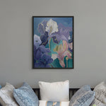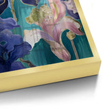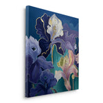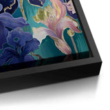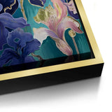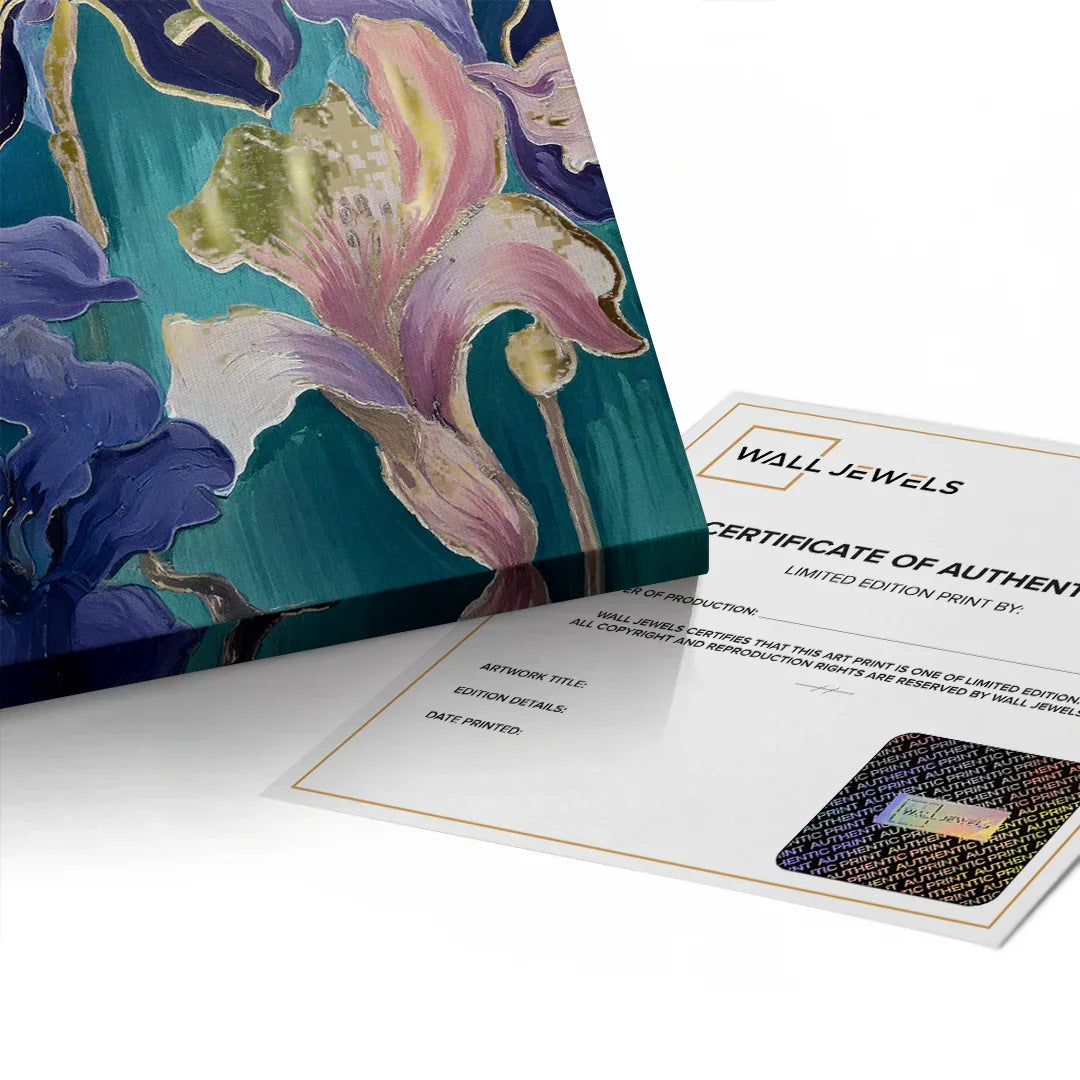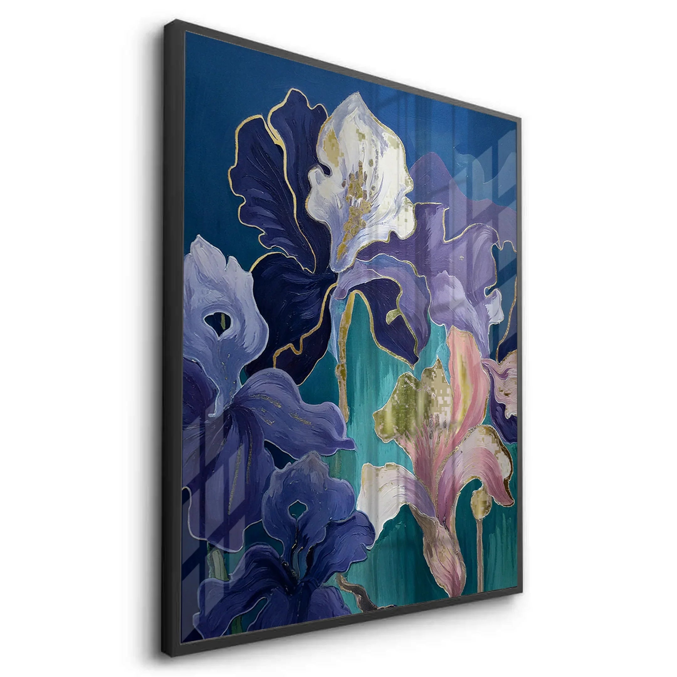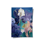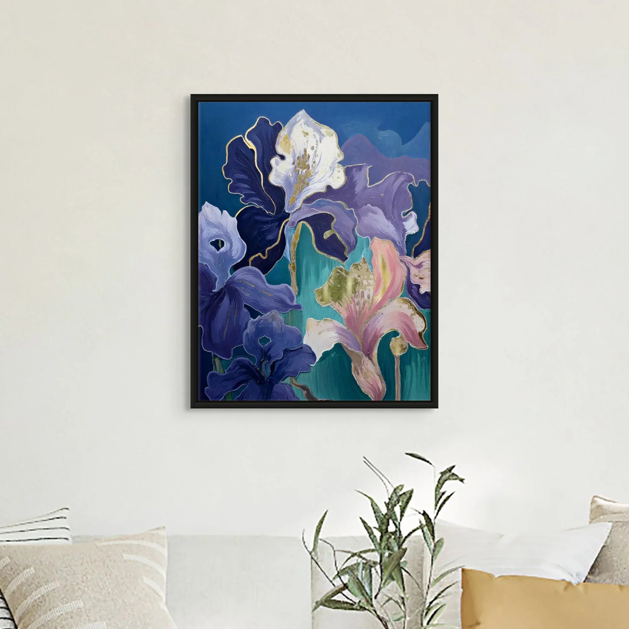 Bold irises in purple, white, and blush unfold against rich blue and green hues, highlighted with gold foil accents. Ideal for feature walls in bedrooms, lounges, or creative studios—adds vibrance, movement, and an artistic floral statement.