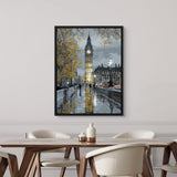A striking gold-foiled artwork of Big Ben surrounded by autumn hues and glowing reflections. Its refined style makes it an eye-catching centerpiece for contemporary living rooms, workspaces, or interiors inspired by global landmarks.