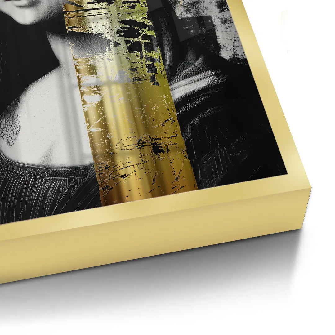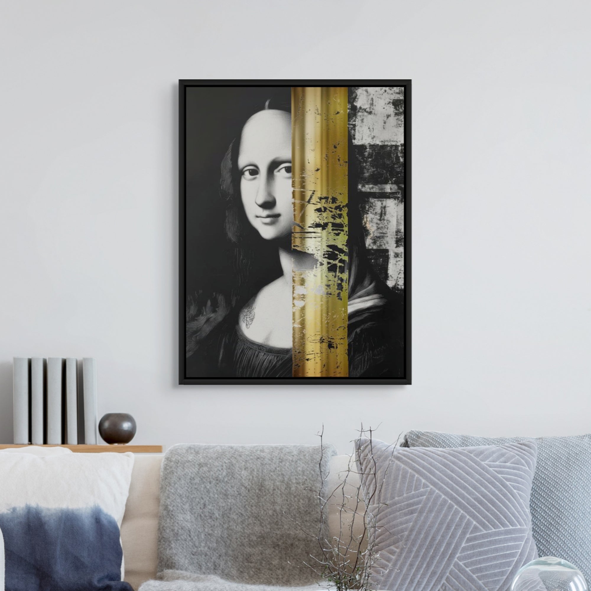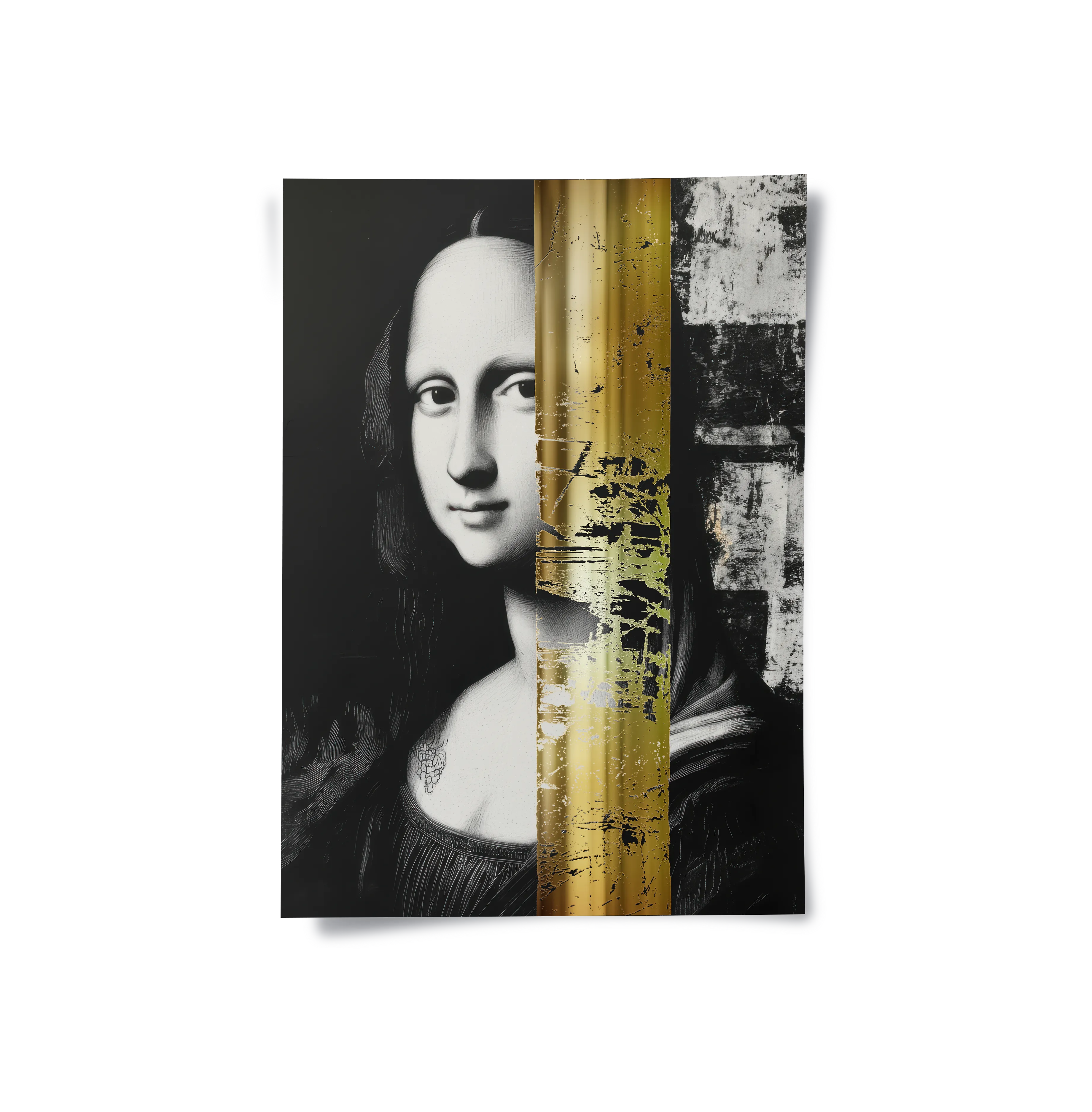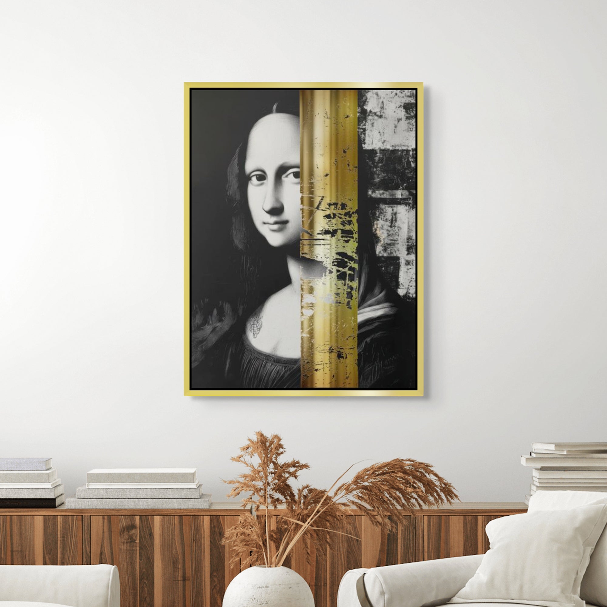 A modern take on the iconic portrait, this black-and-white Monalisa artwork features elegant gold foiling that adds subtle luxury. Perfect for chic interiors, gallery walls, or artistic corners—designed for those who admire timeless beauty with a twist.