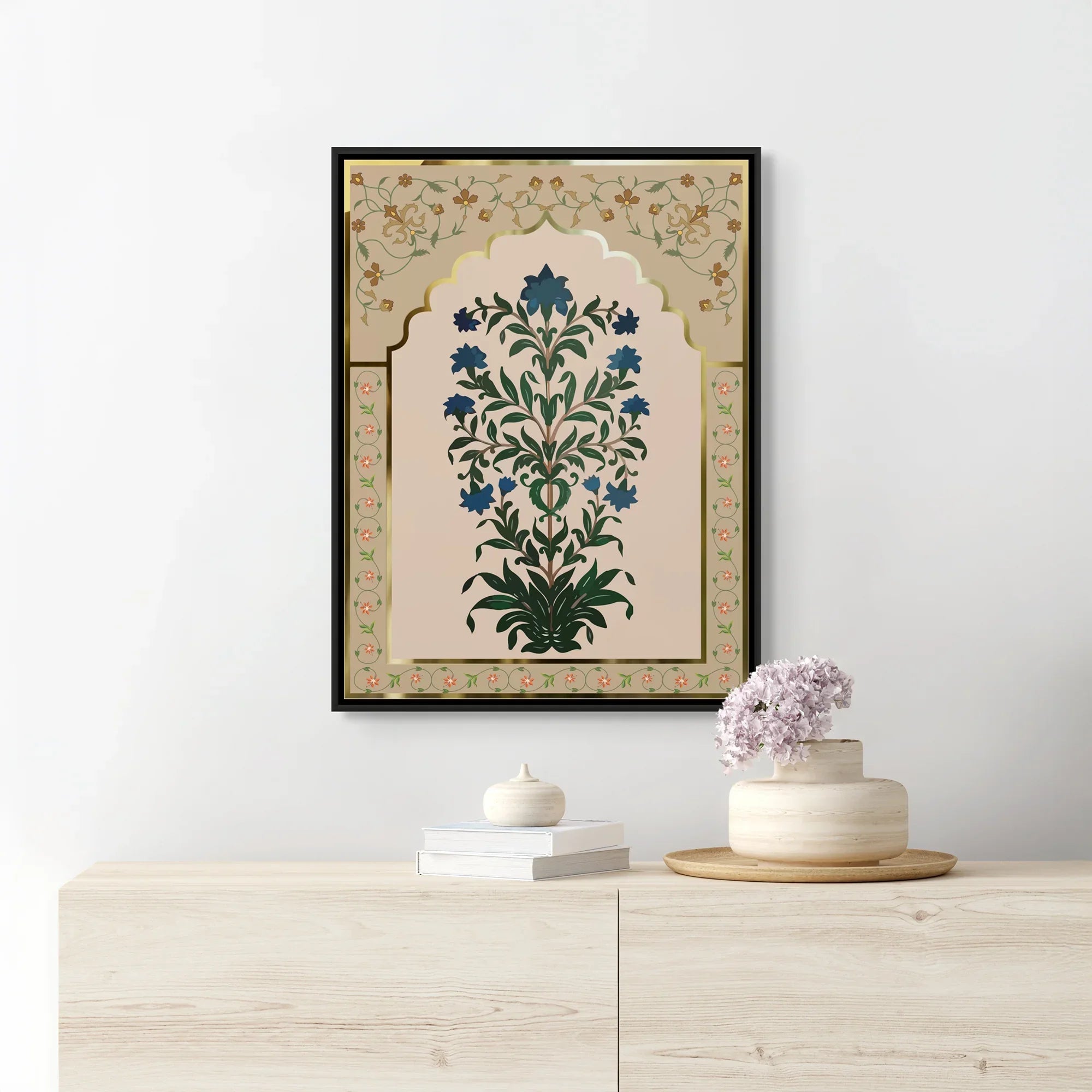Meaning “Garden of Indigo,” Bagh-e-Nīlī is a Mughal-inspired artwork featuring deep blue florals and intricate foliage, framed with ornate detailing and elegant gold foiling. Ideal for living rooms, bedrooms, entryways, or regal interior spaces.