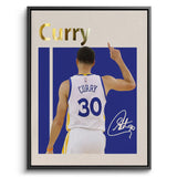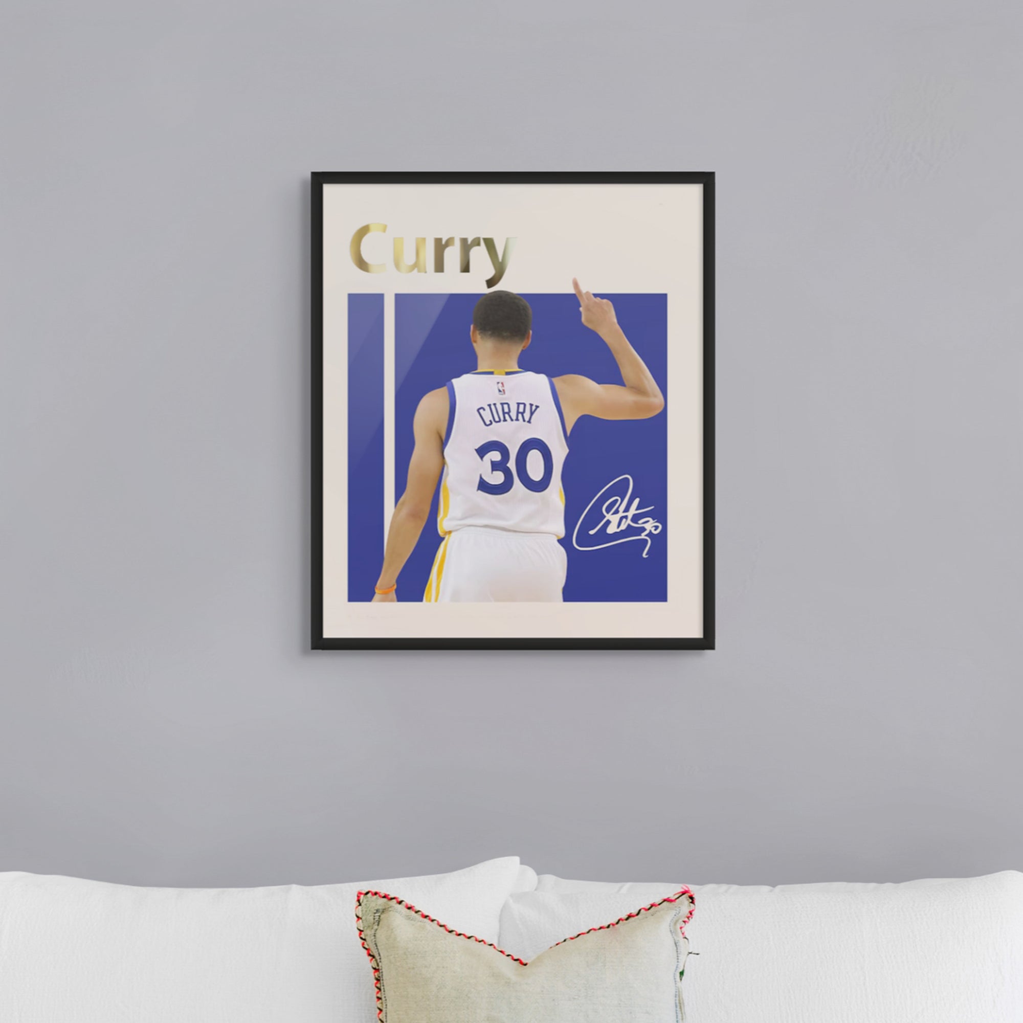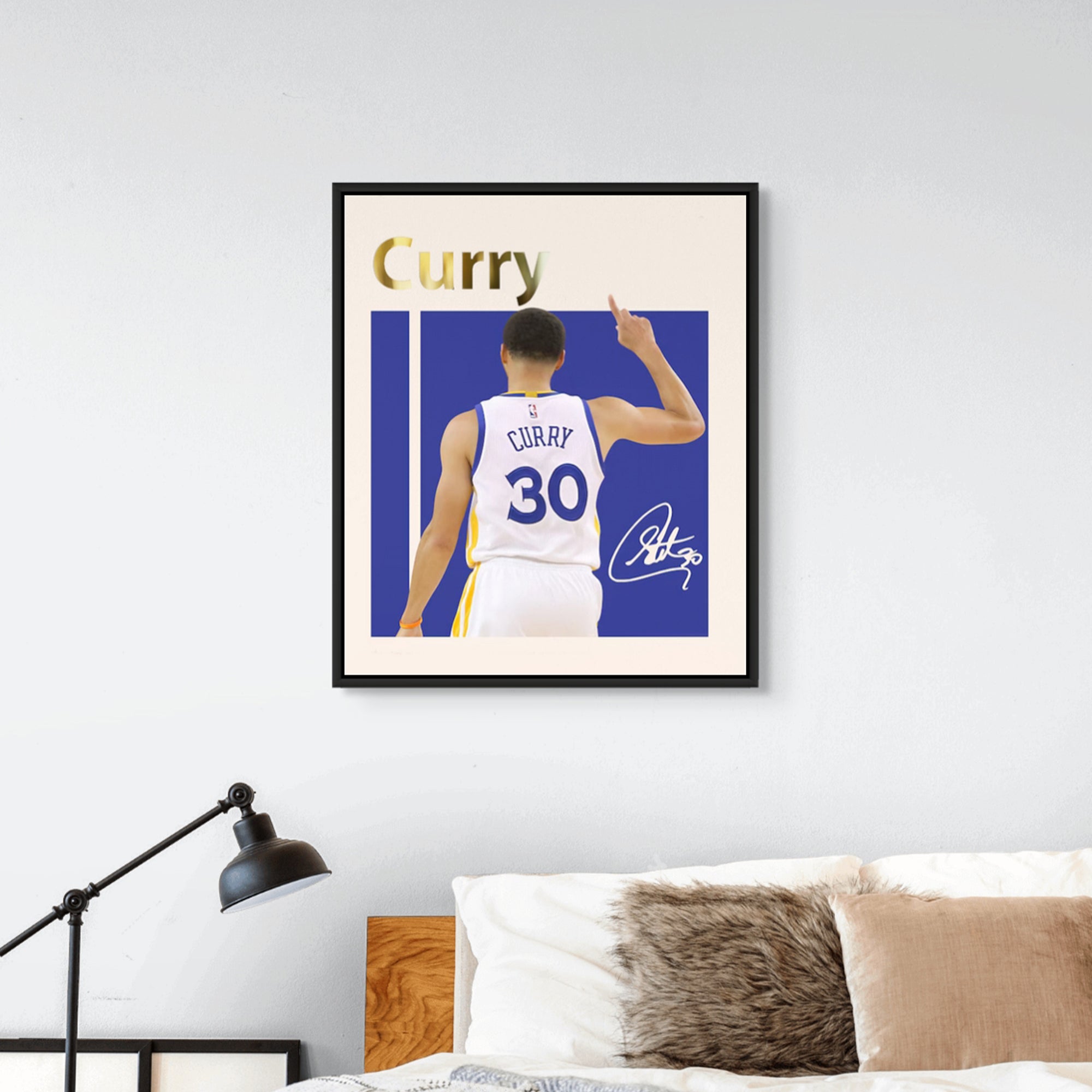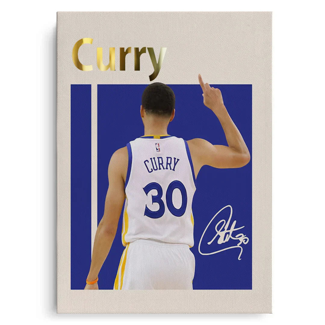 NBA star Stephen Curry points skyward in this clean, celebratory artwork—highlighting his iconic number 30 jersey. Finished with gold foiling, this piece suits basketball-themed spaces, fan rooms, or modern walls that honour greatness in the game.