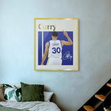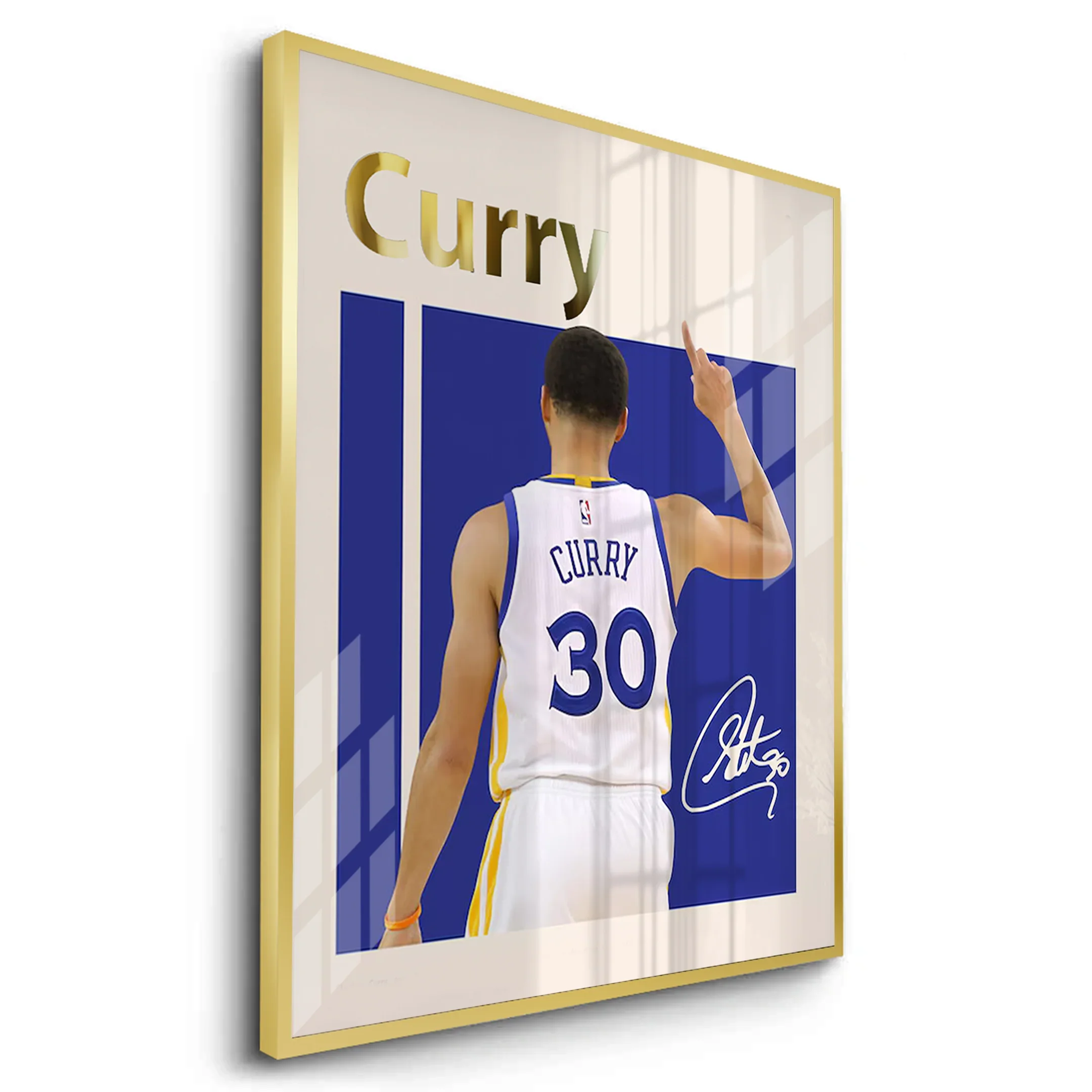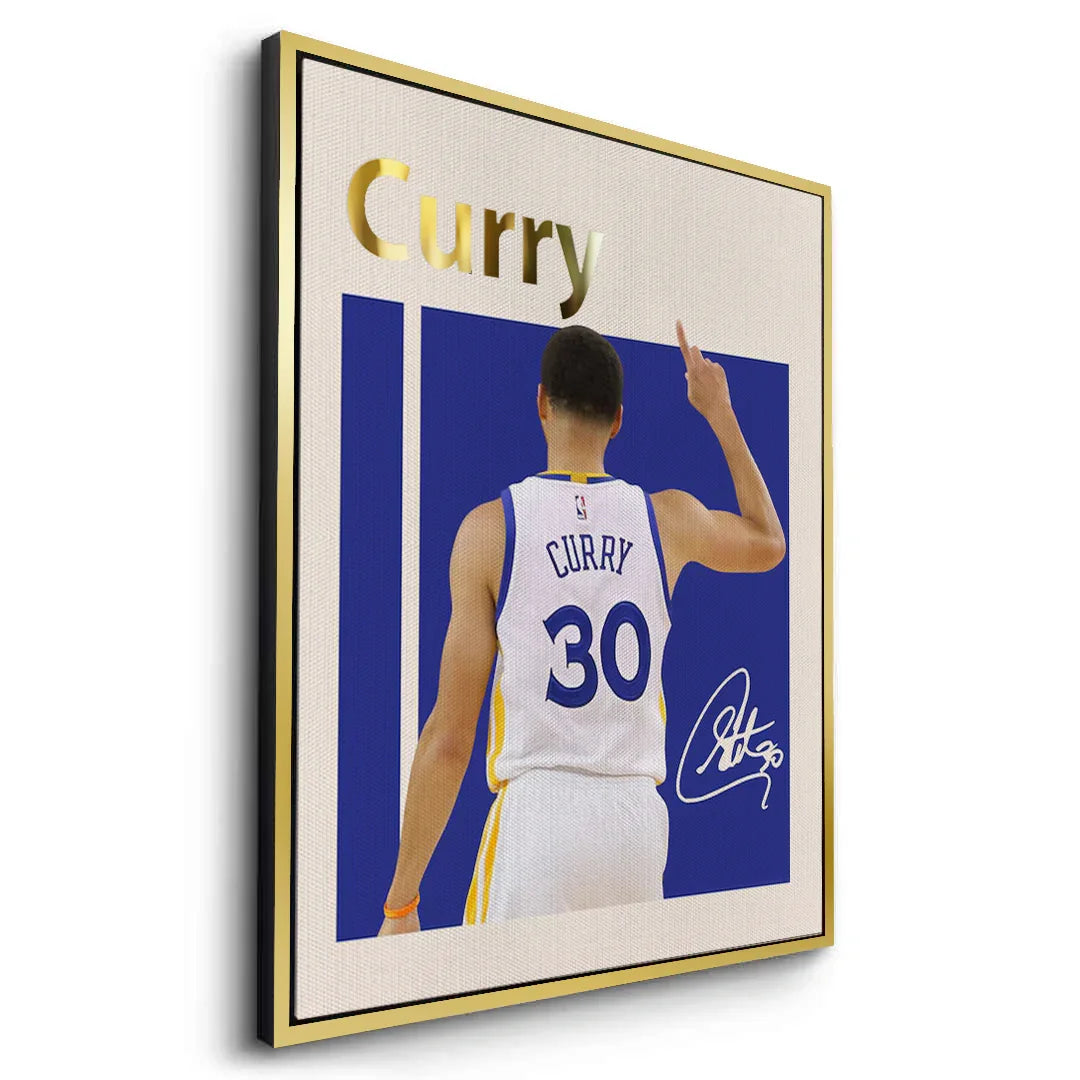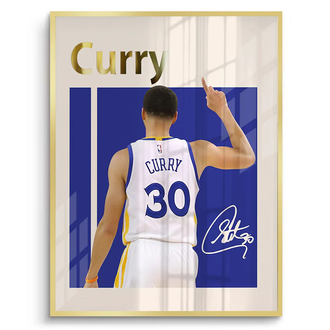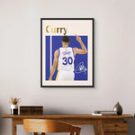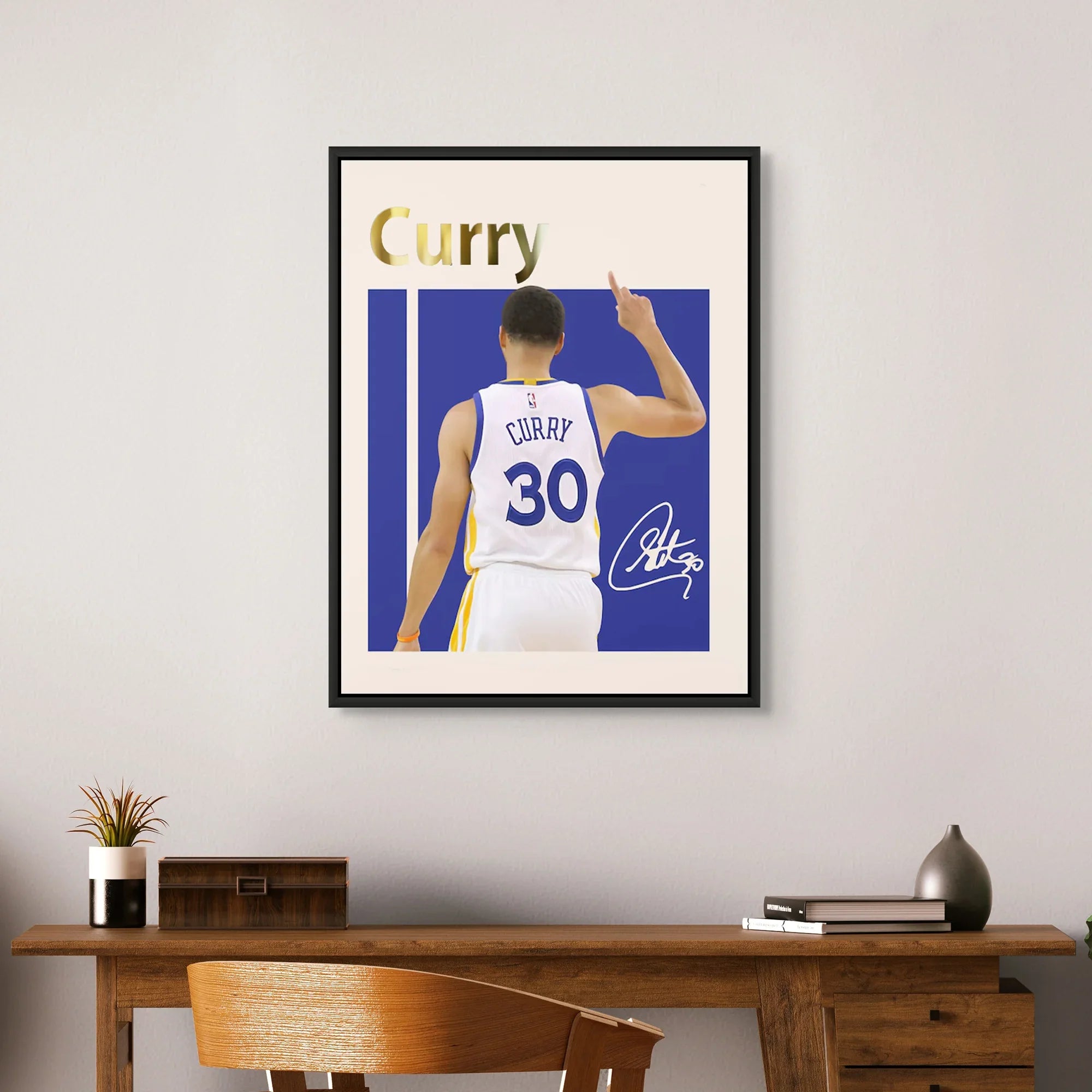 NBA star Stephen Curry points skyward in this clean, celebratory artwork—highlighting his iconic number 30 jersey. Finished with gold foiling, this piece suits basketball-themed spaces, fan rooms, or modern walls that honour greatness in the game.
