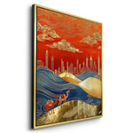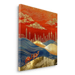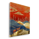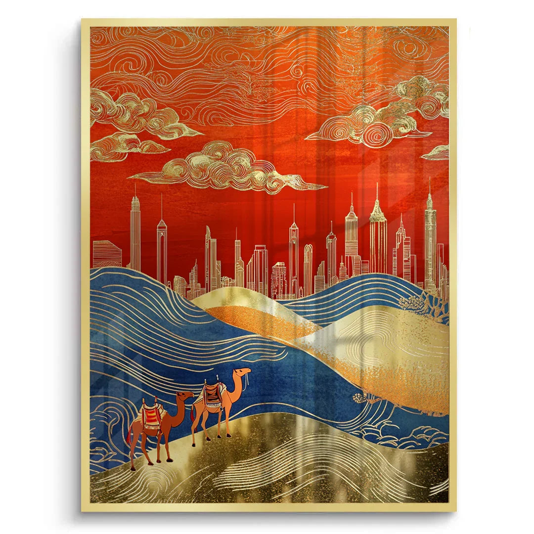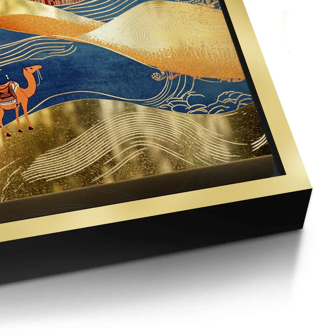 Two camels cross flowing dunes toward a golden skyline, blending tradition with progress in this elegant composition. Finished with gold foiling, this artwork suits entryways, offices, or interiors that honor the spirit of the desert.