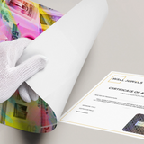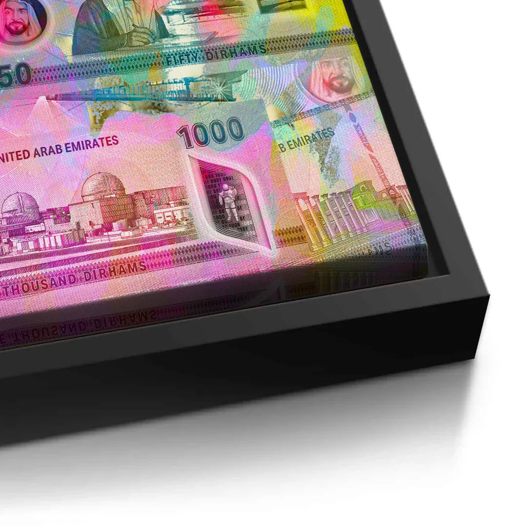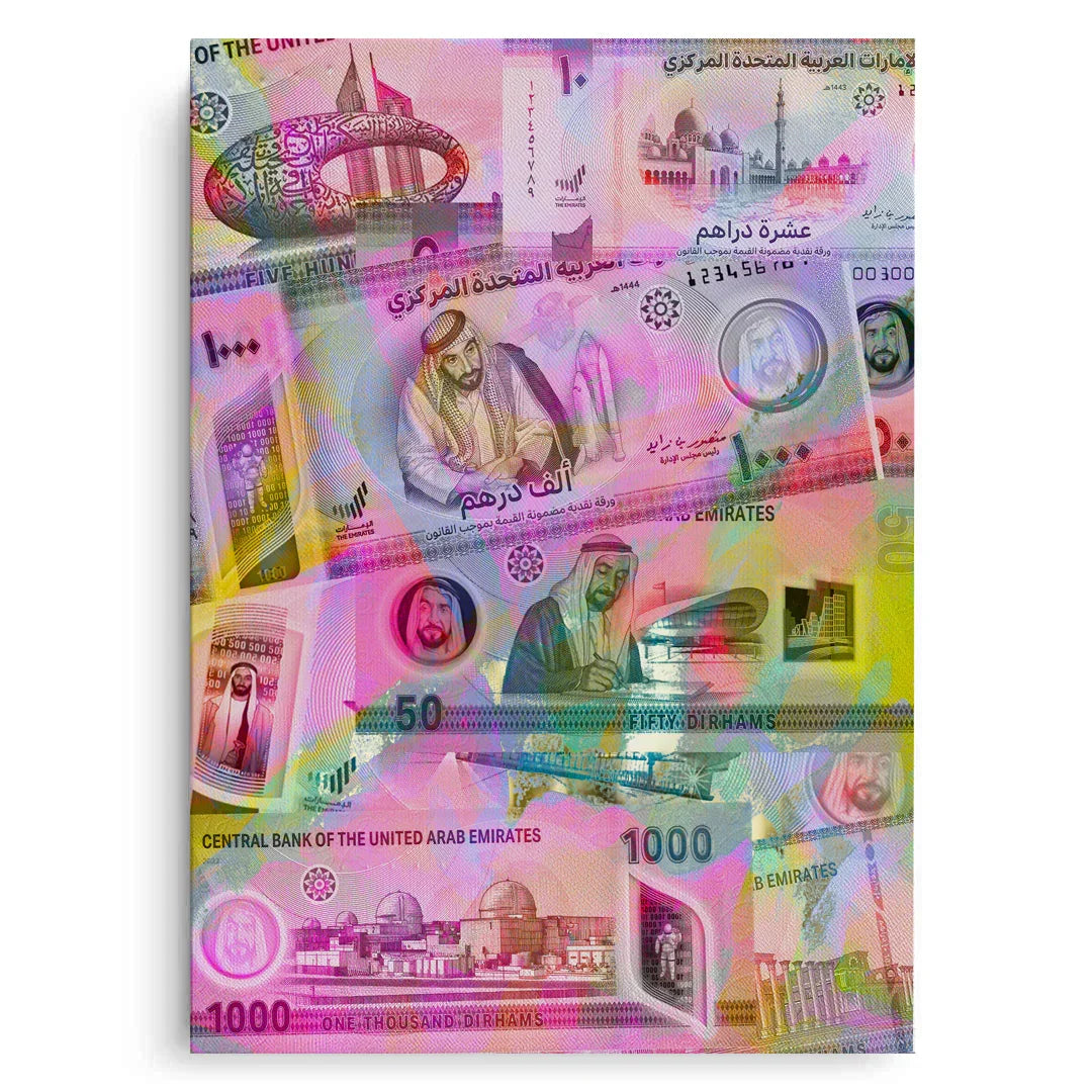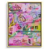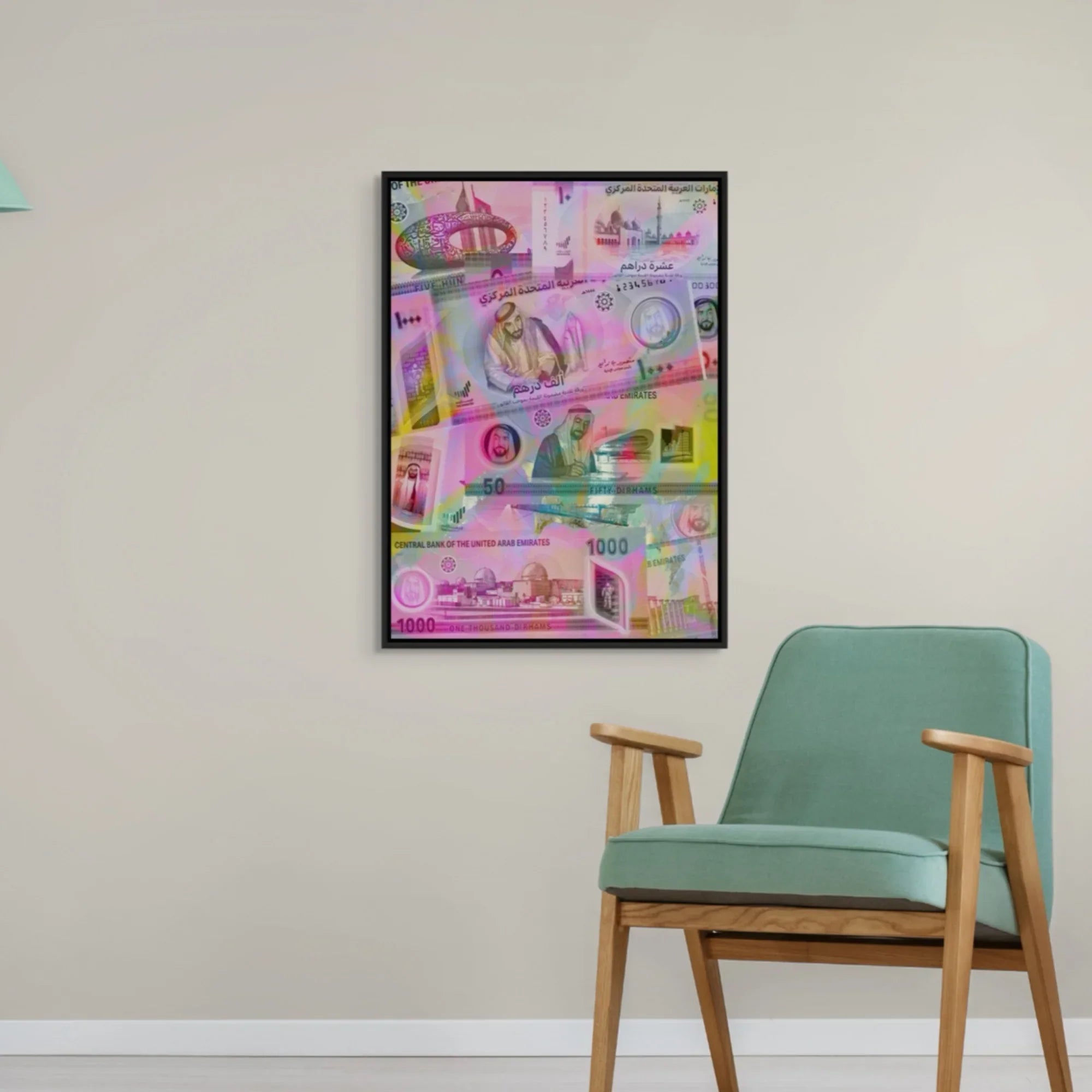 A vibrant pop-style celebration of the UAE’s currency, this artwork layers Emirati dirham notes into a dynamic collage. Rich with national icons and leaders, it suits eclectic interiors, creative spaces, or modern collector’s corners.