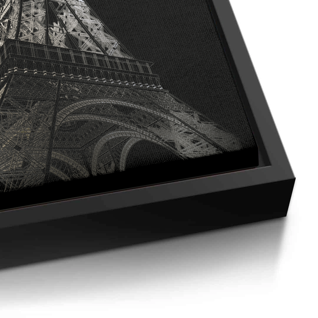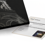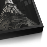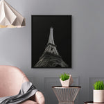This striking silver-foiled depiction of the Eiffel Tower emphasizes its architectural detail against a deep black backdrop. A modern yet classic piece, ideal for stylish living rooms, offices, or gallery-inspired walls.
