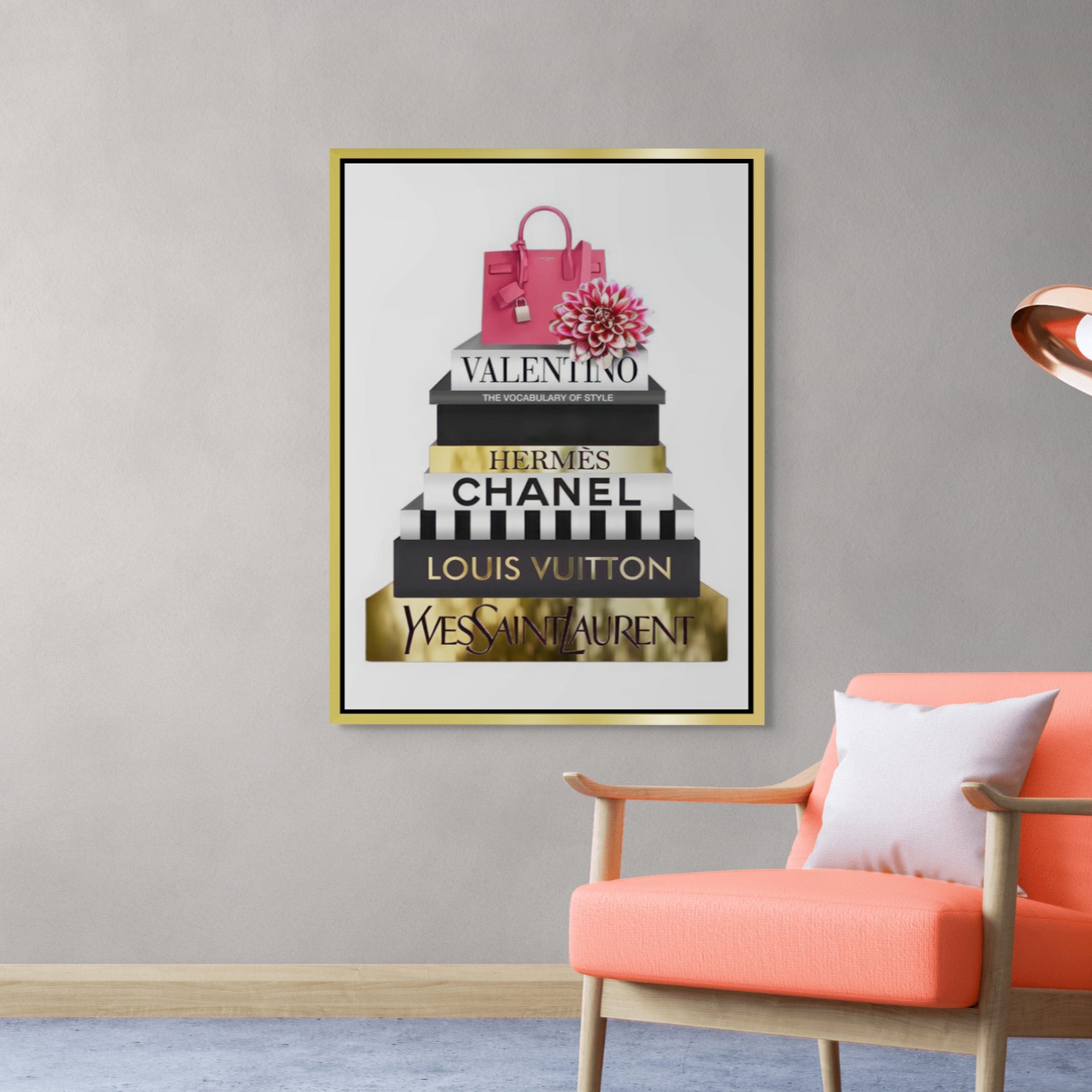 A luxe stack of high-end designer books, detailed in radiant gold foiling, crowned with a statement pink handbag and soft florals. Fashion Archives is perfect for glam spaces, closets, or style lovers who live for timeless fashion moments.