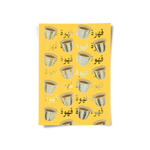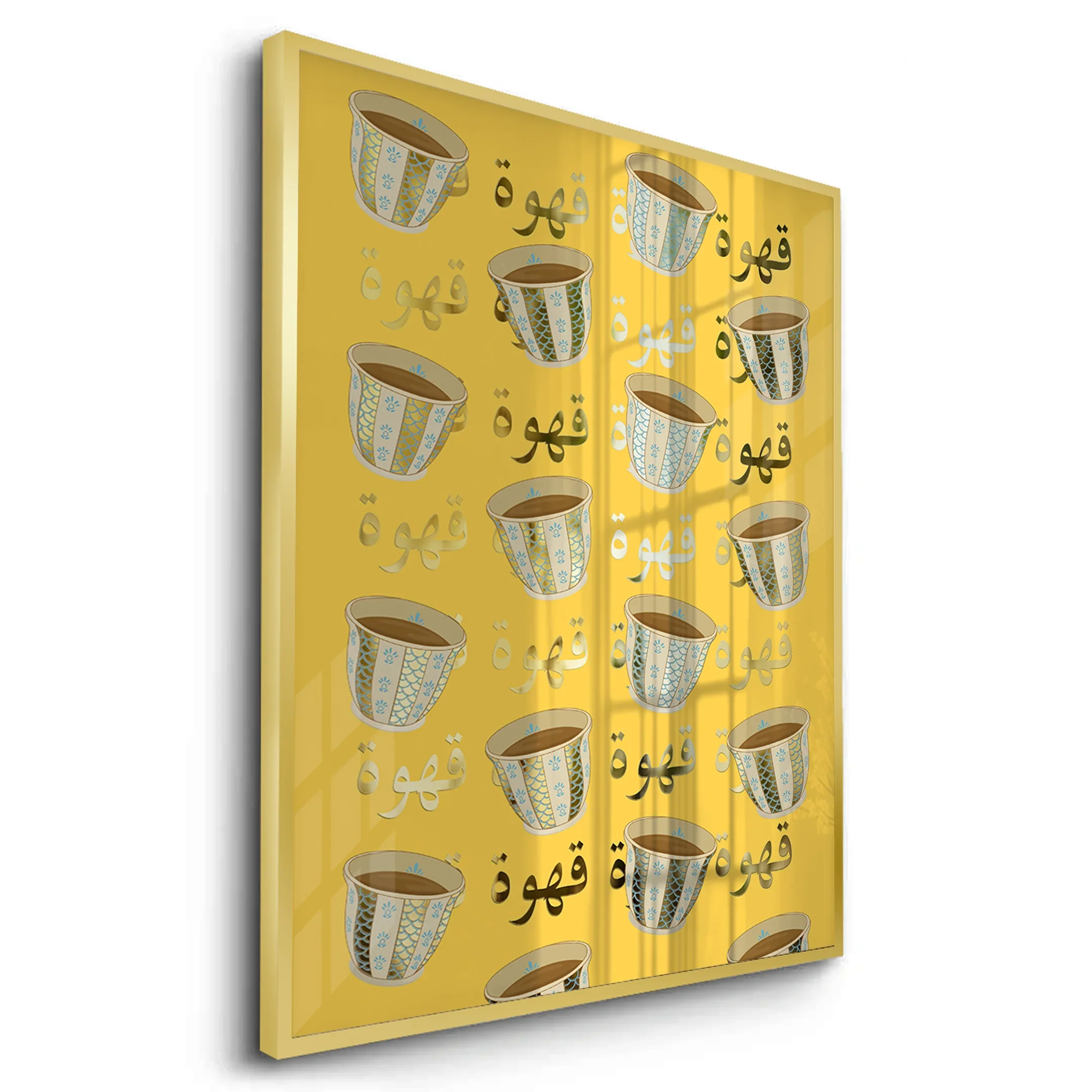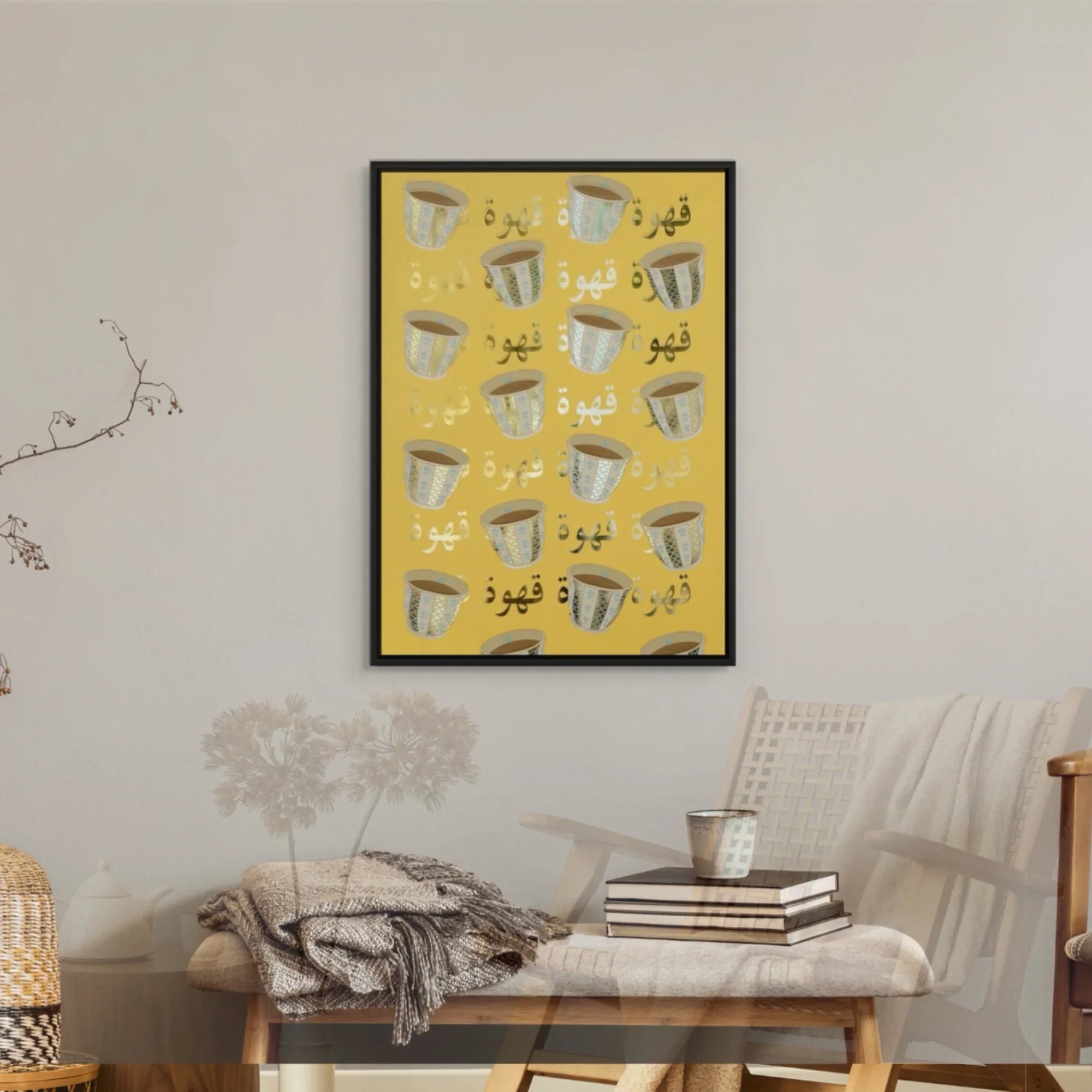 An upbeat tribute to Arabic coffee culture, this artwork repeats traditional coffee cups and Arabic script in a playful layout. Subtle gold foiling adds charm, perfect for kitchens, cafés, or hospitality spaces celebrating Middle Eastern warmth.