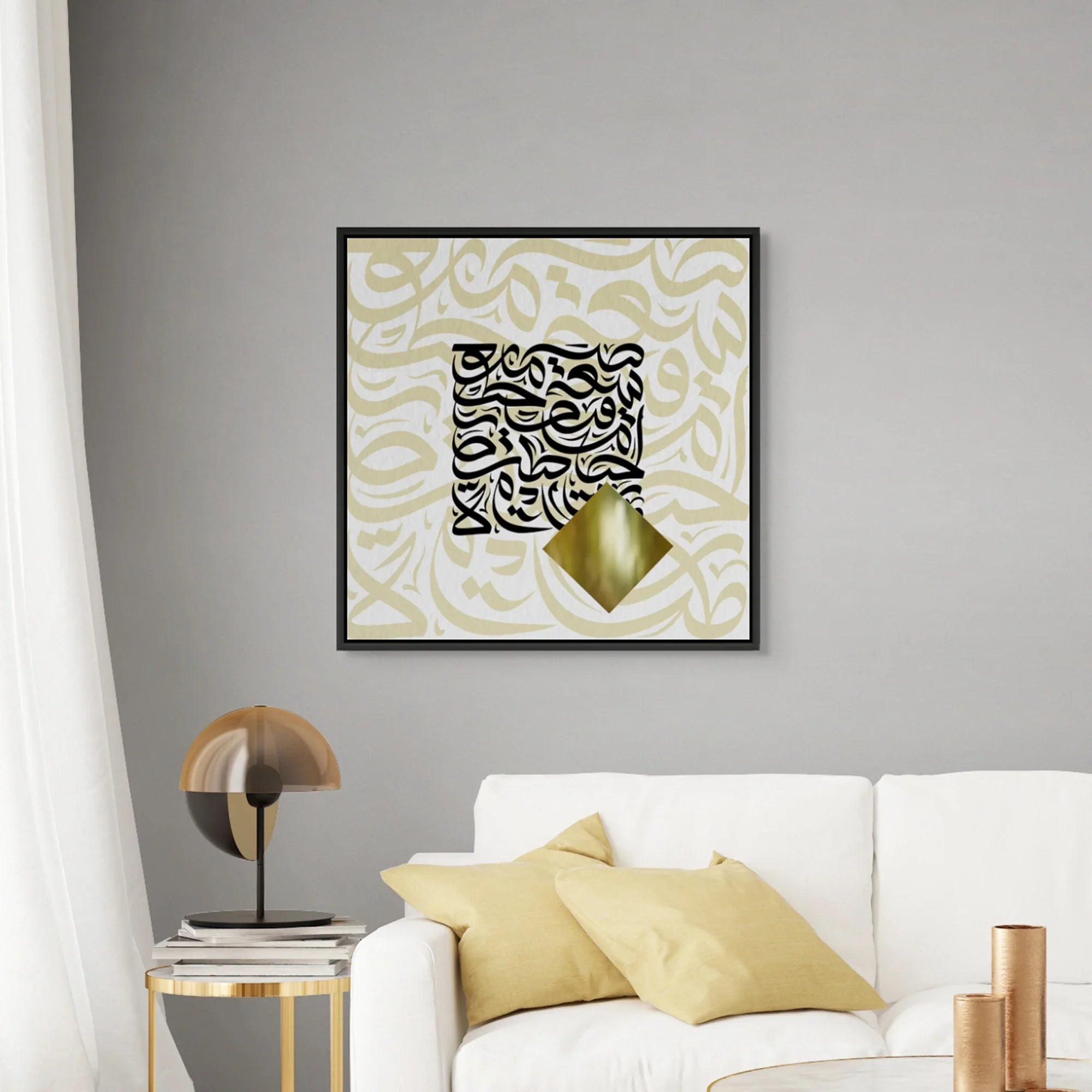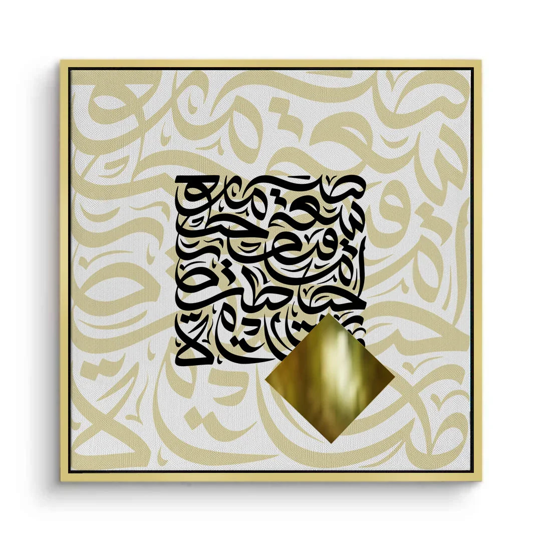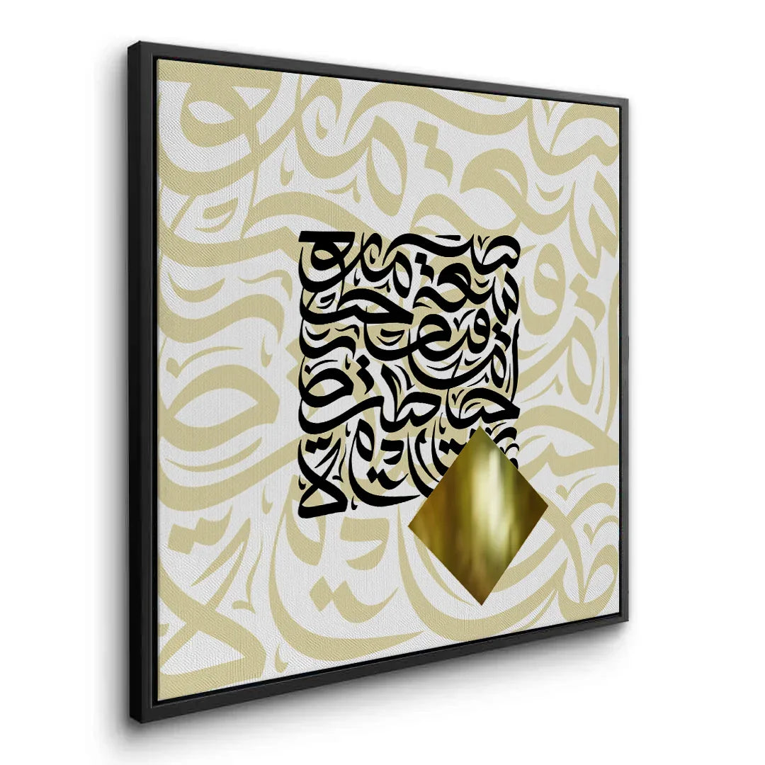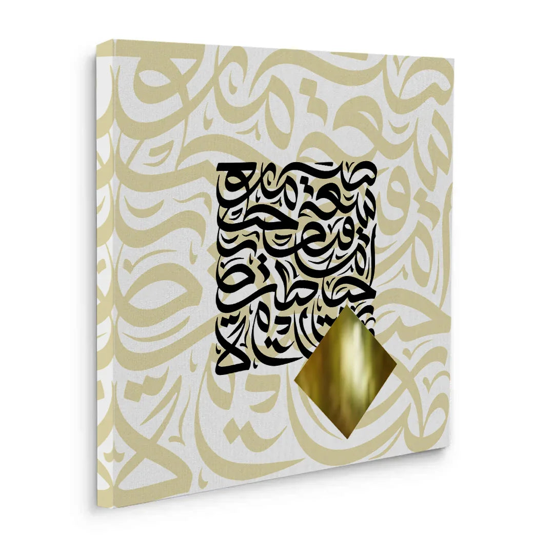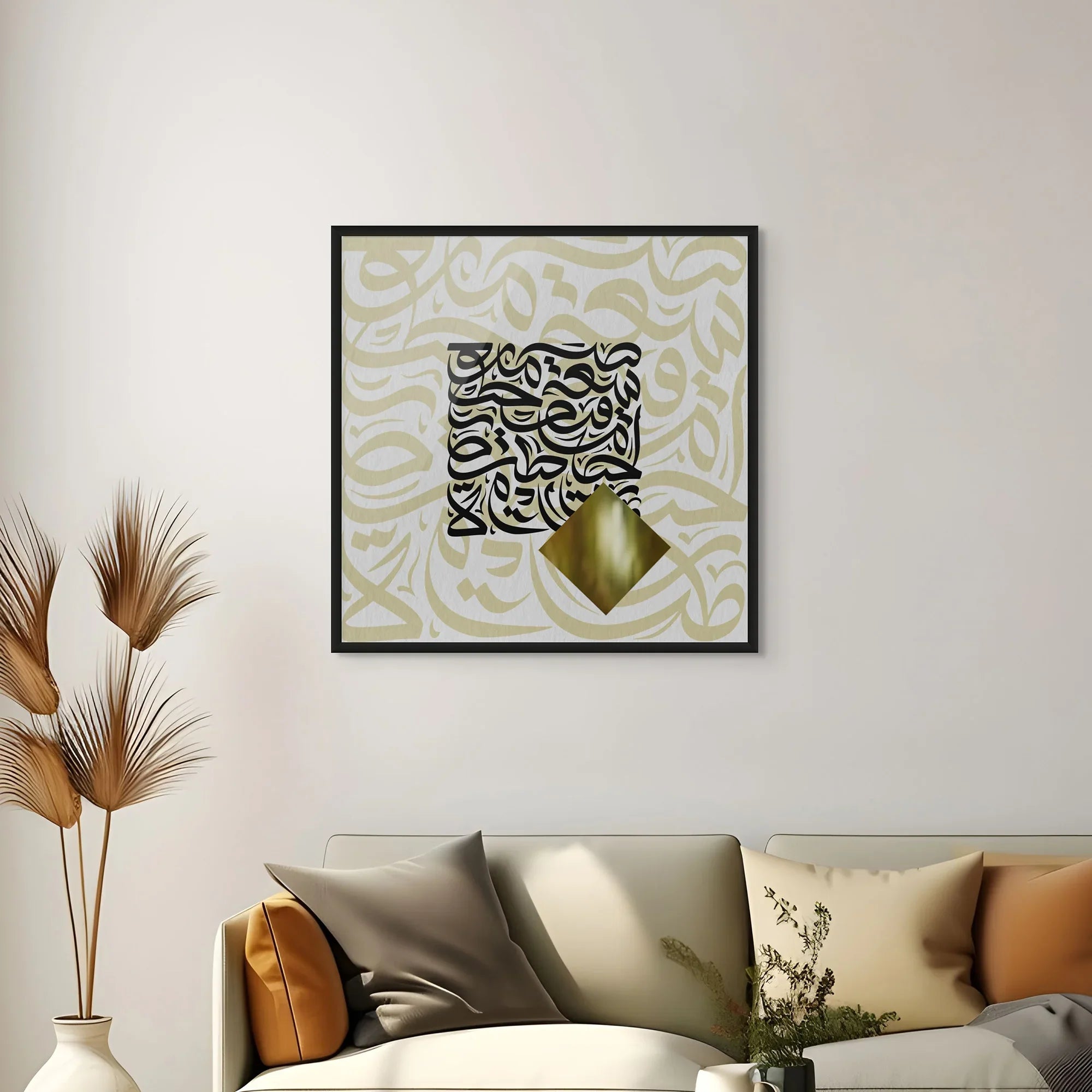 A striking fusion of modern form and calligraphic abstraction. Dense black Arabic strokes rest inside a rhythmic golden diamond, wrapped in a soft script-laced backdrop. This artwork speaks serenity through structure.