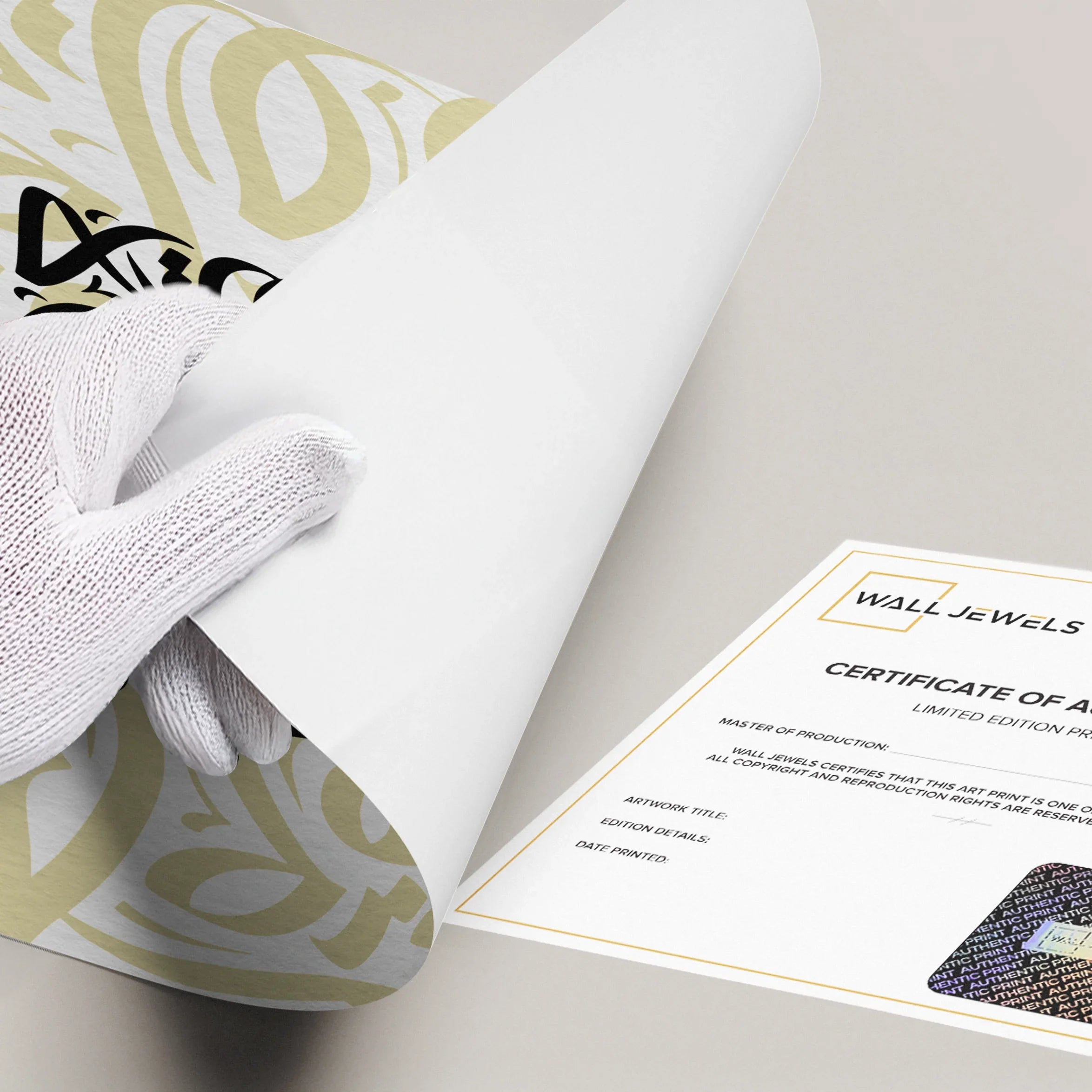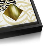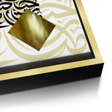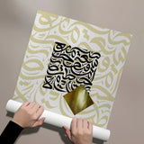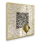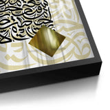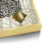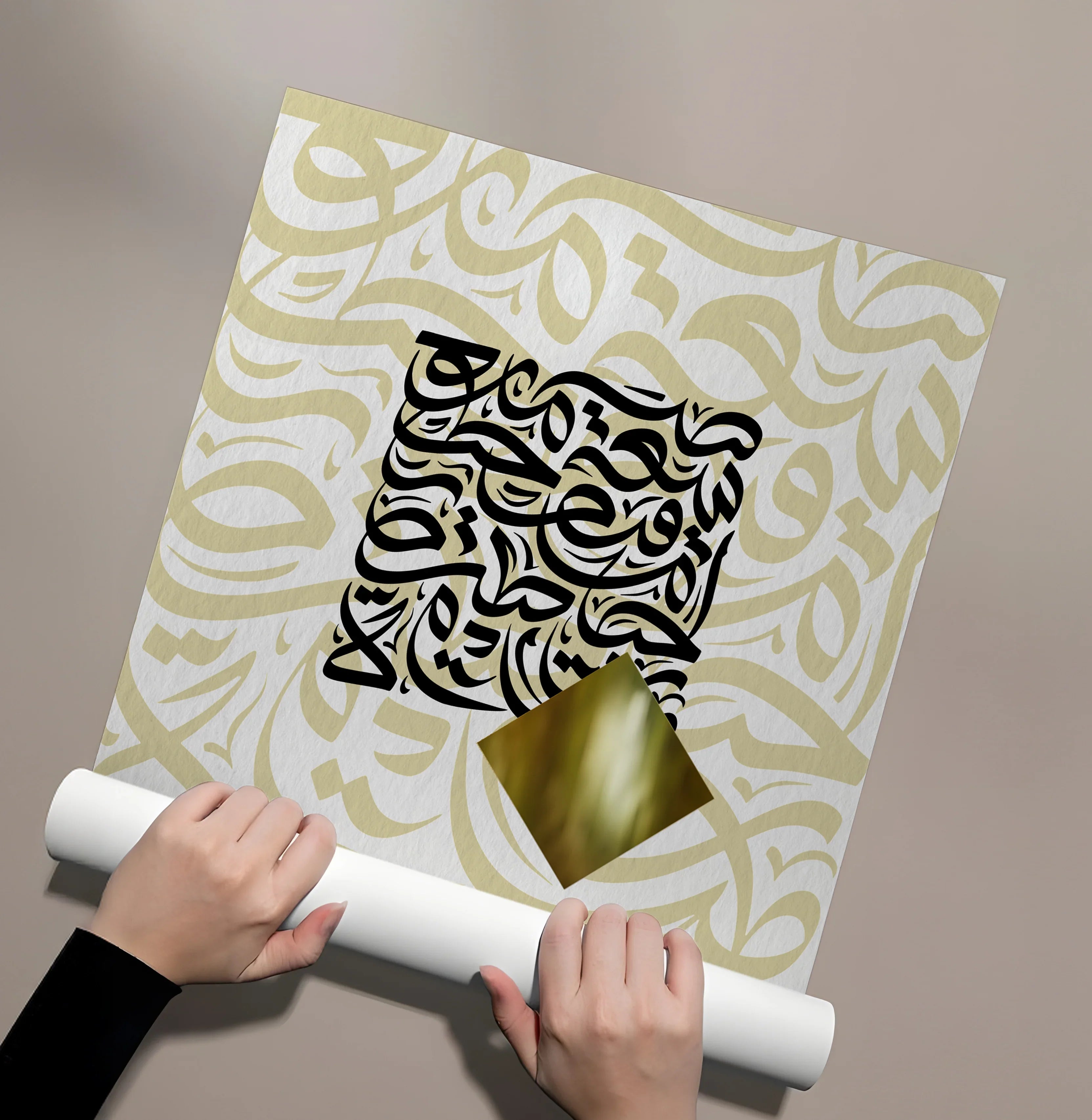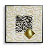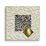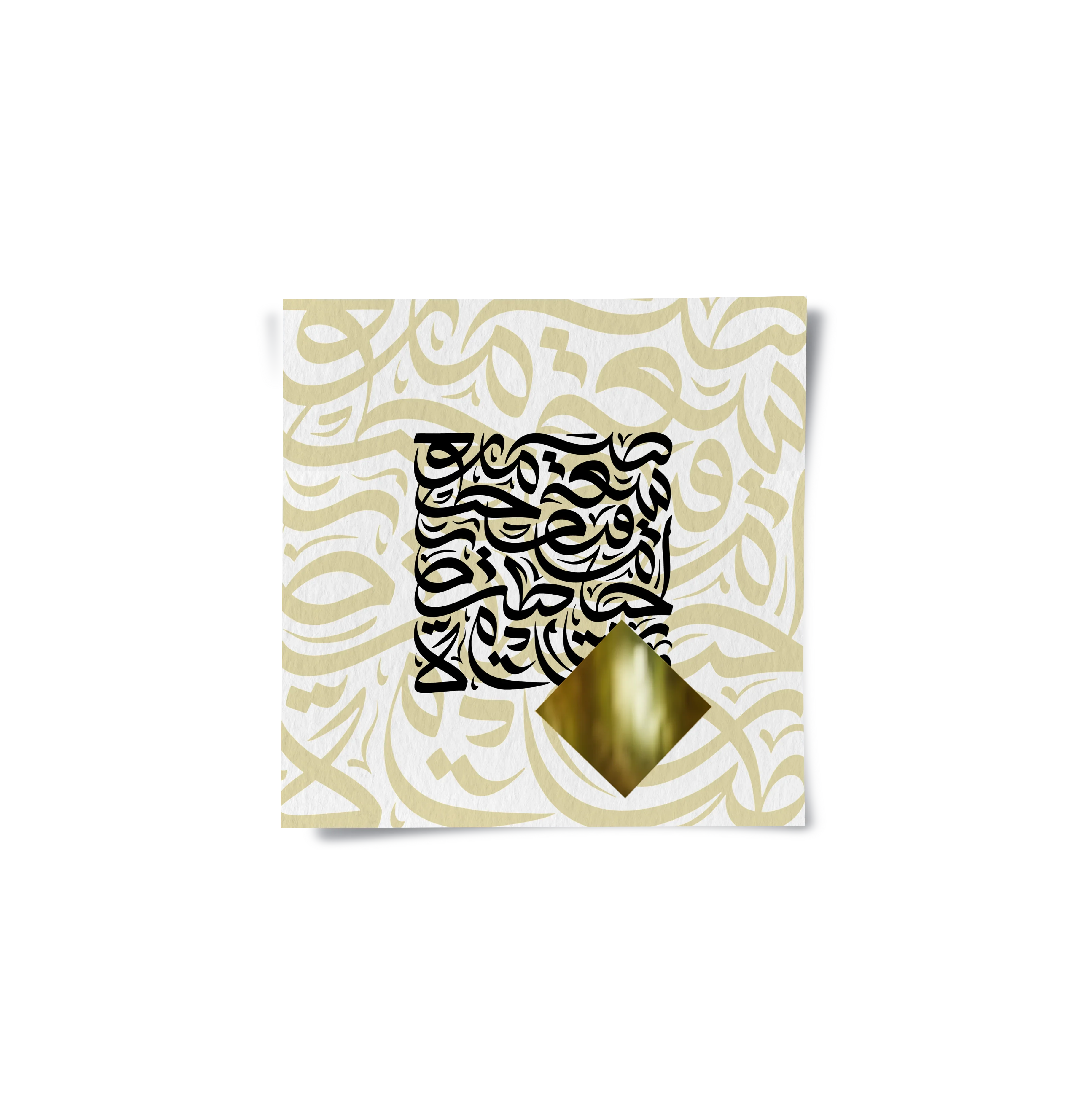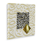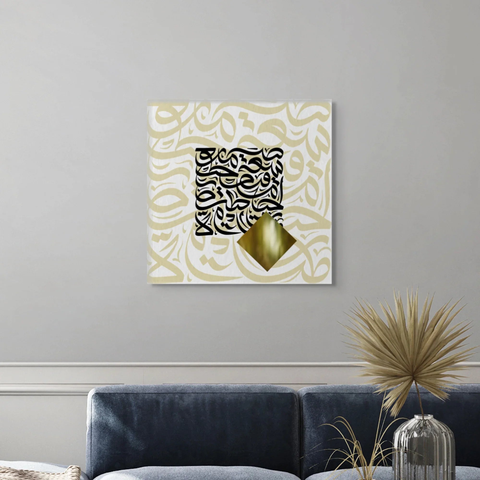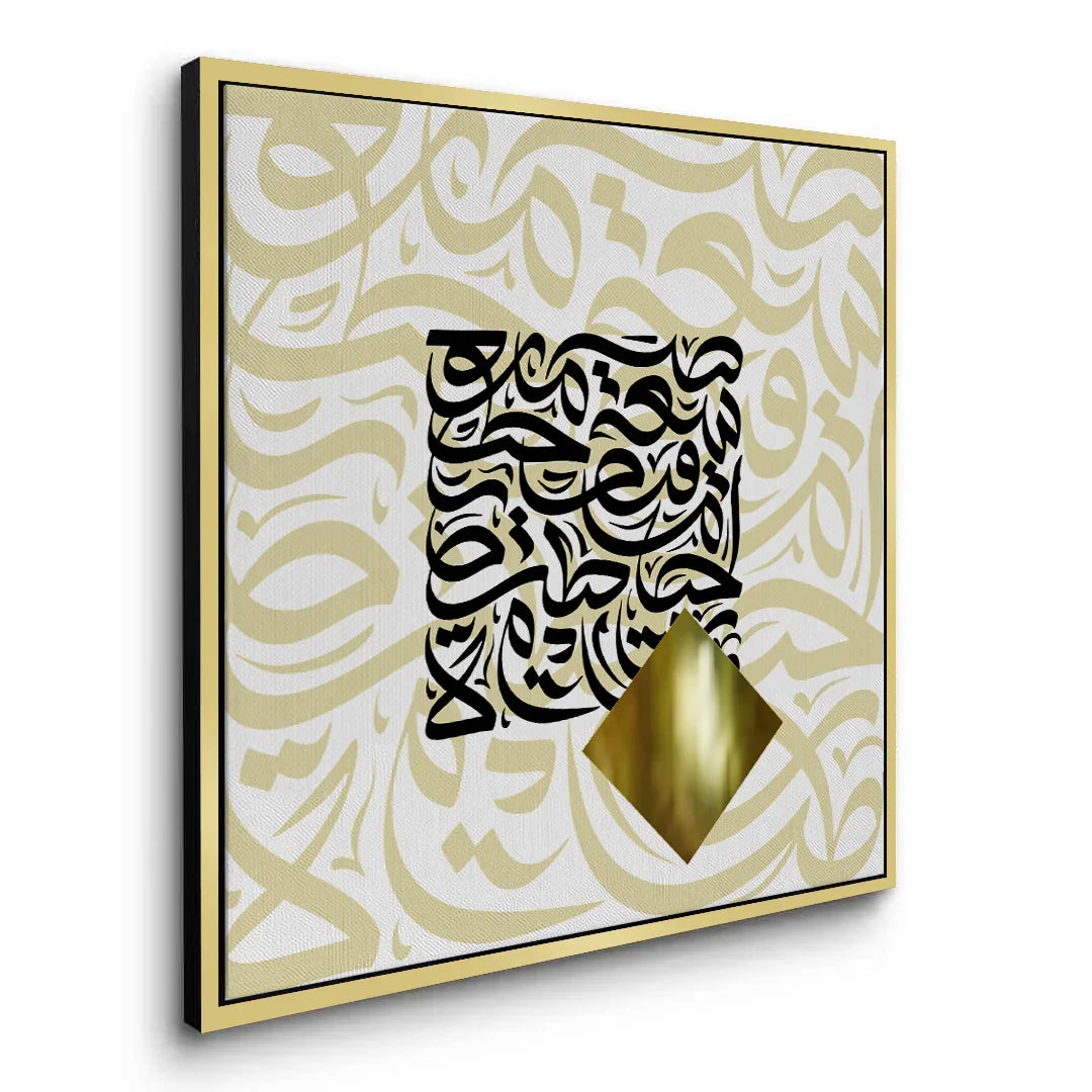 A striking fusion of modern form and calligraphic abstraction. Dense black Arabic strokes rest inside a rhythmic golden diamond, wrapped in a soft script-laced backdrop. This artwork speaks serenity through structure.