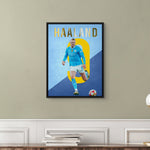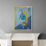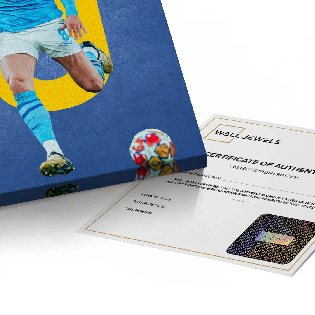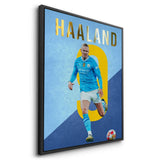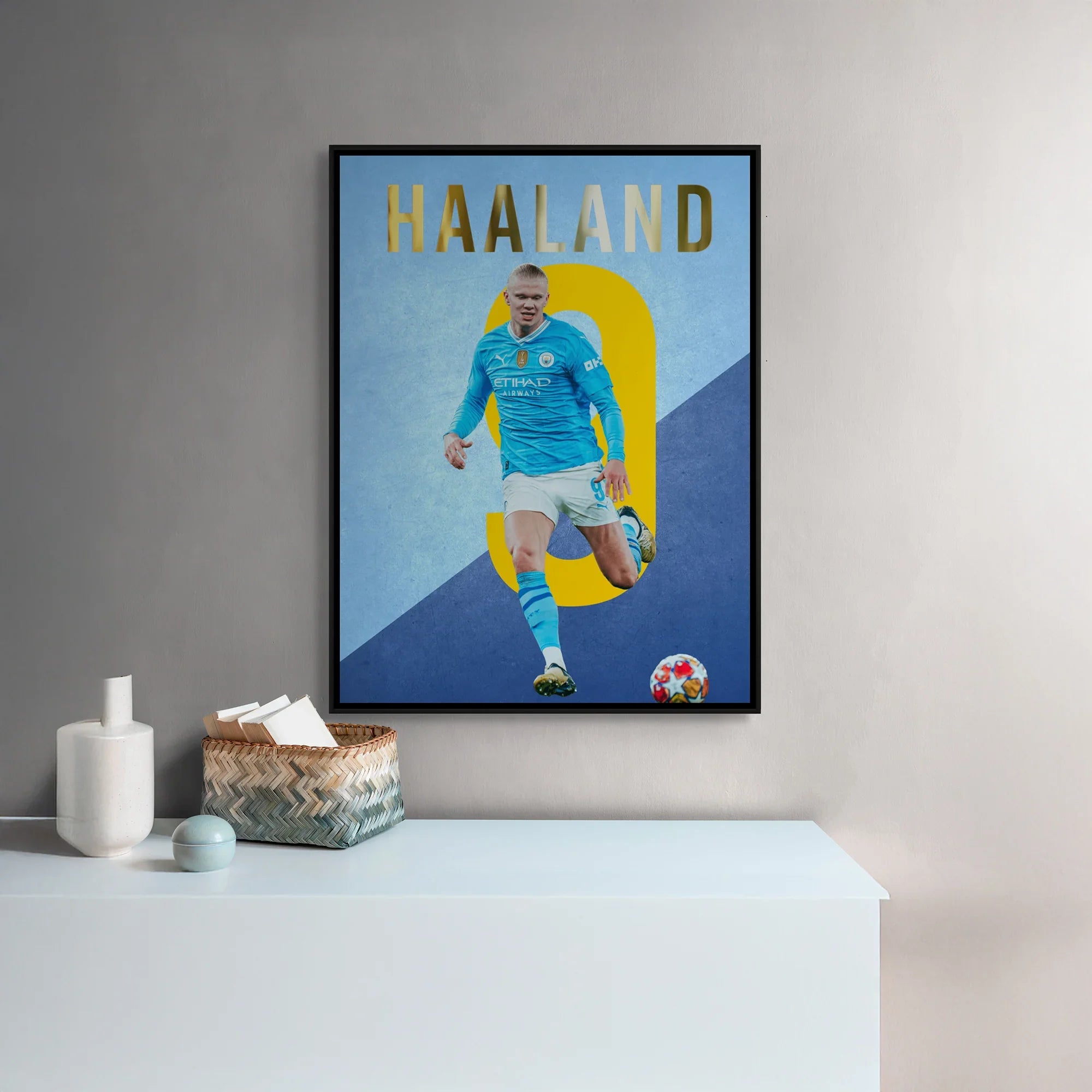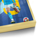 Erling Haaland charges forward in signature City blue, captured in motion against a bold backdrop. Detailed with gold foiling, this powerful piece elevates any home gym, modern lounge, or football fan’s wall with unstoppable energy.