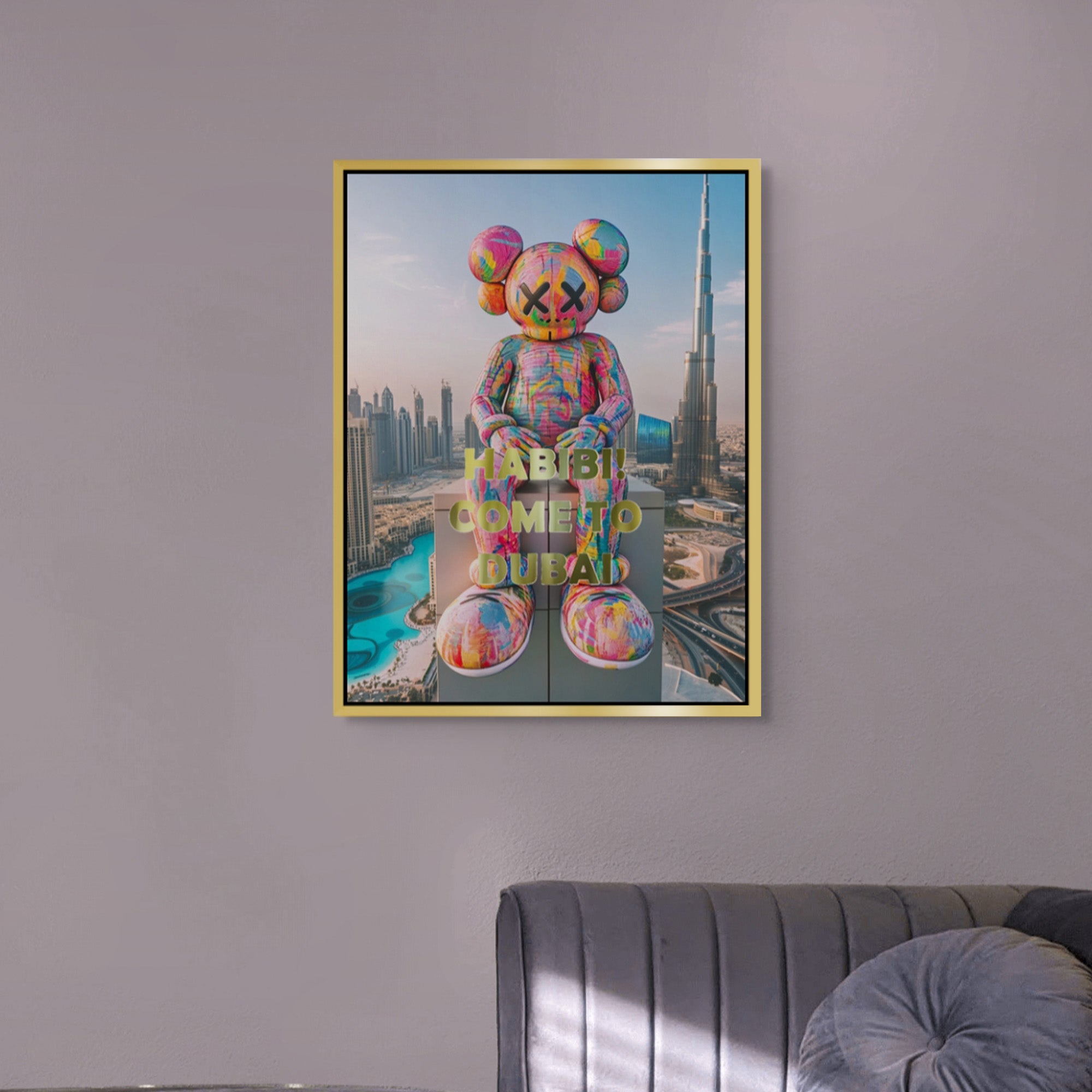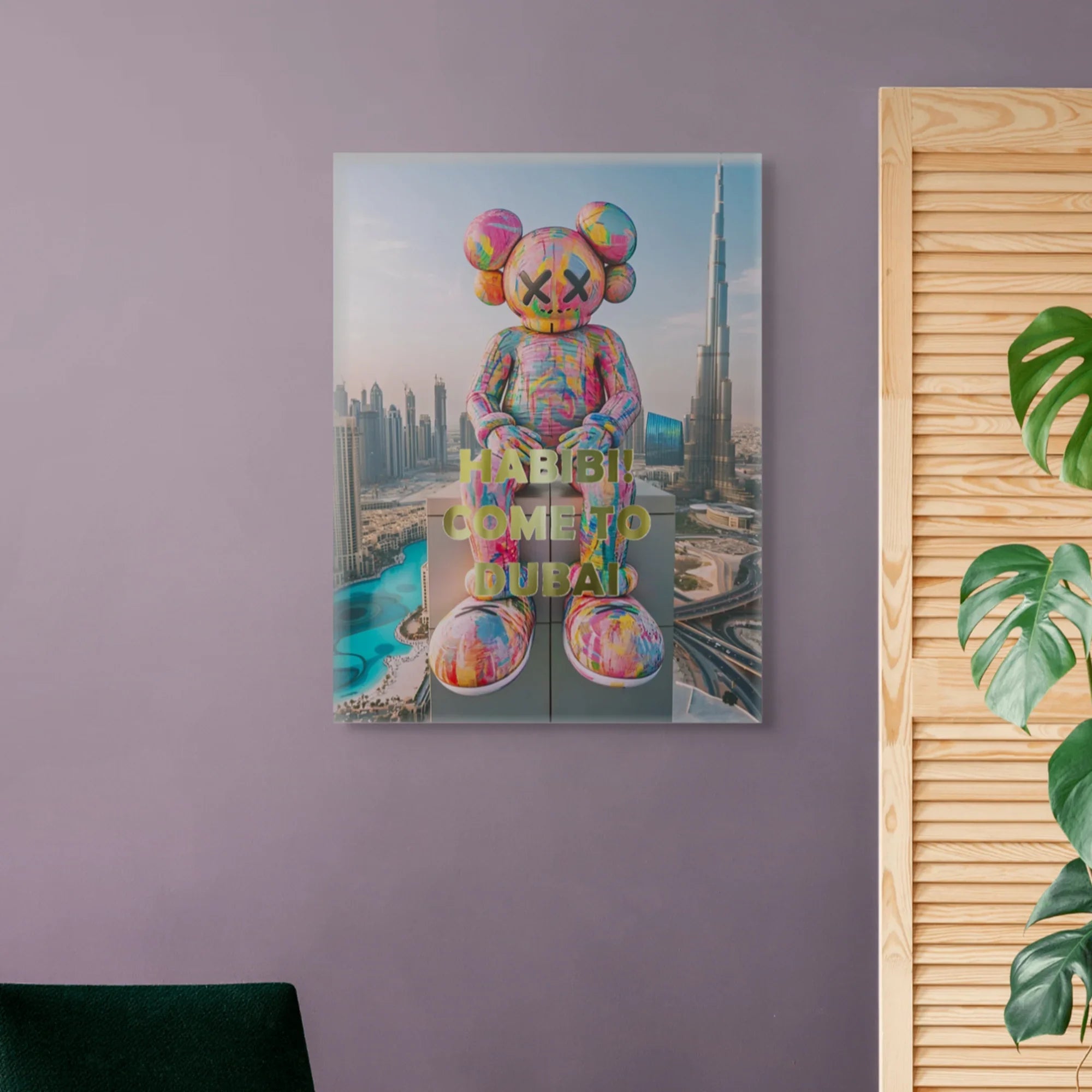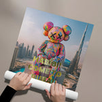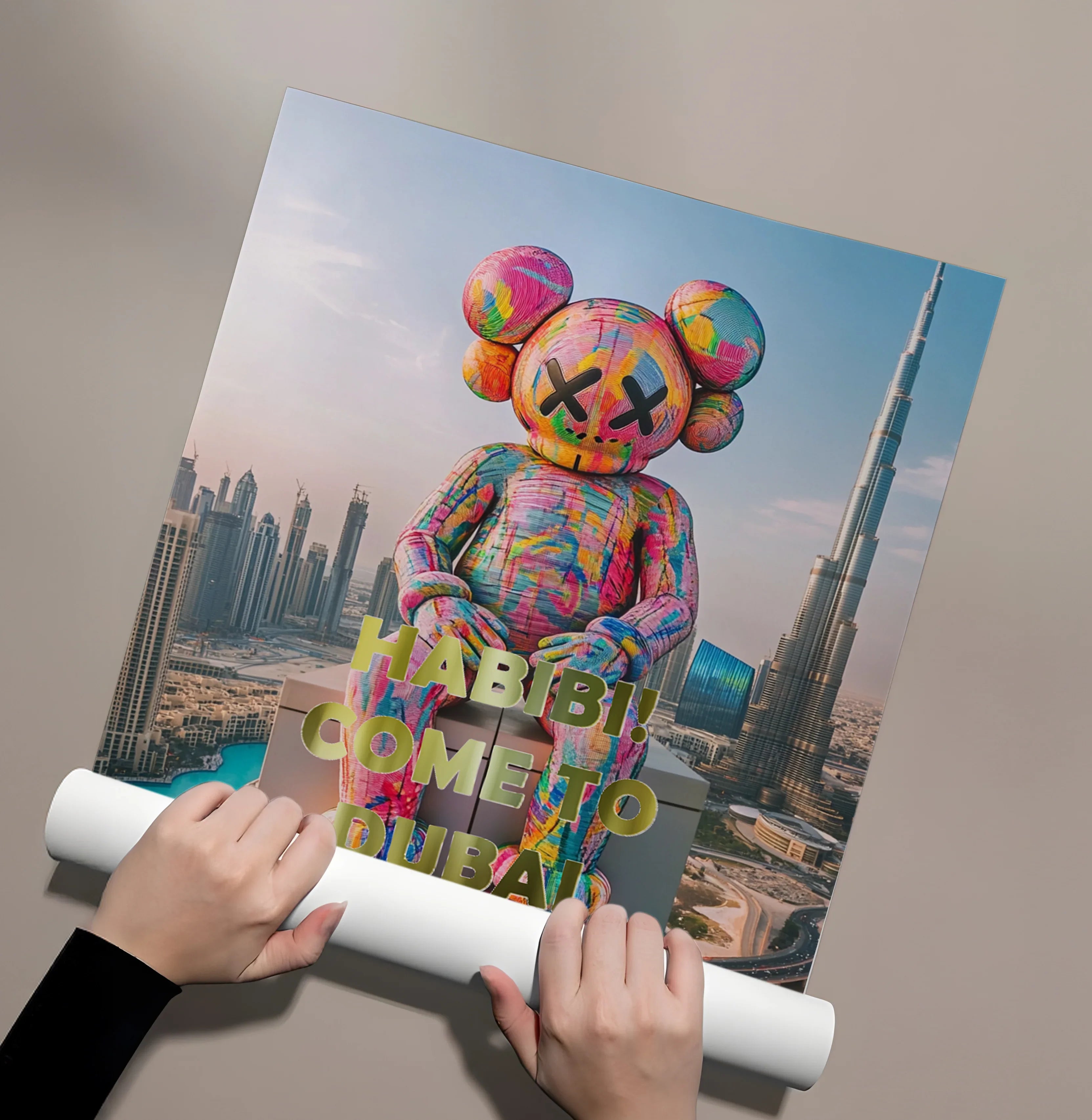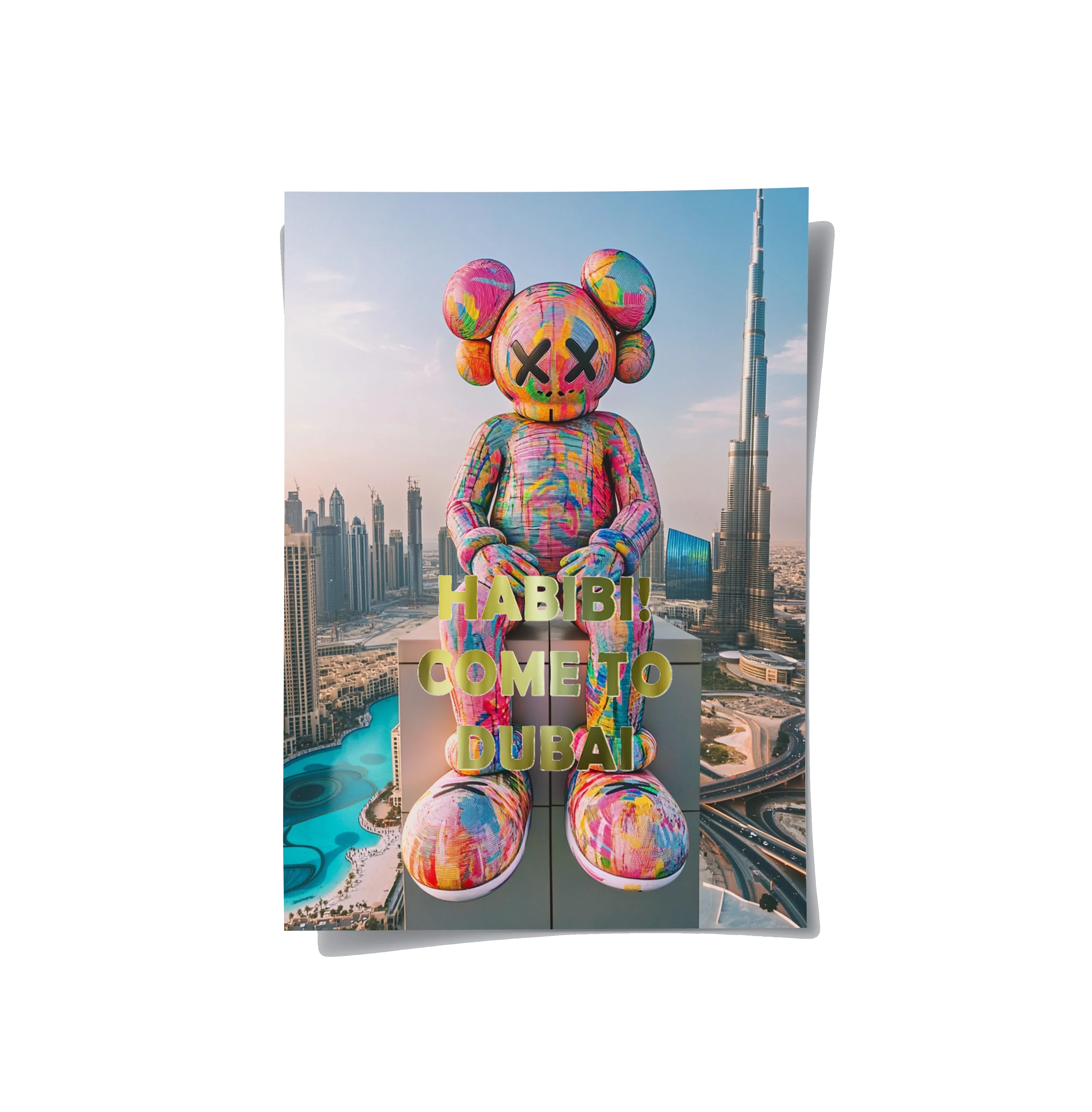 KAWS gets the VIP view, perched high above Dubai with Burj Khalifa in the backdrop. Bursting with multicolor energy and gold accents, this artwork is for collectors chasing skyline statements and bold, urban-inspired centerpiece moments.