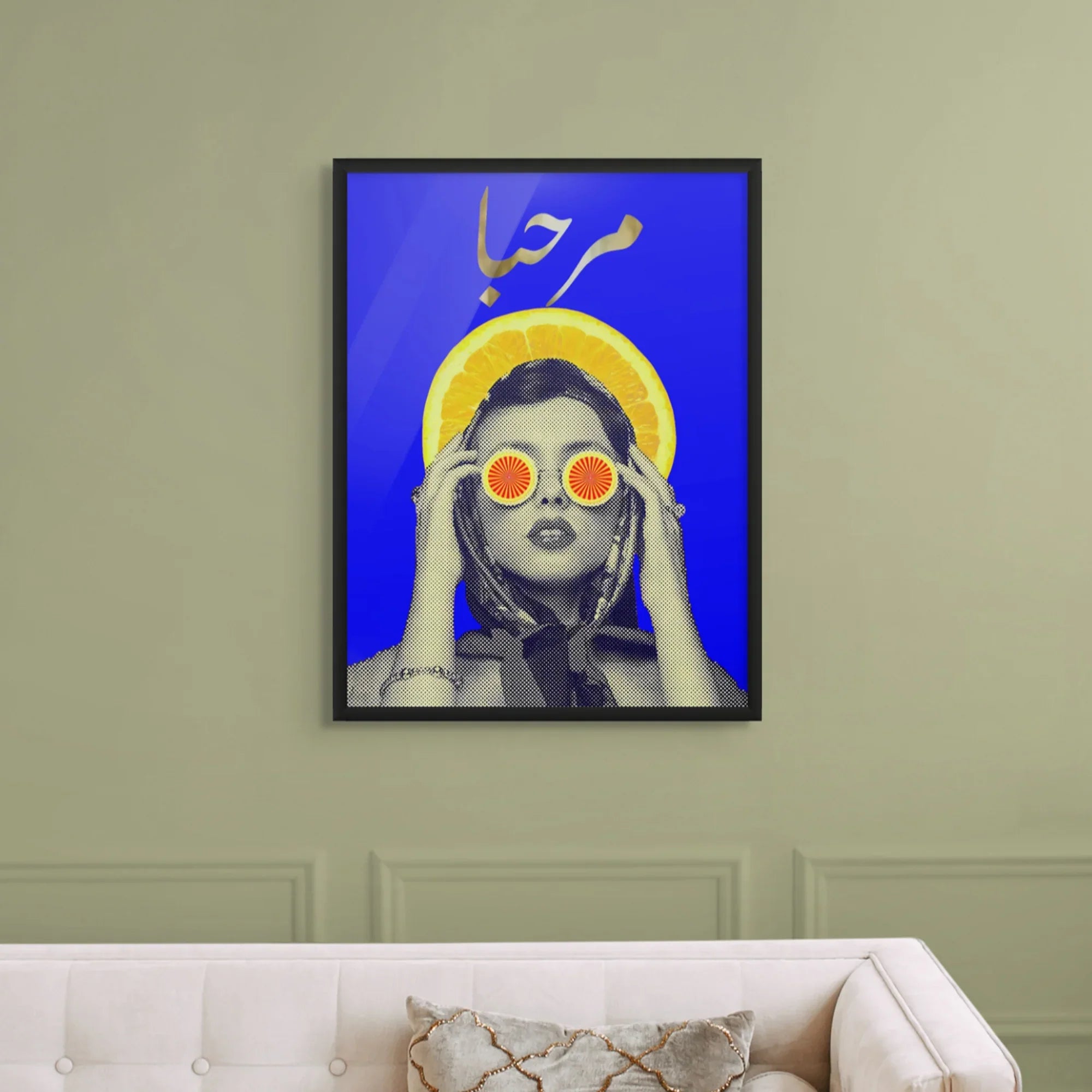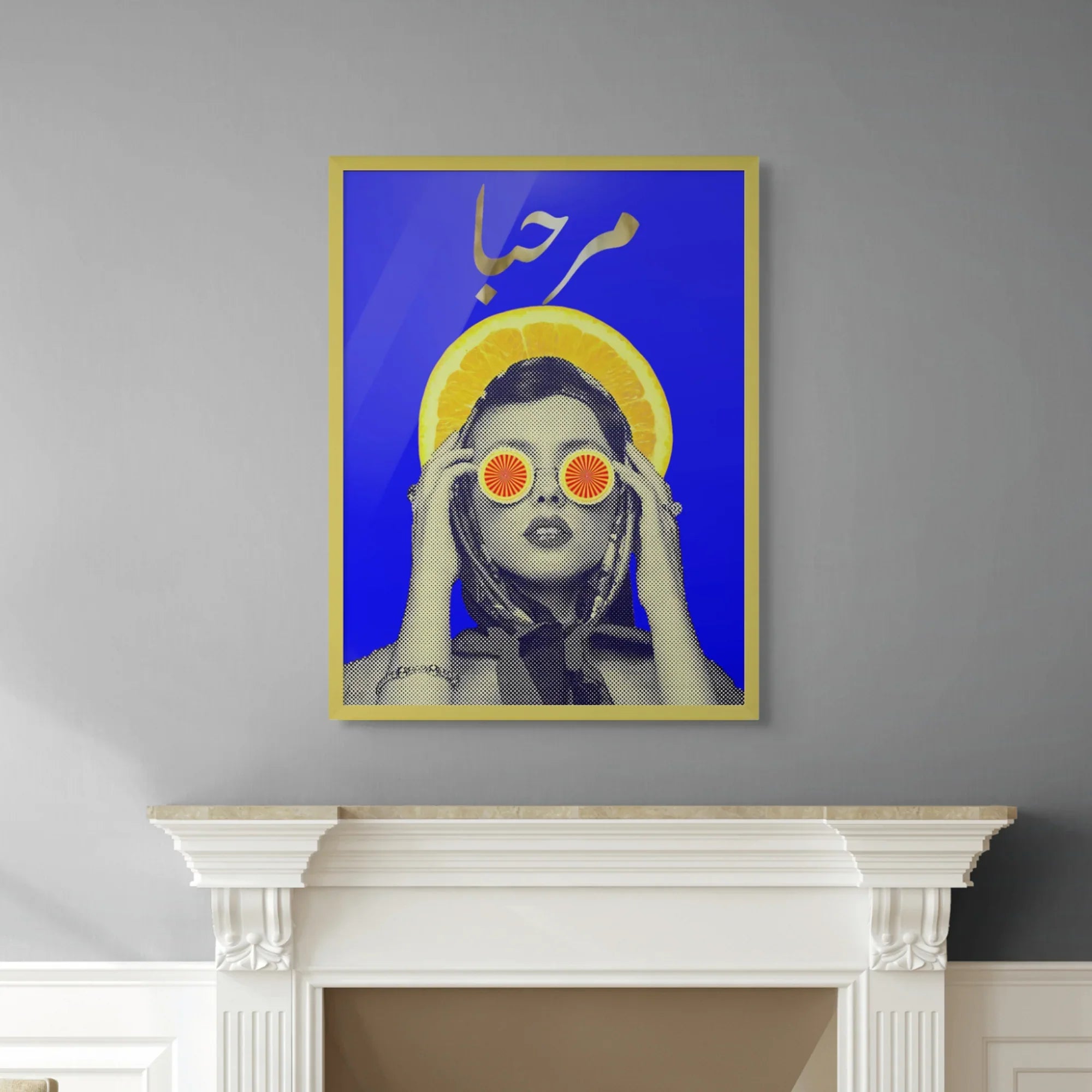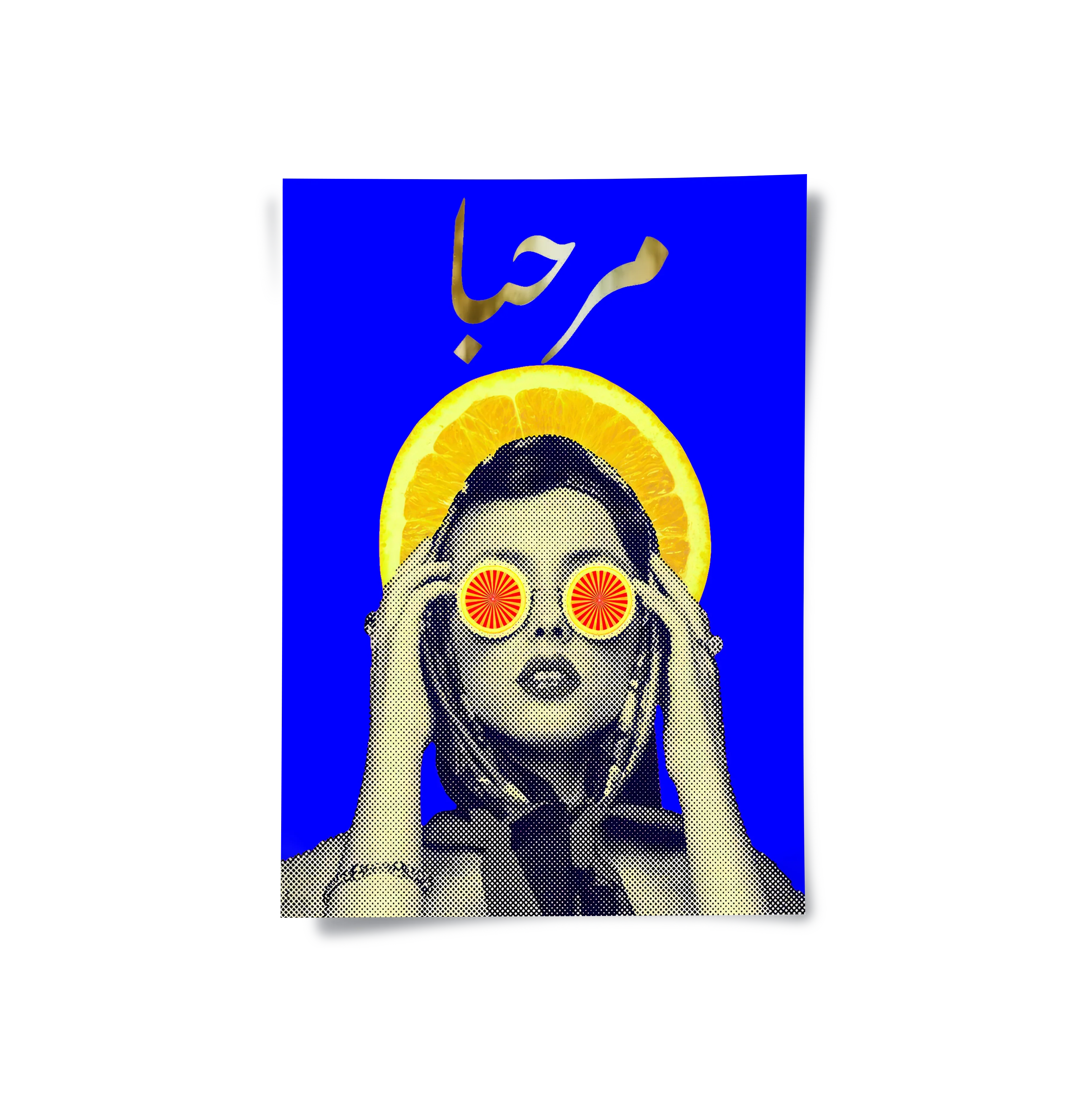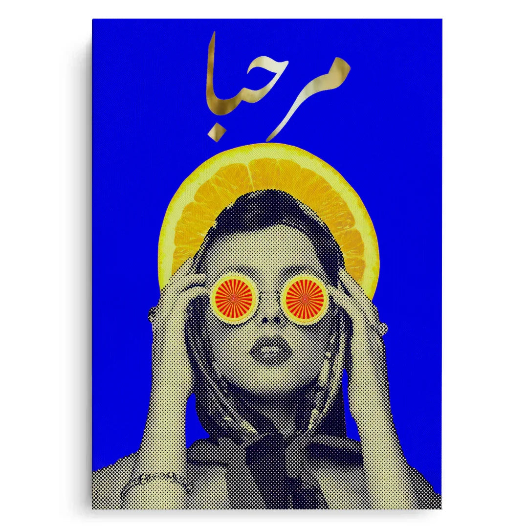 A bold, pop-inspired welcome to the region, this artwork features the Arabic word “Marhaba” (hello) with surreal citrus and retro tones. Finished with gold foiling, it’s ideal for creative spaces, lounges, or cultural corners with edge.