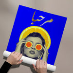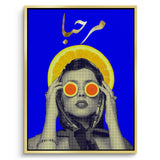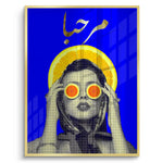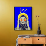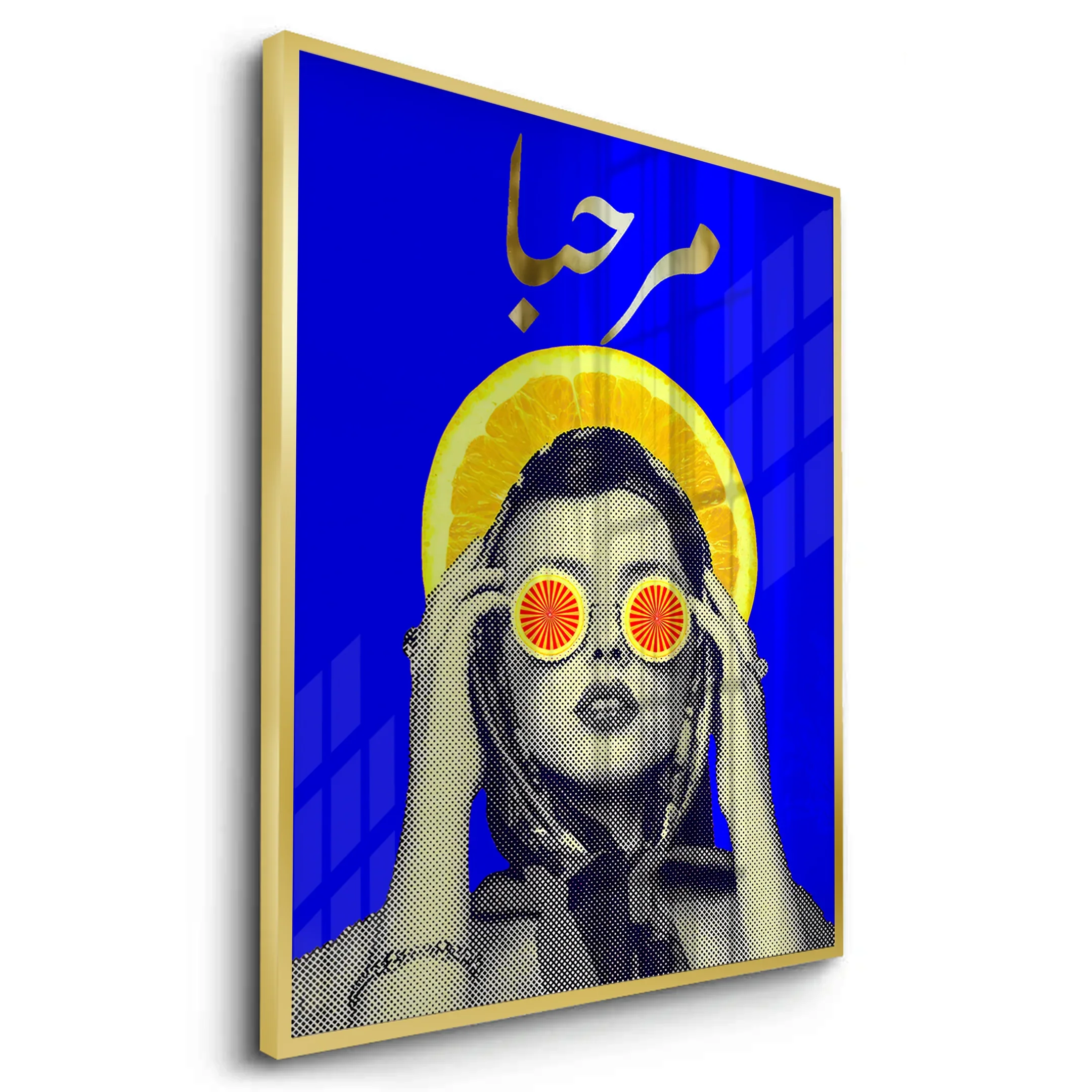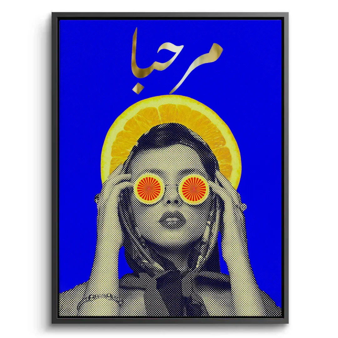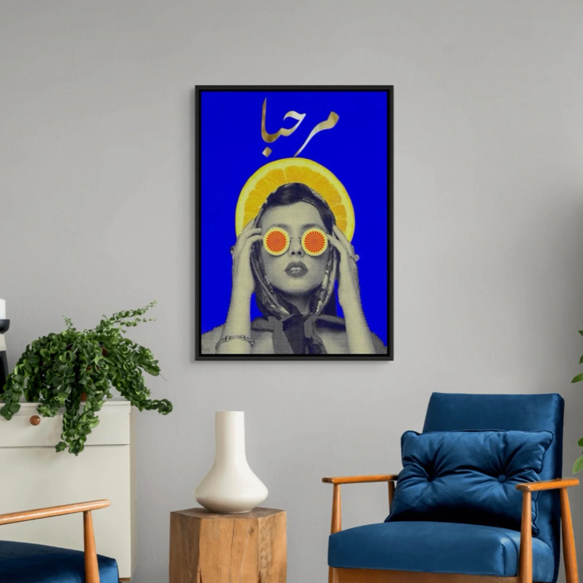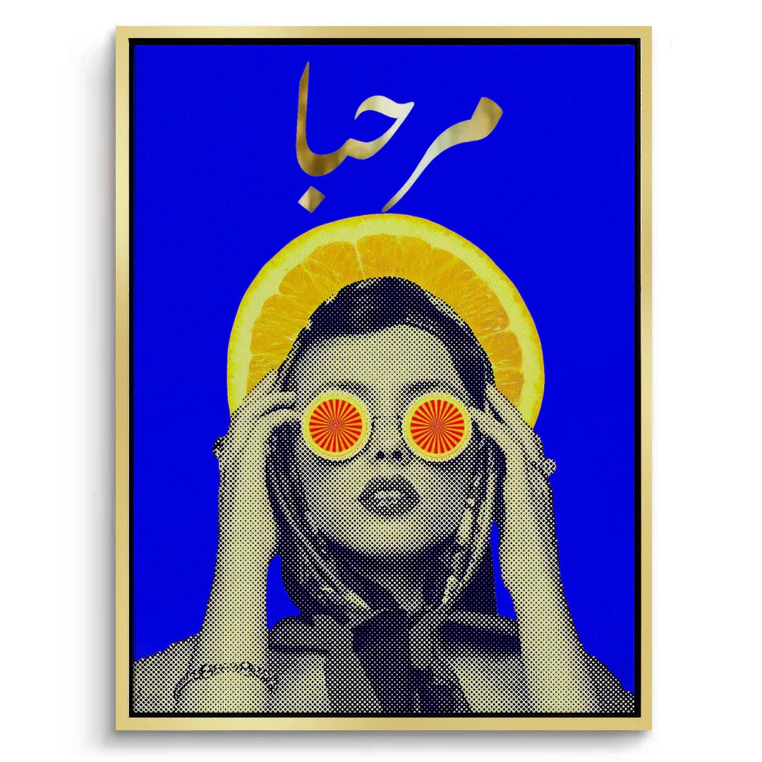 A bold, pop-inspired welcome to the region, this artwork features the Arabic word “Marhaba” (hello) with surreal citrus and retro tones. Finished with gold foiling, it’s ideal for creative spaces, lounges, or cultural corners with edge.
