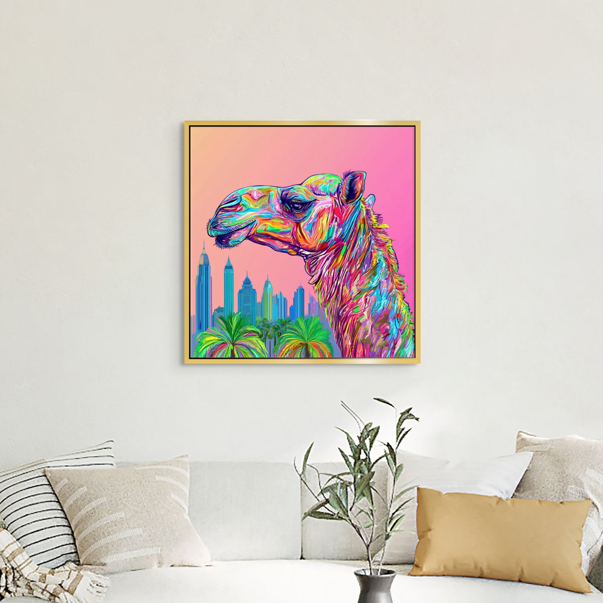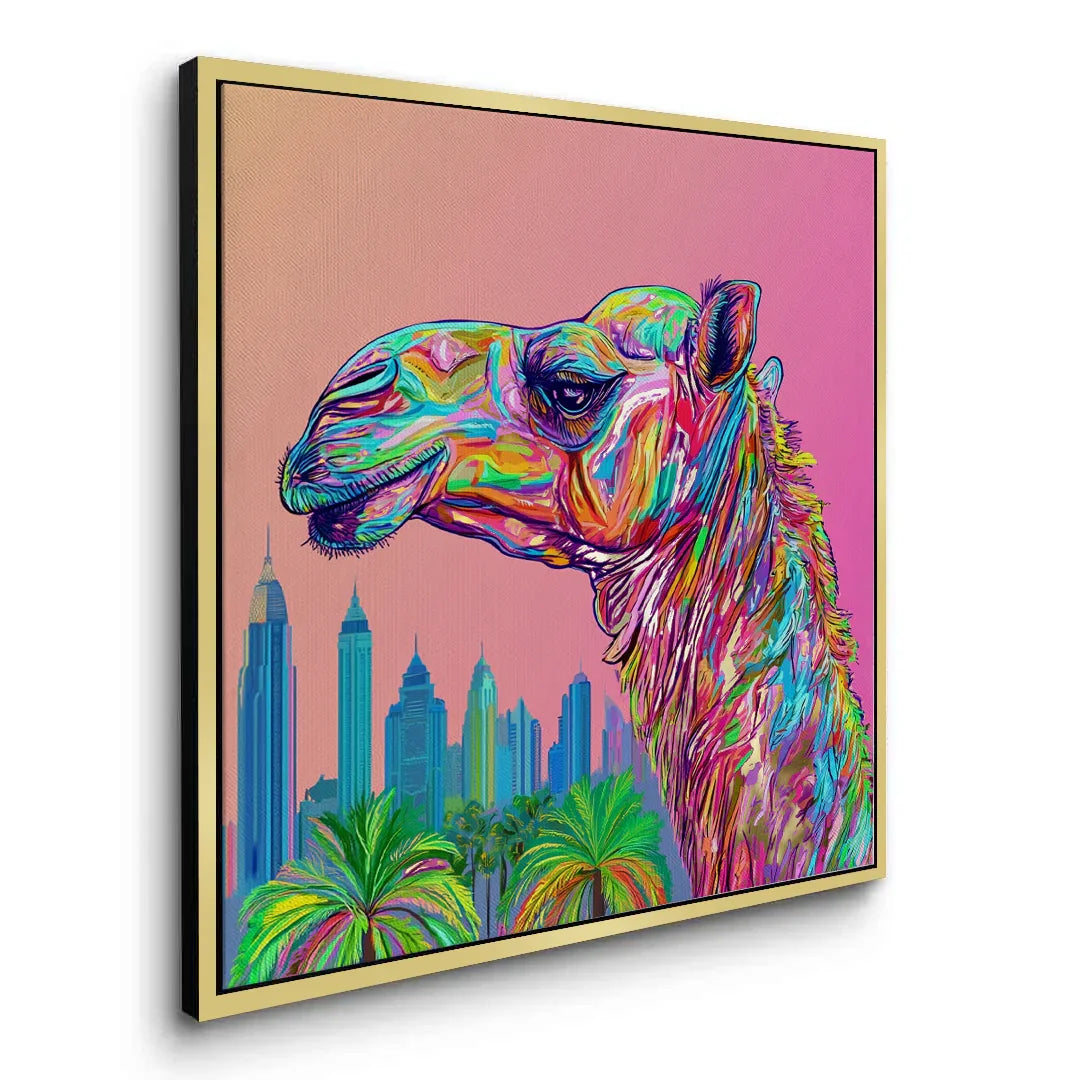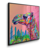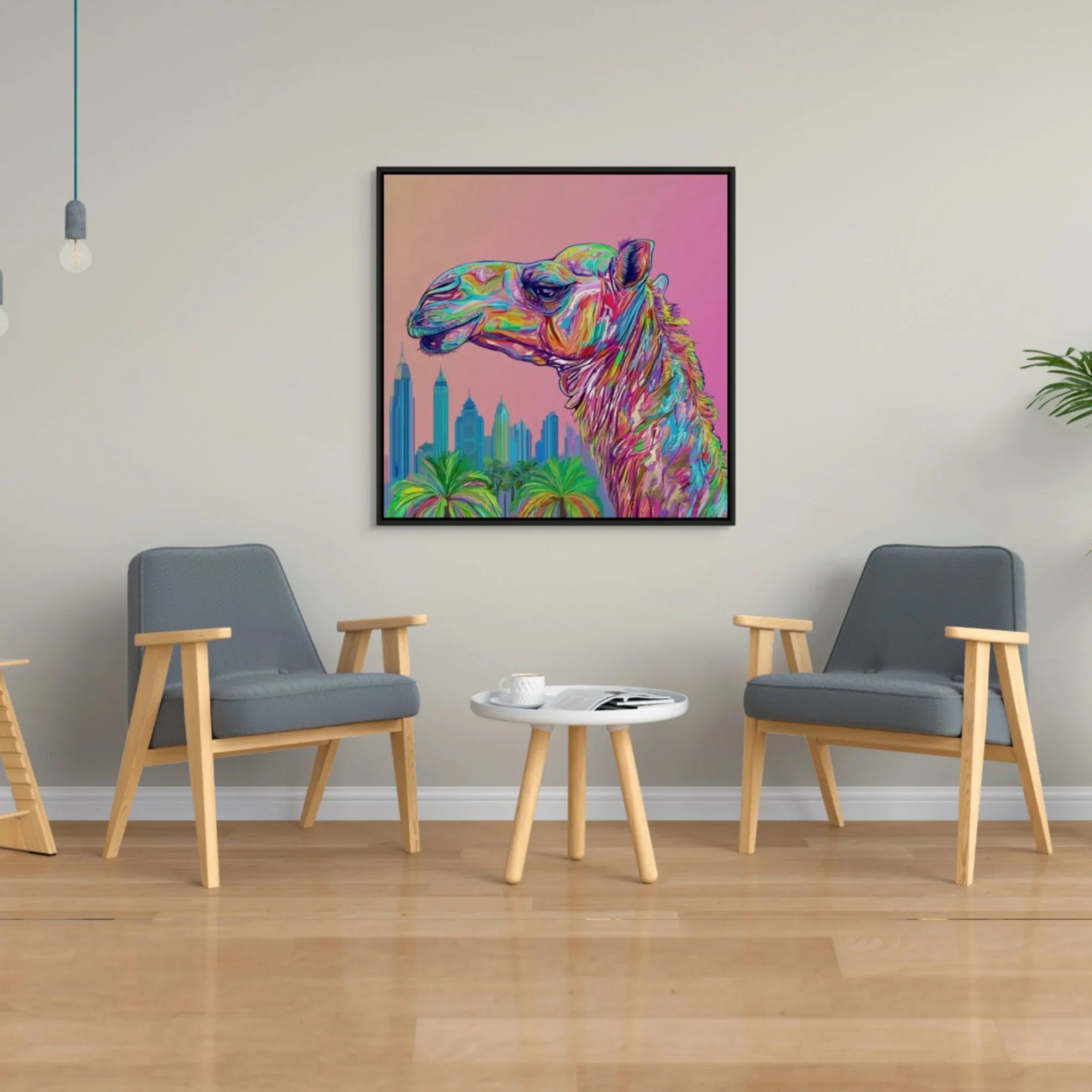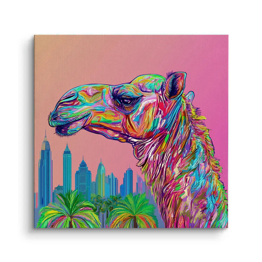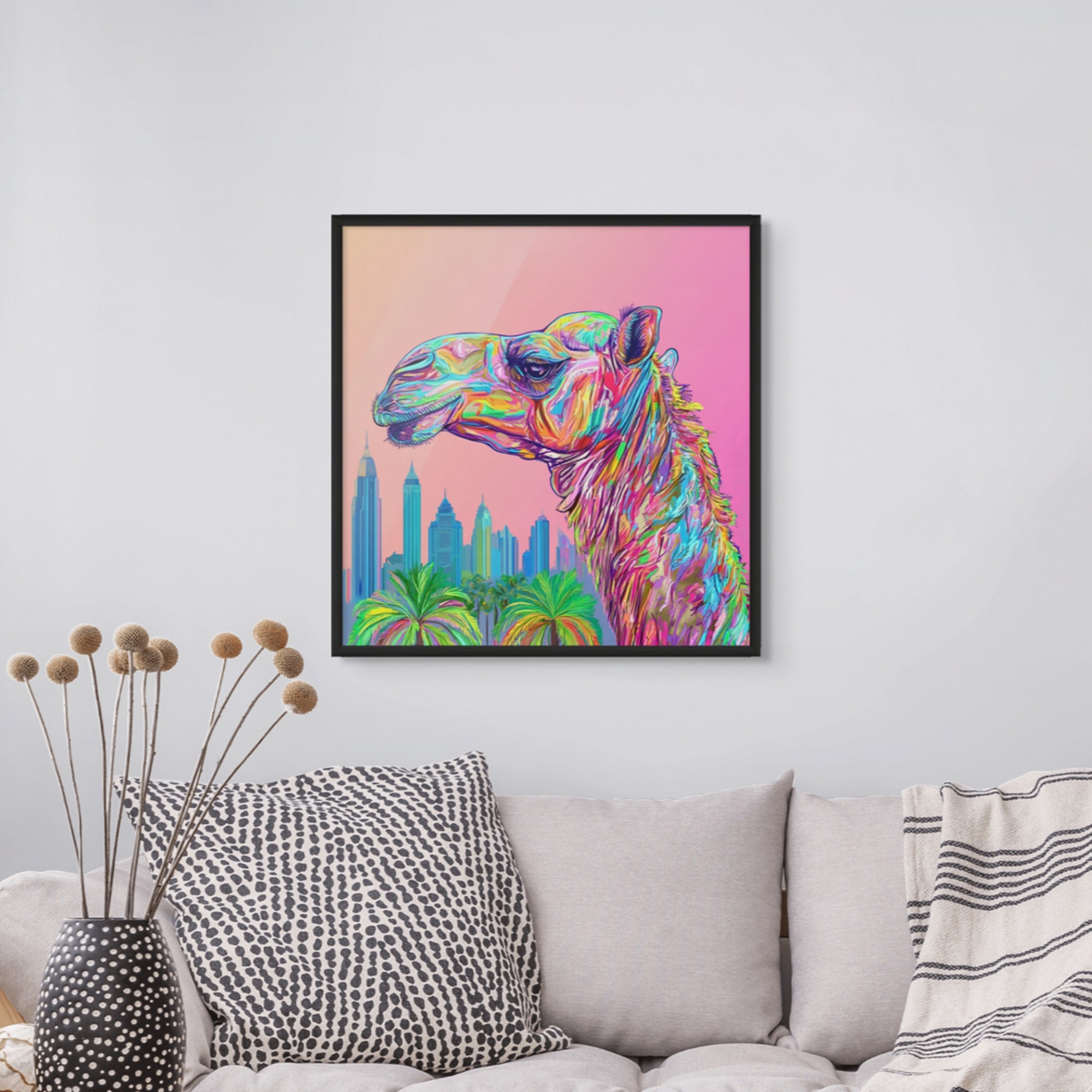 This vibrant pop-art piece reimagines the iconic camel in bold colours and surreal contrast against the Dubai skyline. Accented with gold foiling, it’s perfect for creative spaces, cultural lounges, or walls that reflect modern desert identity.br>