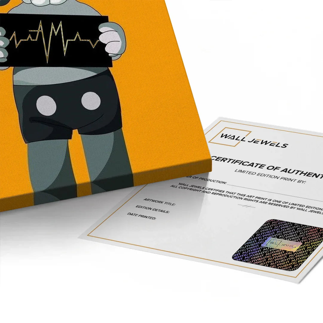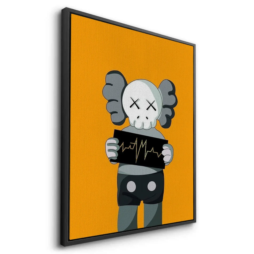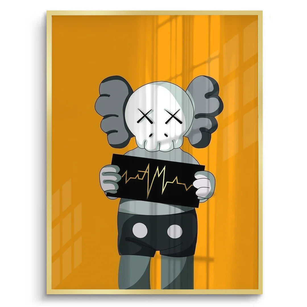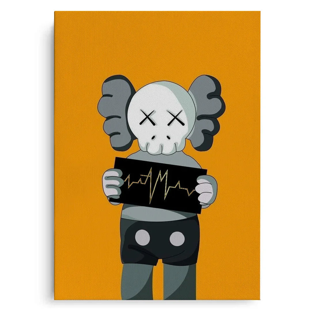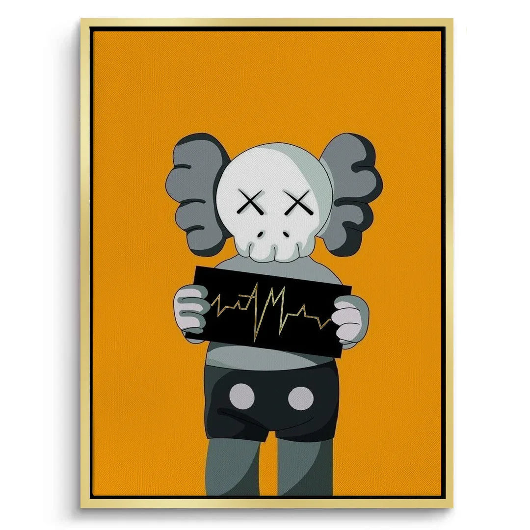 A bold KAWS-inspired figure holds up a heartbeat line—edgy, minimal, and laced with attitude. Perfect for modern studios, gamer dens, or pop-art walls. Graphic and punchy, with a hit of gold foiled sharpness and contrast.