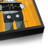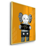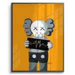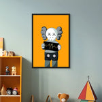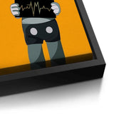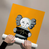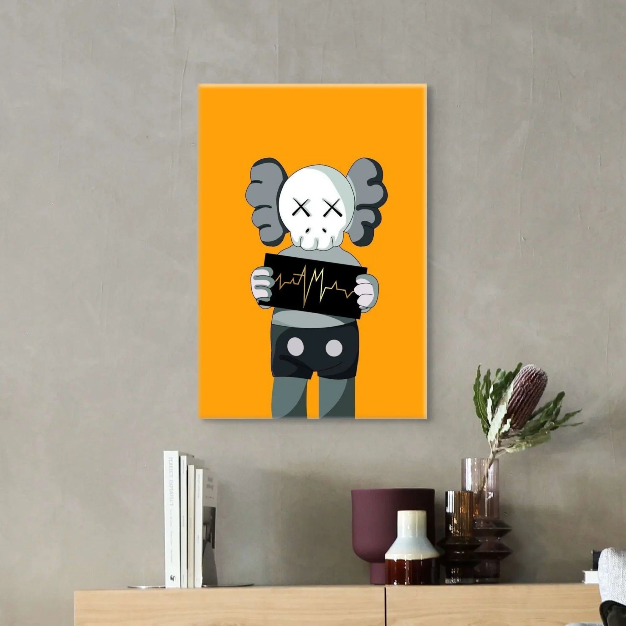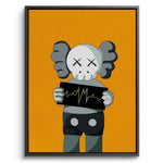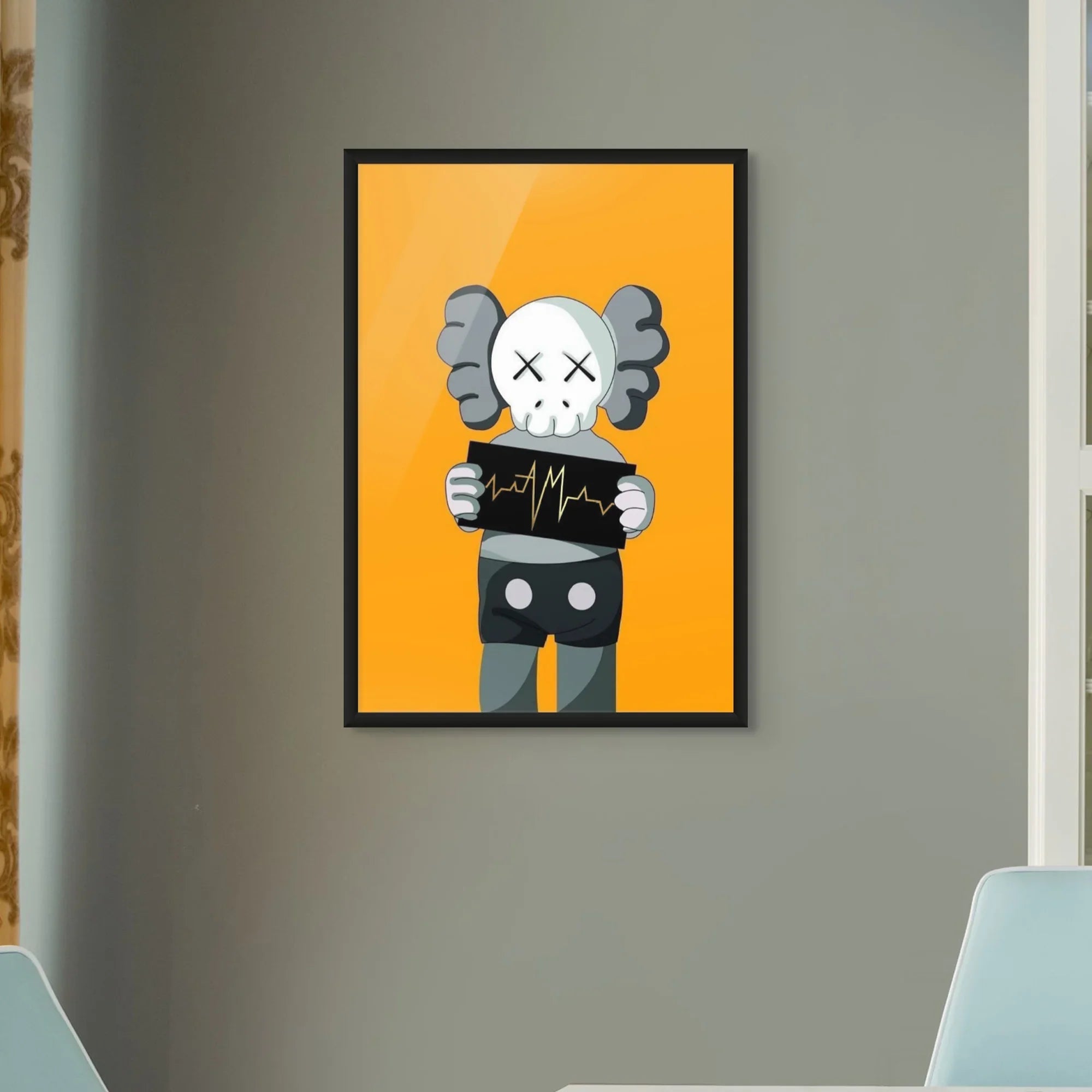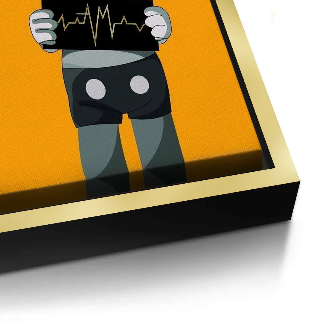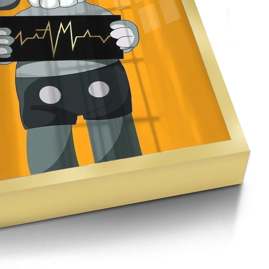 A bold KAWS-inspired figure holds up a heartbeat line—edgy, minimal, and laced with attitude. Perfect for modern studios, gamer dens, or pop-art walls. Graphic and punchy, with a hit of gold foiled sharpness and contrast.
