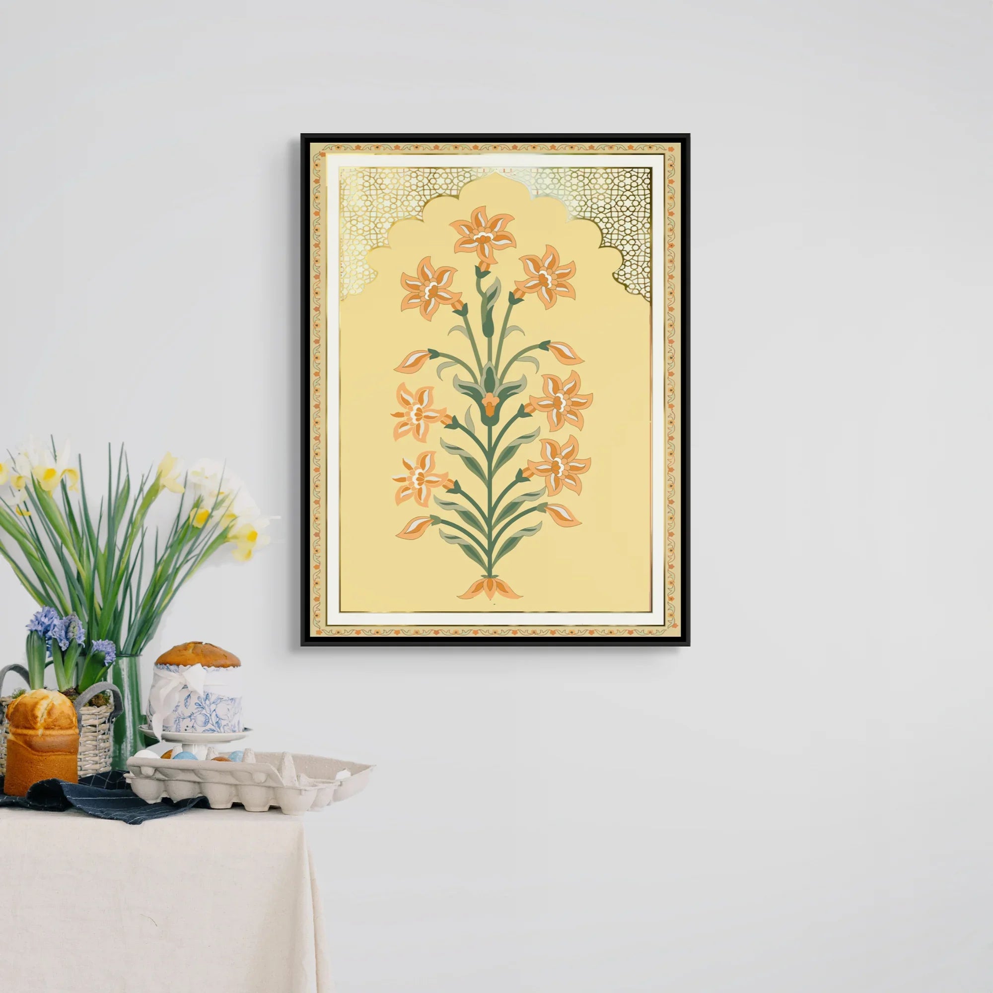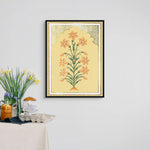 Inspired by the essence of saffron, Kesariya features gold foiled detailing and a graceful lily-like bloom glowing in rich yellow-orange tones. A warm, heritage piece ideal for bedrooms, reading corners, entryways, or thoughtfully styled living spaces.