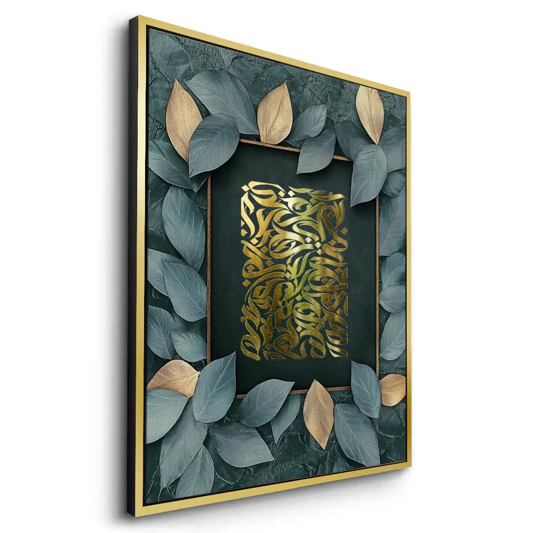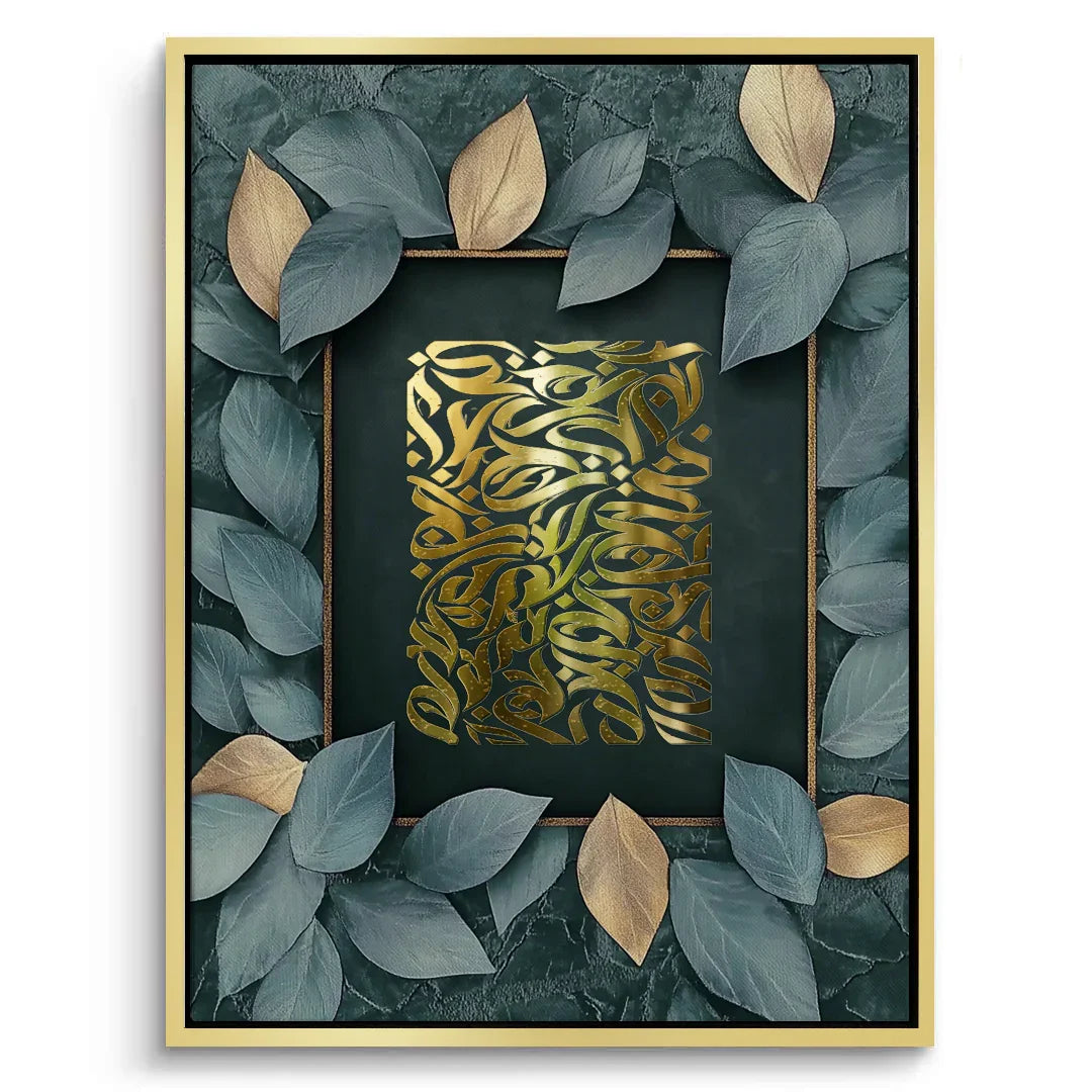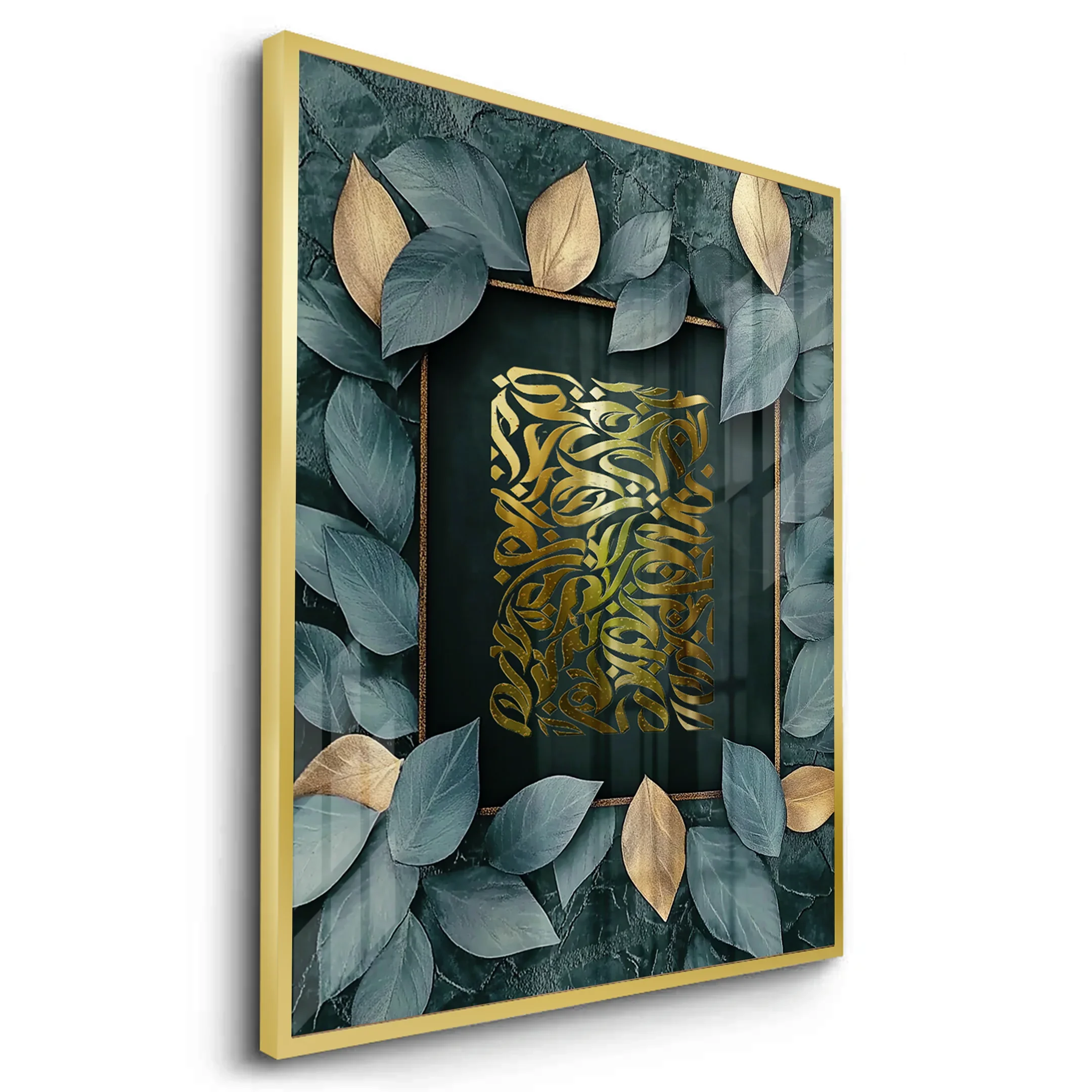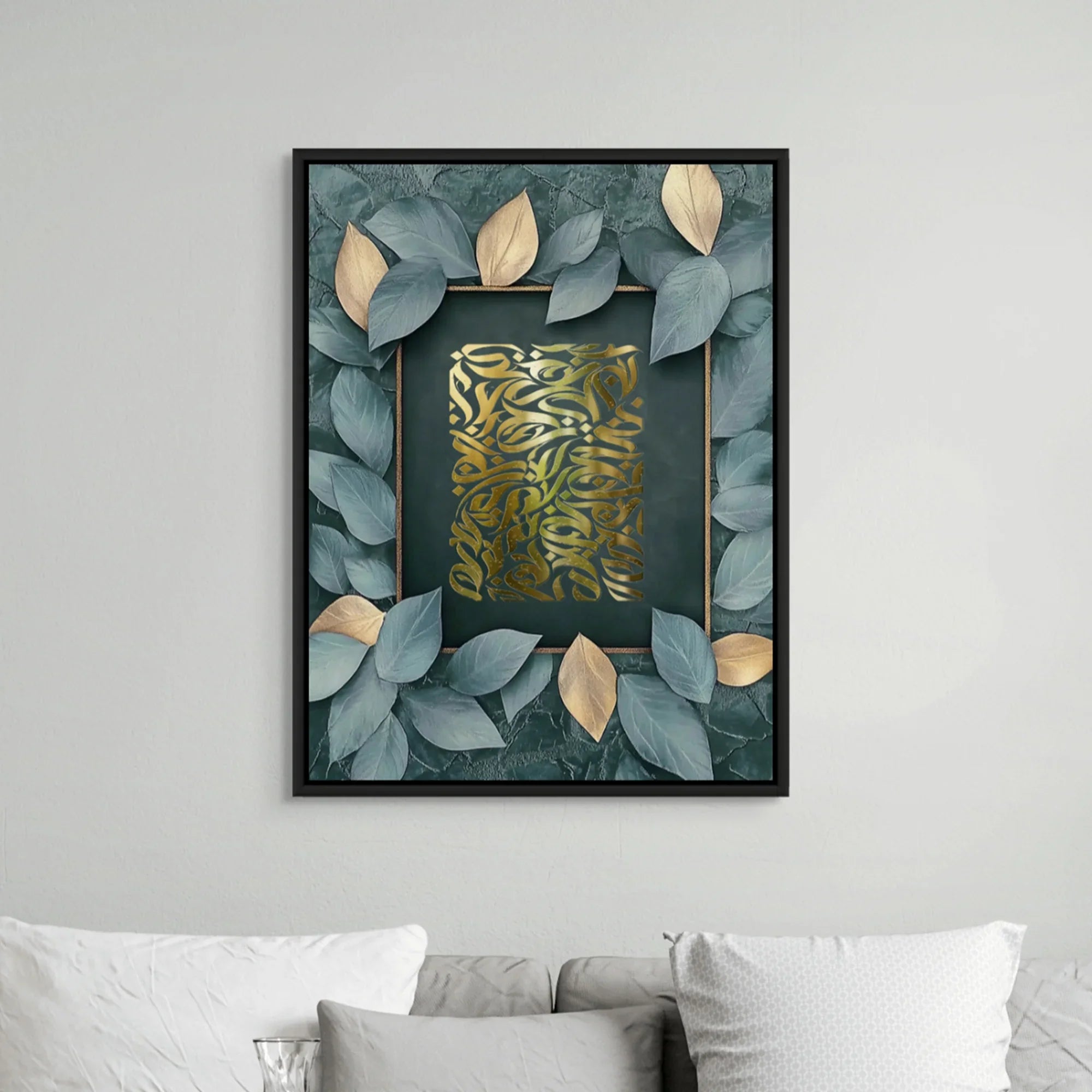 A lush composition where bold Arabic calligraphy in foiled gold is framed by textured sage greens and rich botanical forms. The interplay of elegance and nature adds poetic depth, ideal for modern foyers, offices, or hallways.