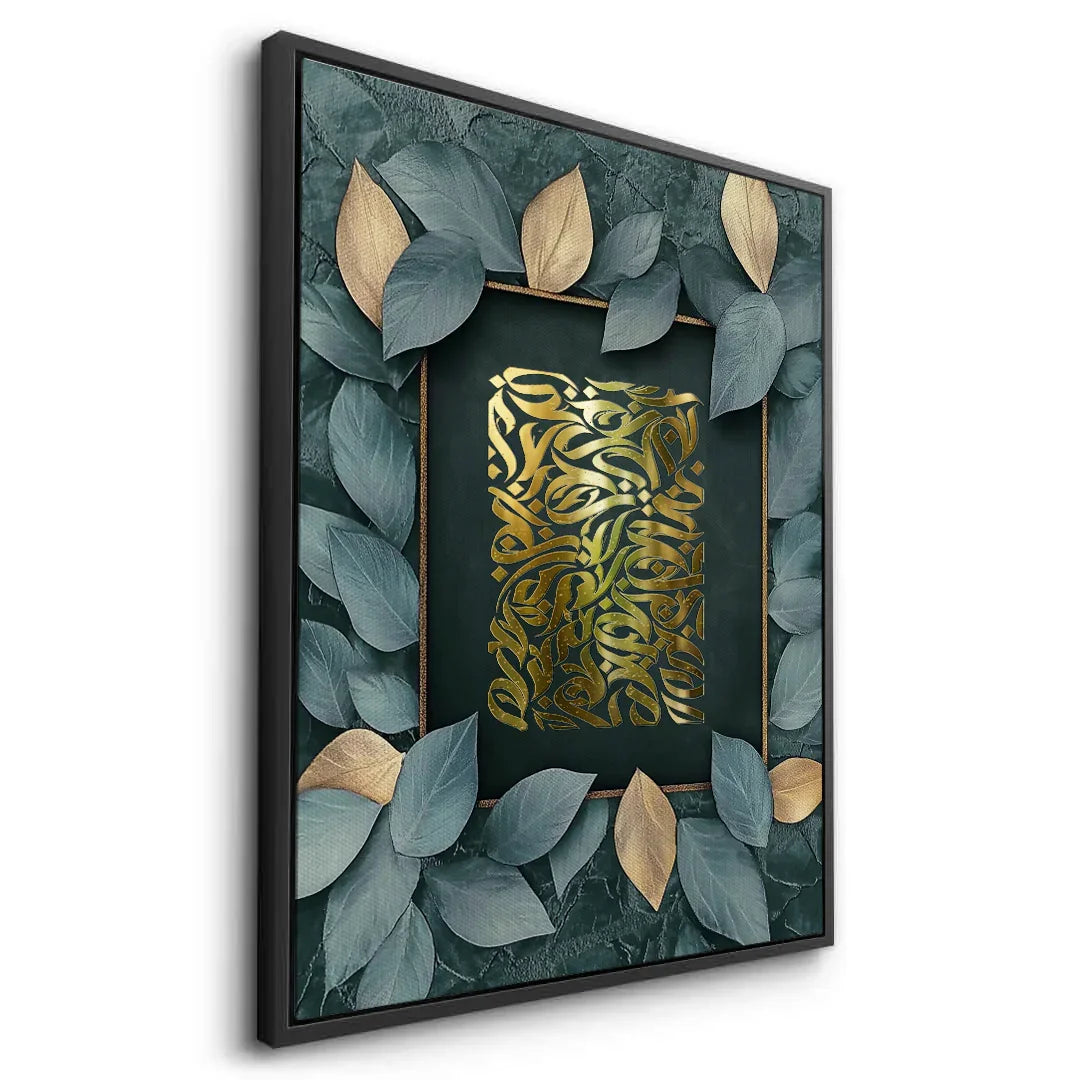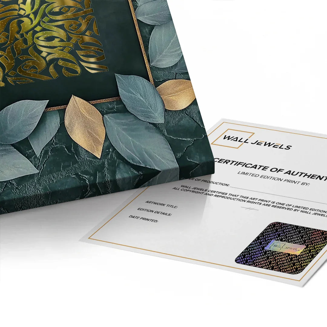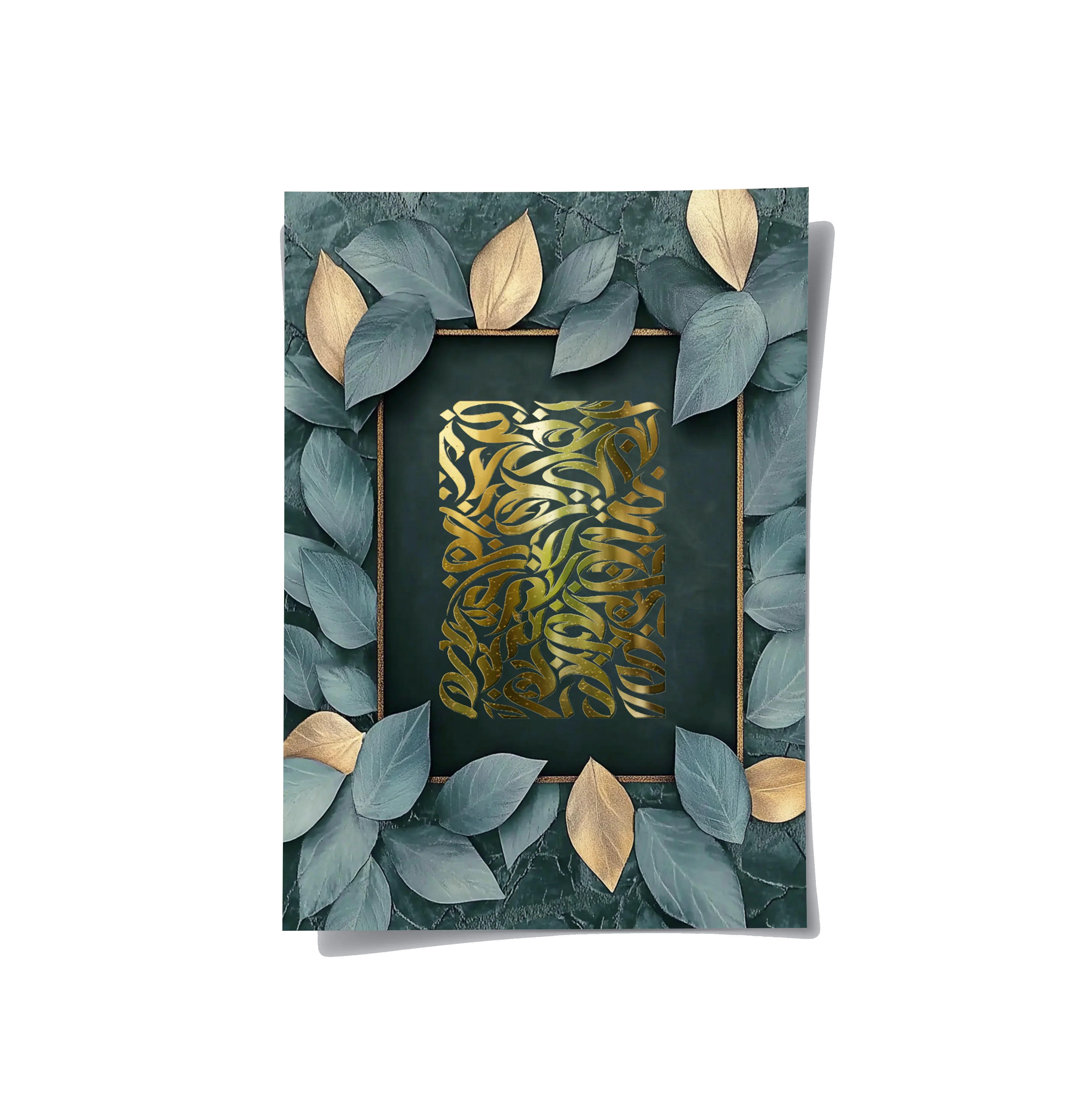 A lush composition where bold Arabic calligraphy in foiled gold is framed by textured sage greens and rich botanical forms. The interplay of elegance and nature adds poetic depth, ideal for modern foyers, offices, or hallways.