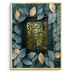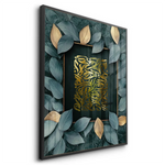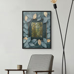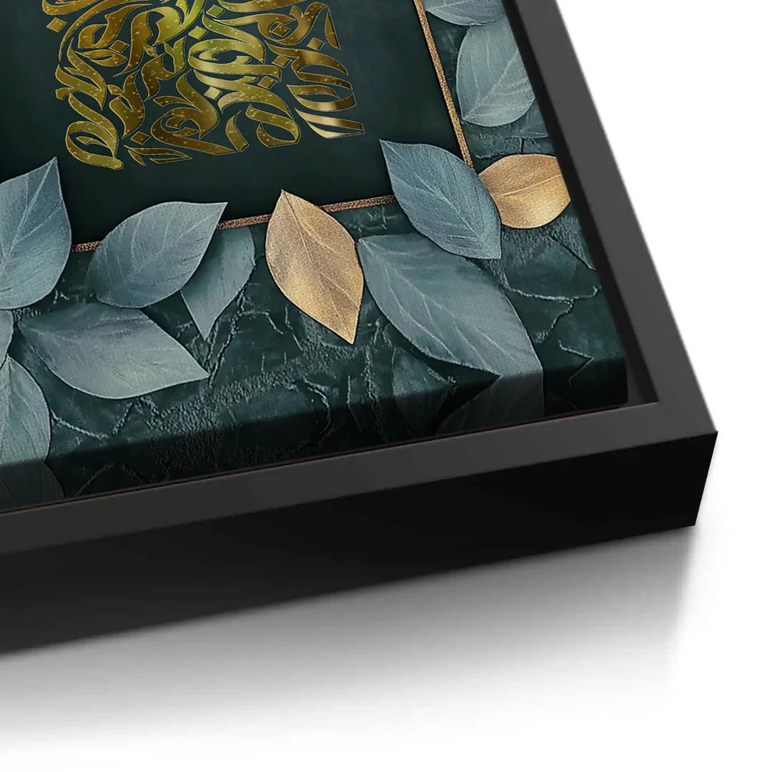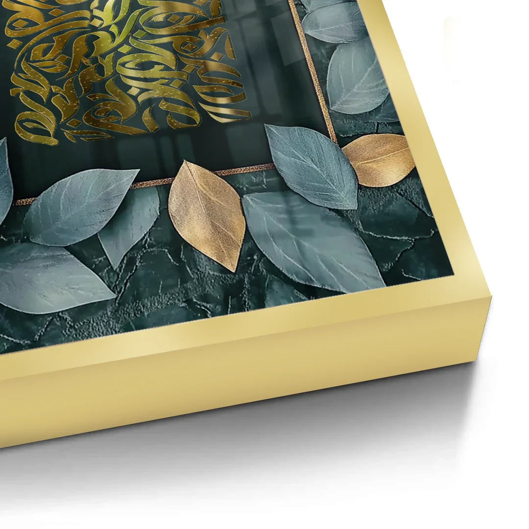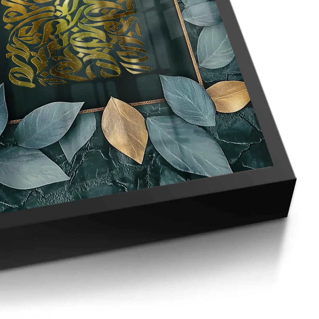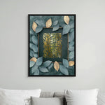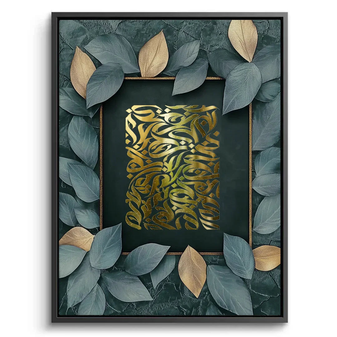 A lush composition where bold Arabic calligraphy in foiled gold is framed by textured sage greens and rich botanical forms. The interplay of elegance and nature adds poetic depth, ideal for modern foyers, offices, or hallways.
