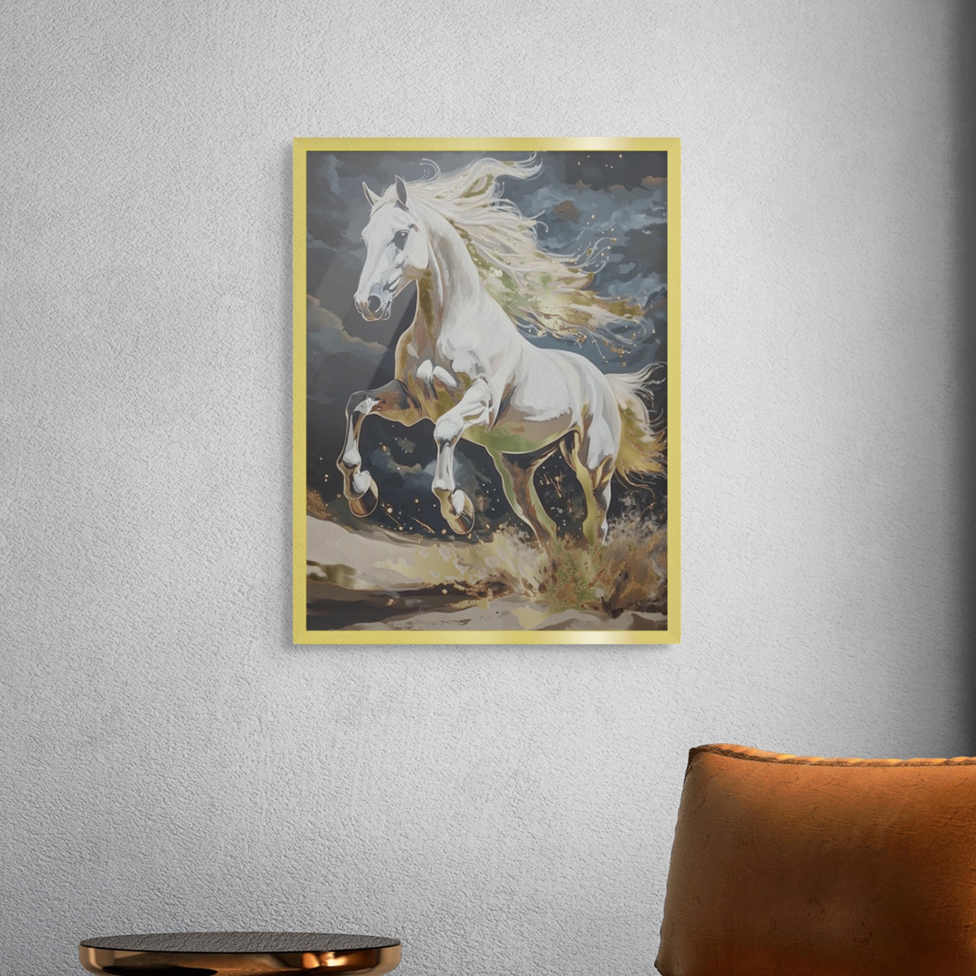 A majestic white stallion charges through a stormy backdrop, its mane ignited with bold gold accents. This powerful artwork commands attention in living rooms, hallways, or offices, adding motion, strength, and drama to your space.