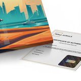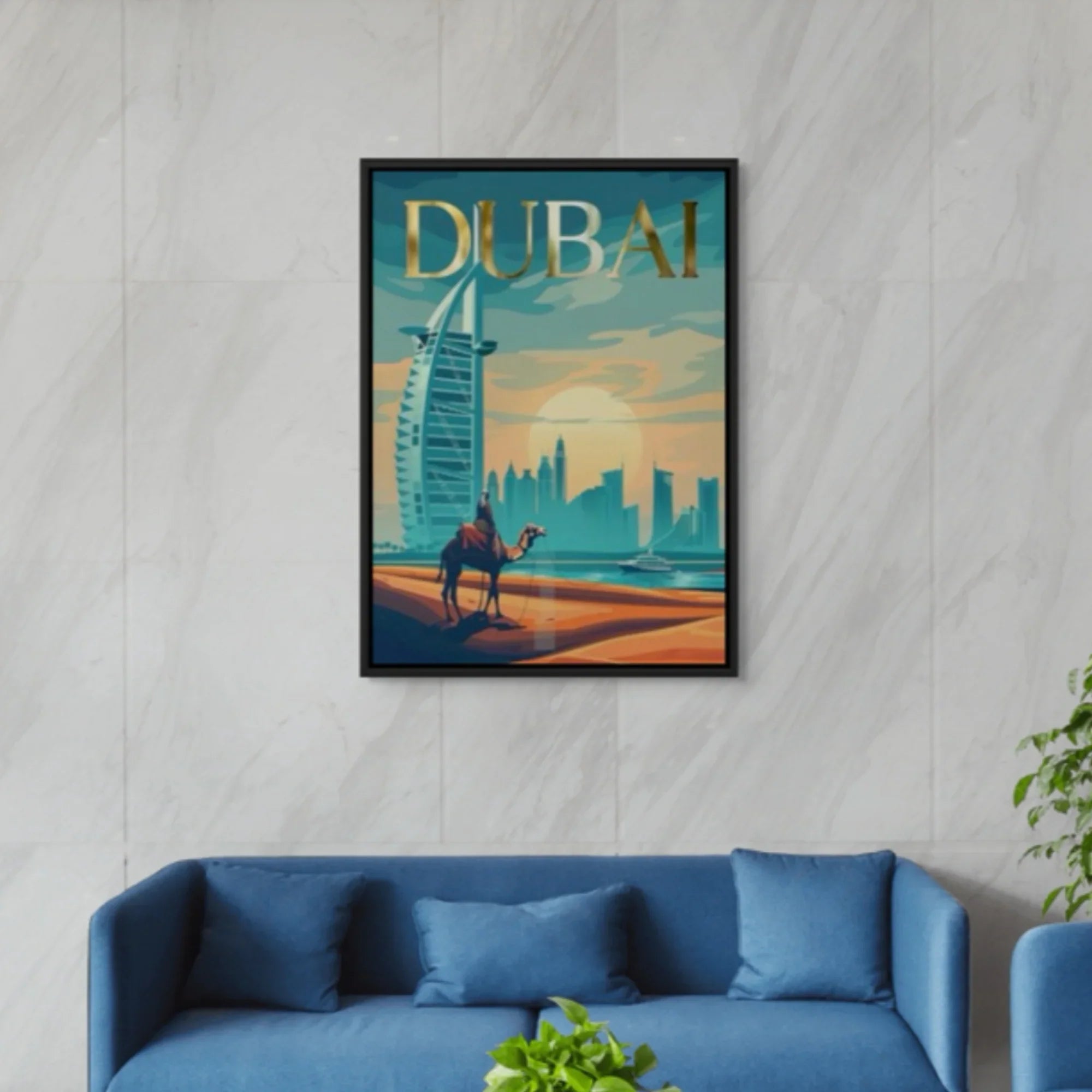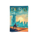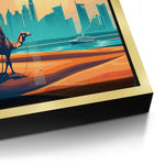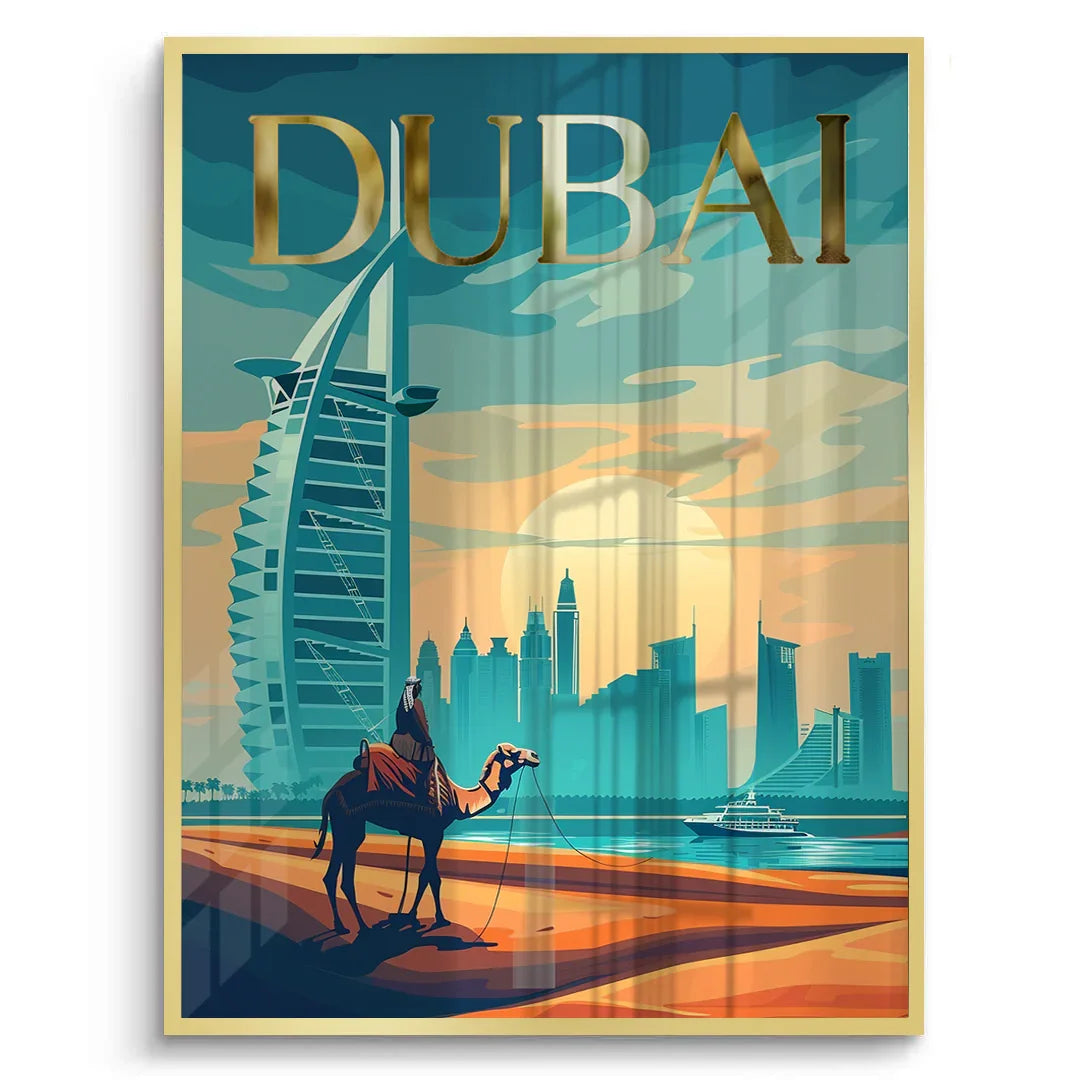 A desert nomad journeys through golden sands toward Dubai’s skyline, with the Burj Al Arab rising in view. Enhanced with gold foiling, this artwork suits interiors that celebrate heritage, movement, and modern Emirati ambition.