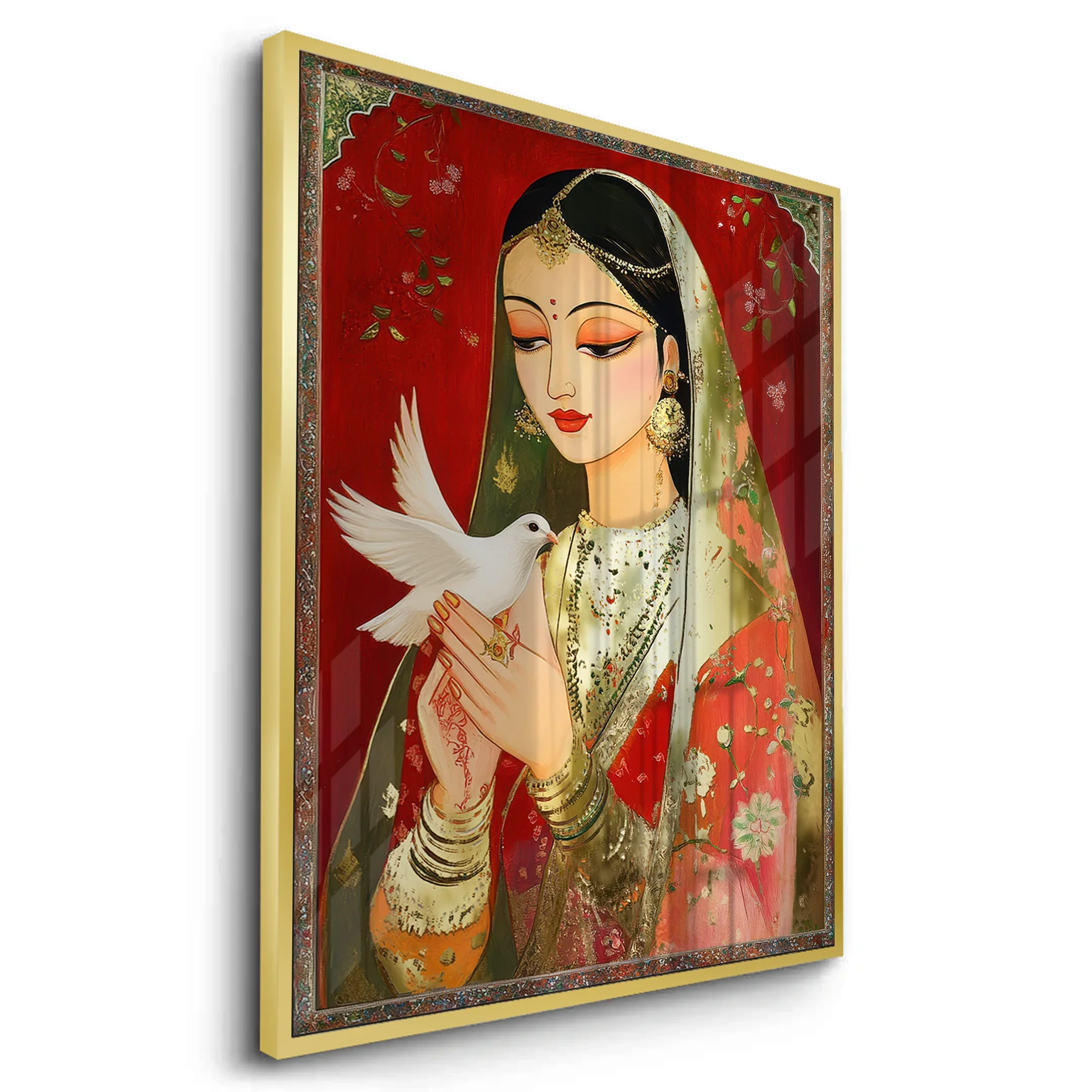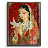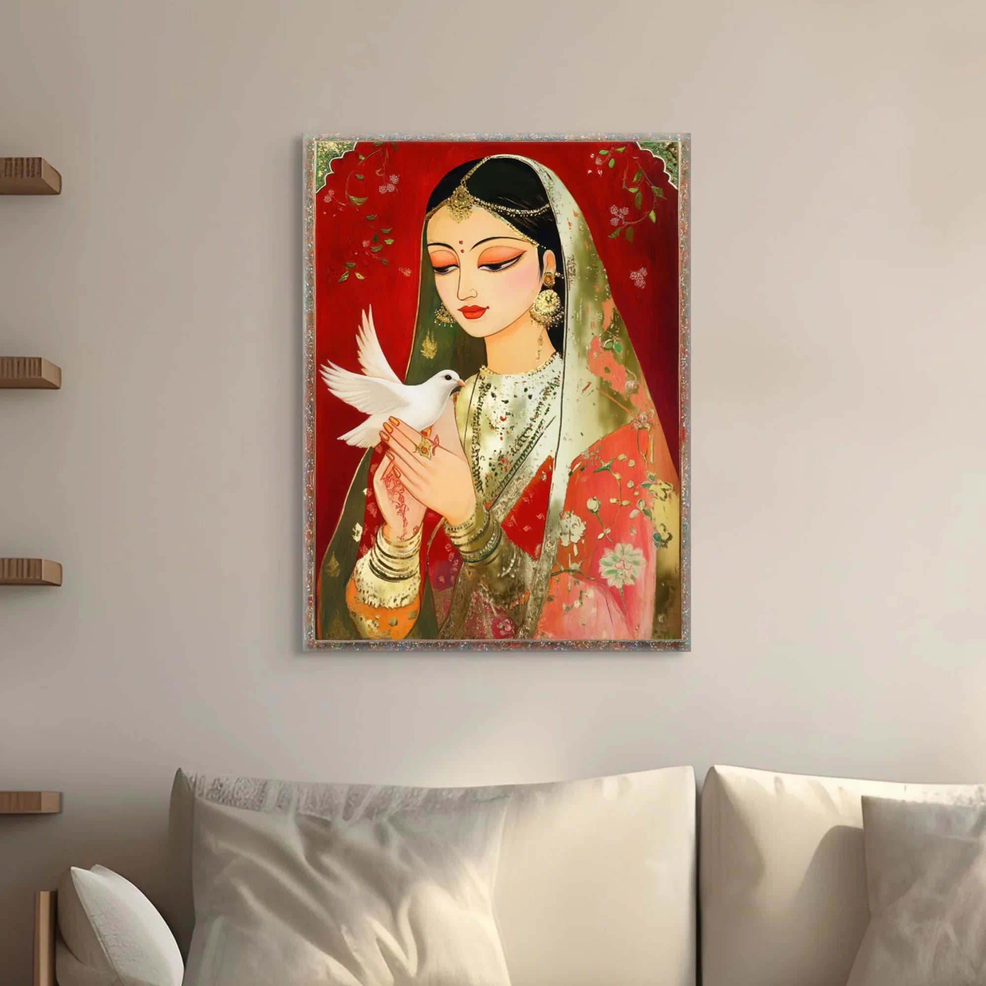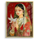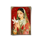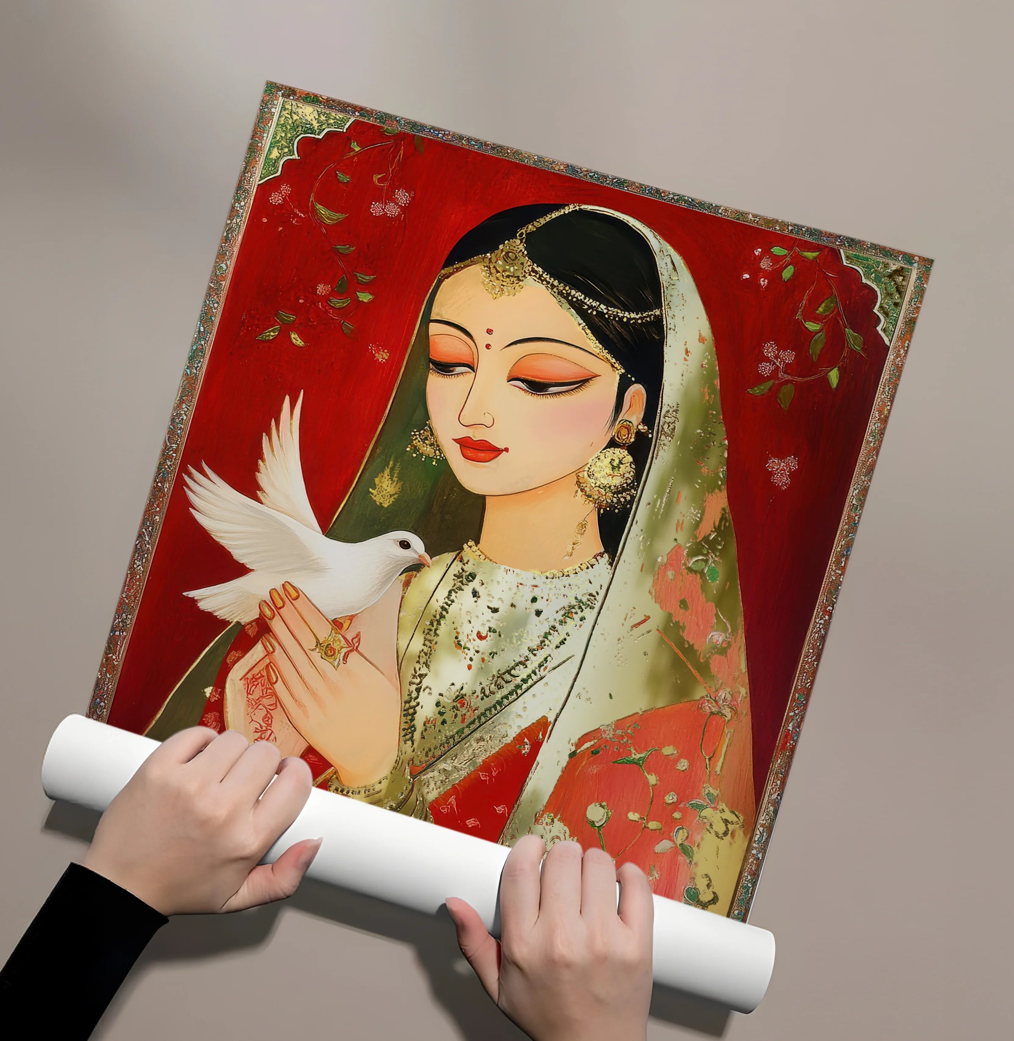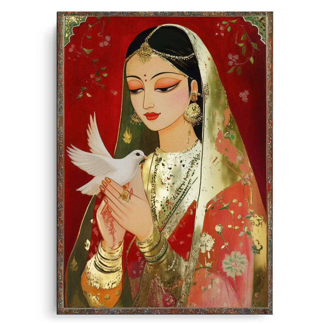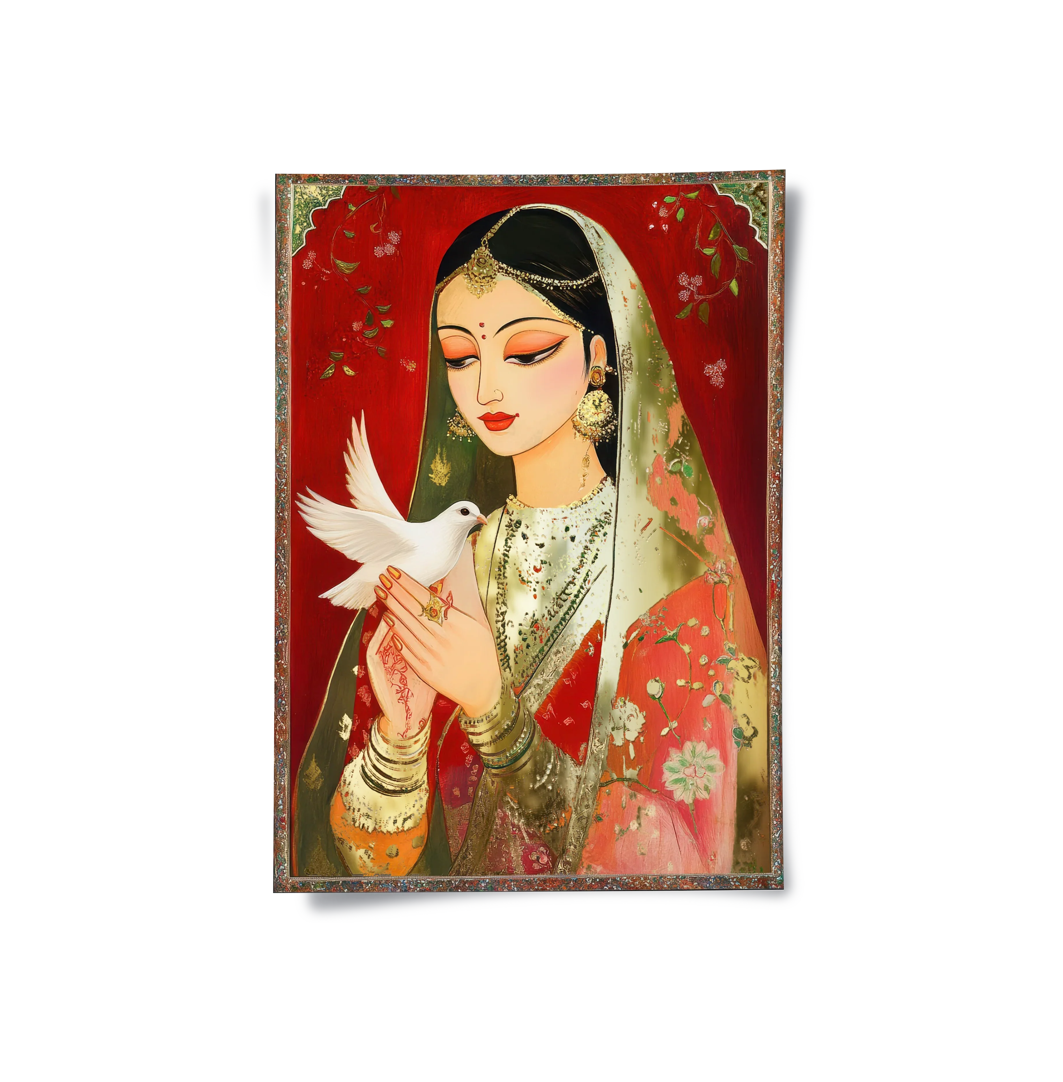 Adorned in regal red and gold foiled detailing, Rajrani embodies timeless grace and quiet strength. A poised queen with a dove in hand, she brings heritage warmth to living rooms, entryways, reading corners, or softly lit hallways.