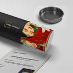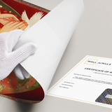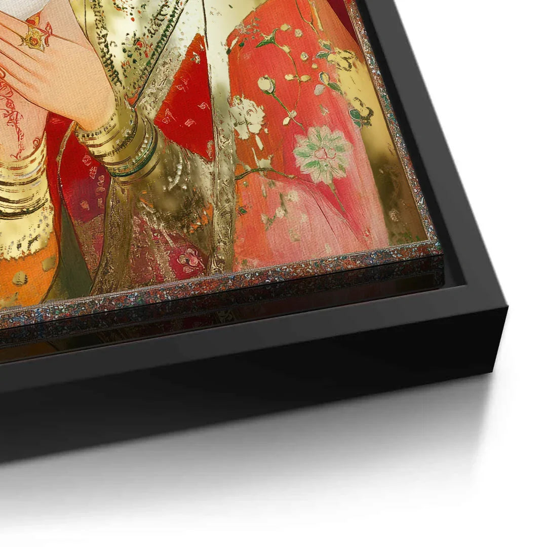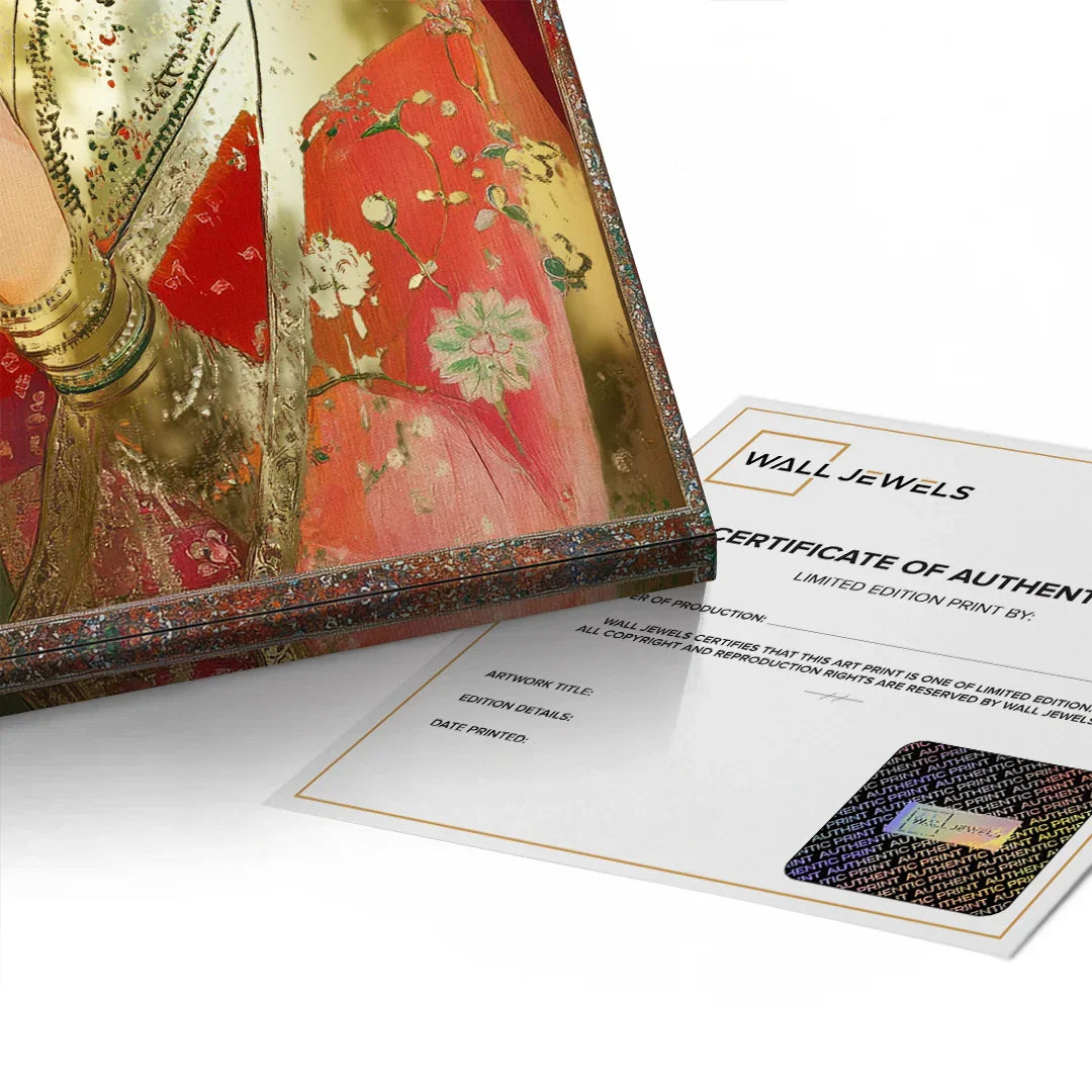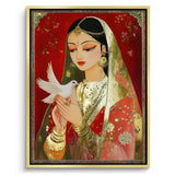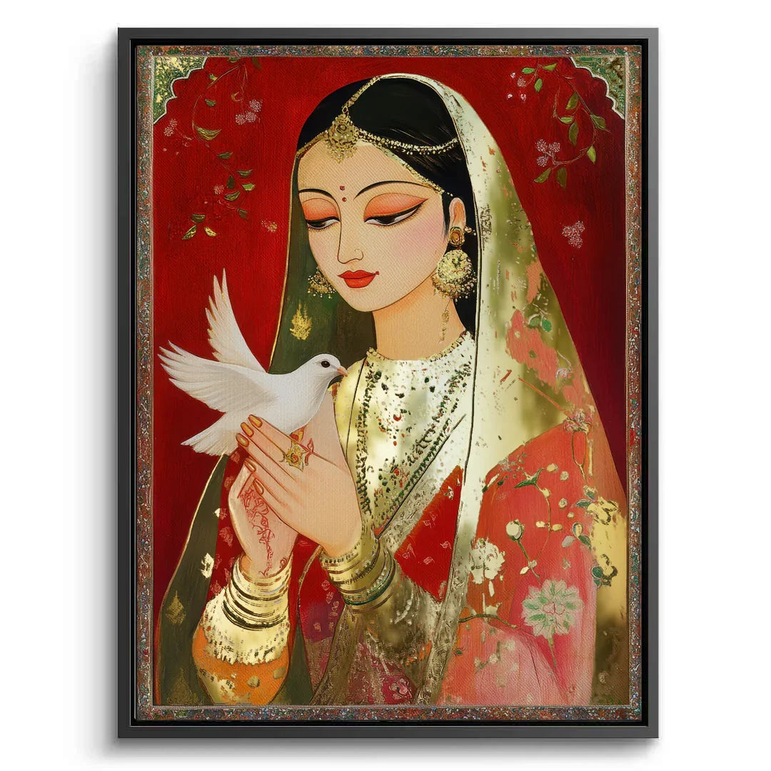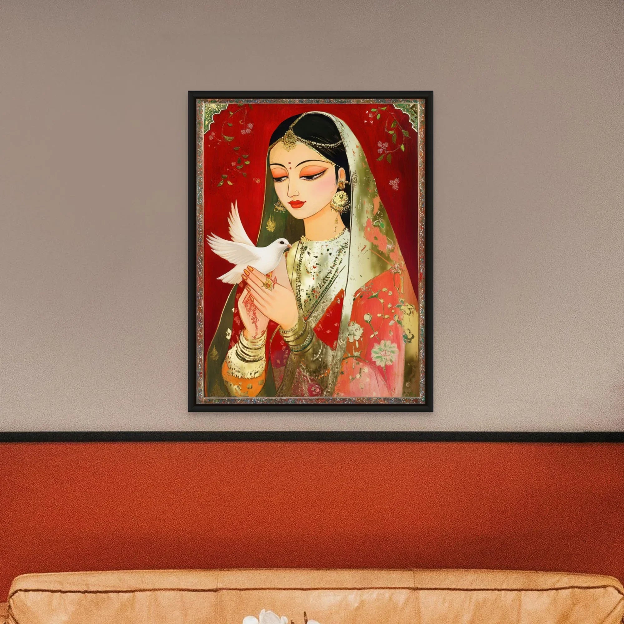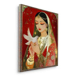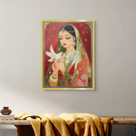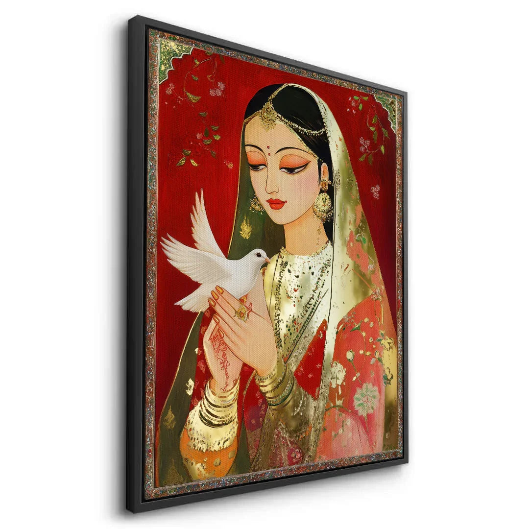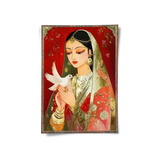 Adorned in regal red and gold foiled detailing, Rajrani embodies timeless grace and quiet strength. A poised queen with a dove in hand, she brings heritage warmth to living rooms, entryways, reading corners, or softly lit hallways.