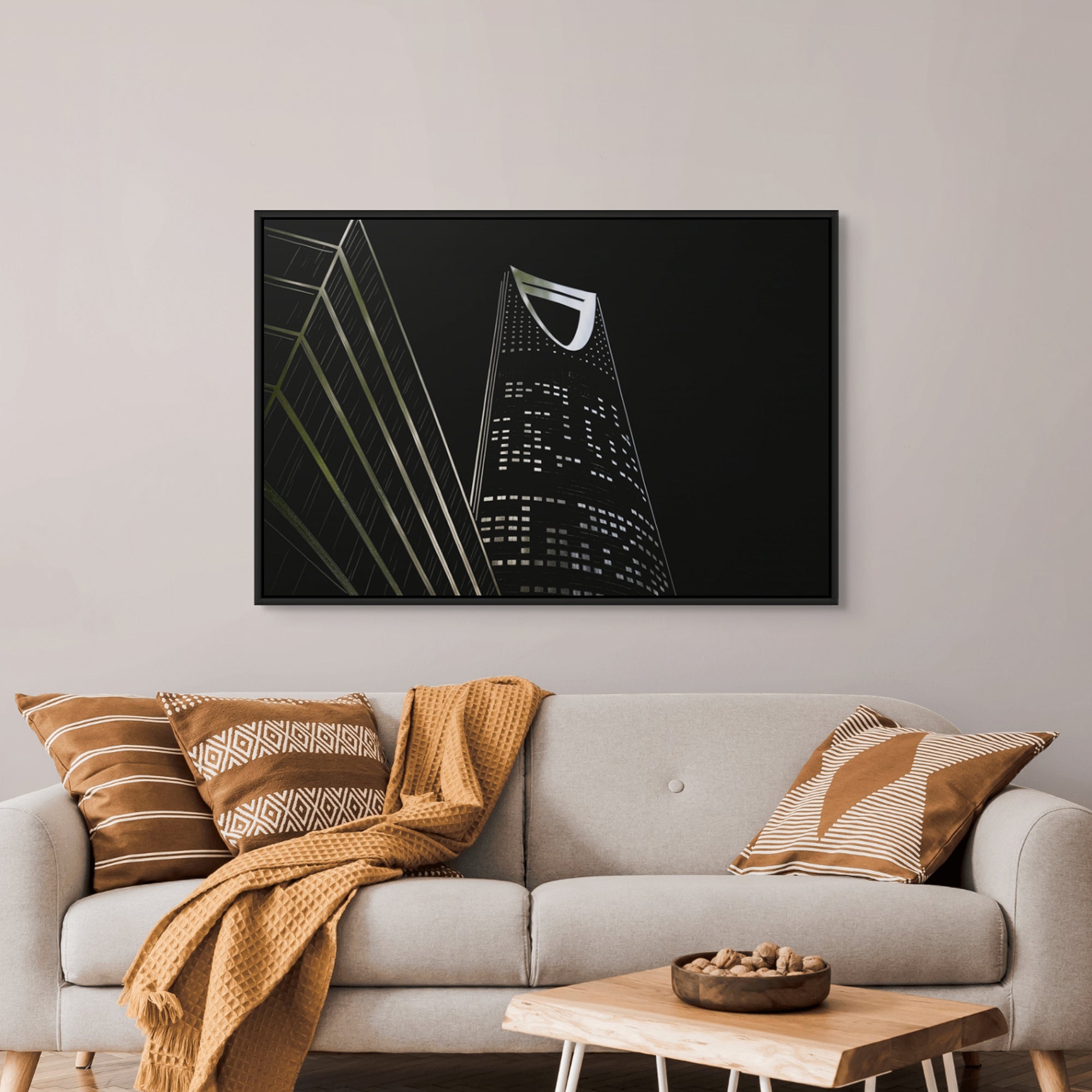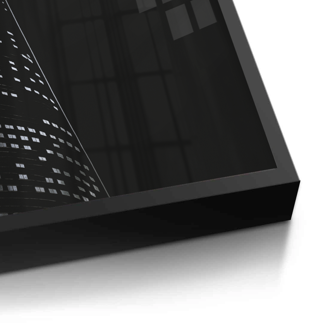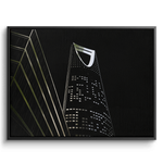 An angled silver-foiled view of Riyadh’s iconic Kingdom Tower, symbolizing ambition and progress. Its monochrome minimalism creates a striking statement, ideal for offices, bedrooms, or living rooms styled with modern sophistication.