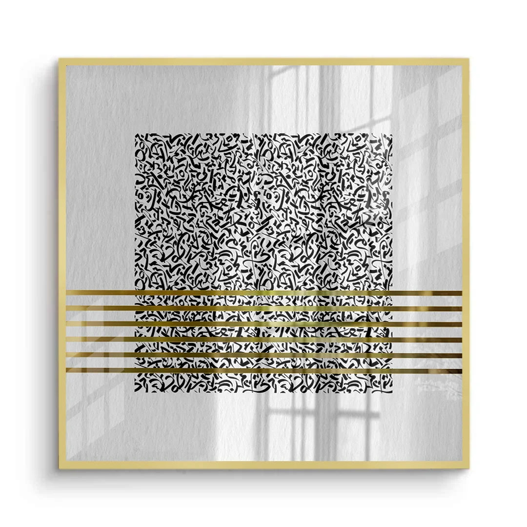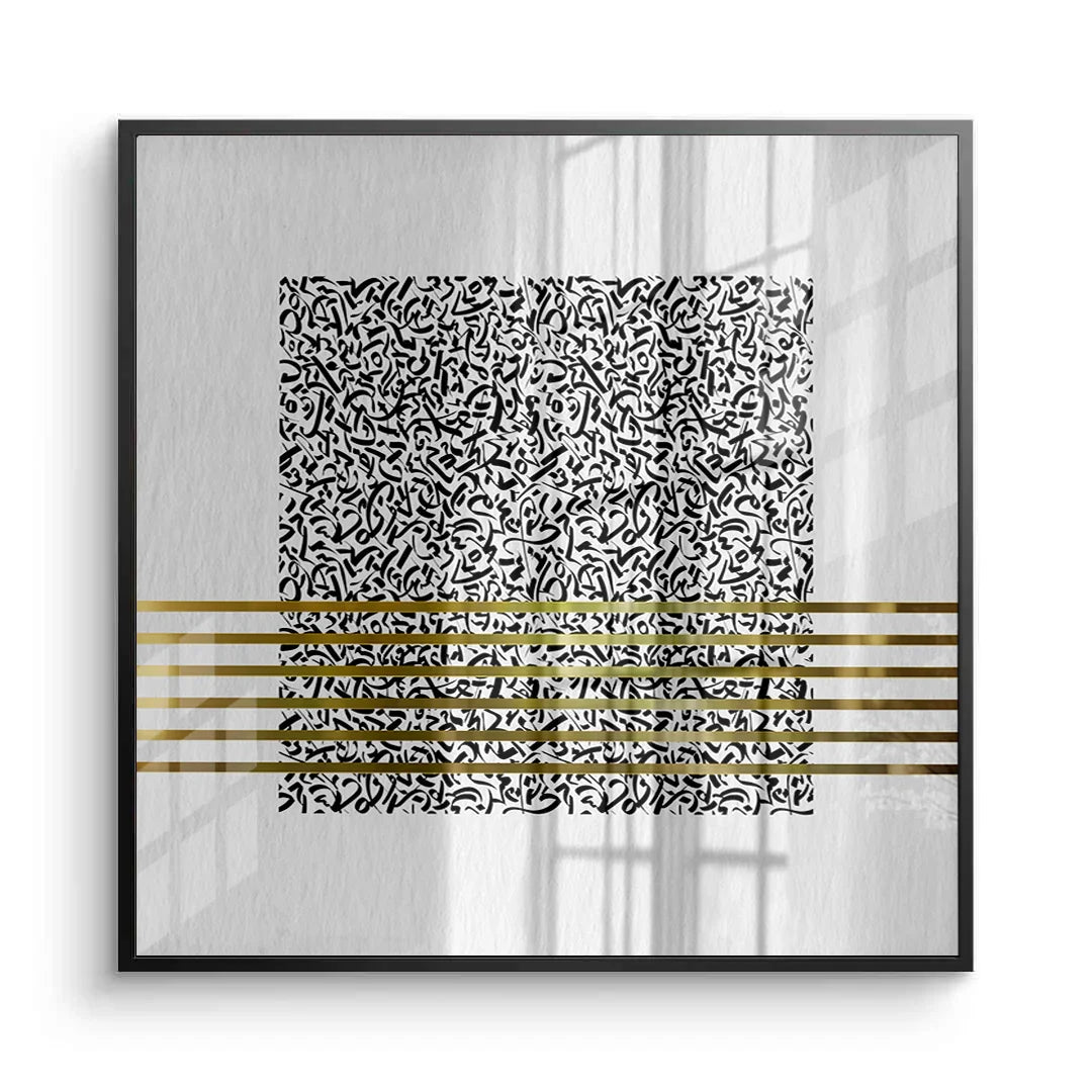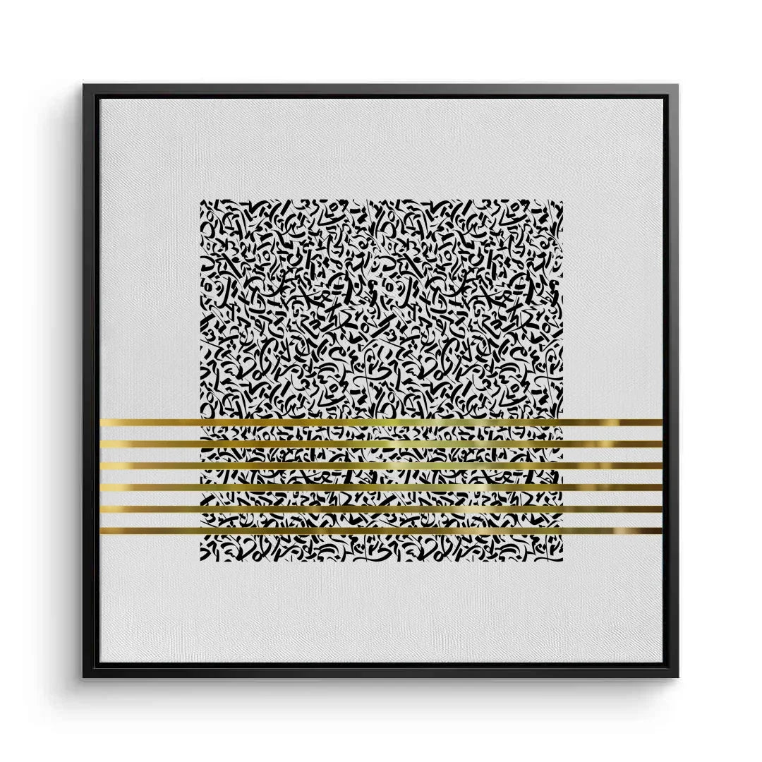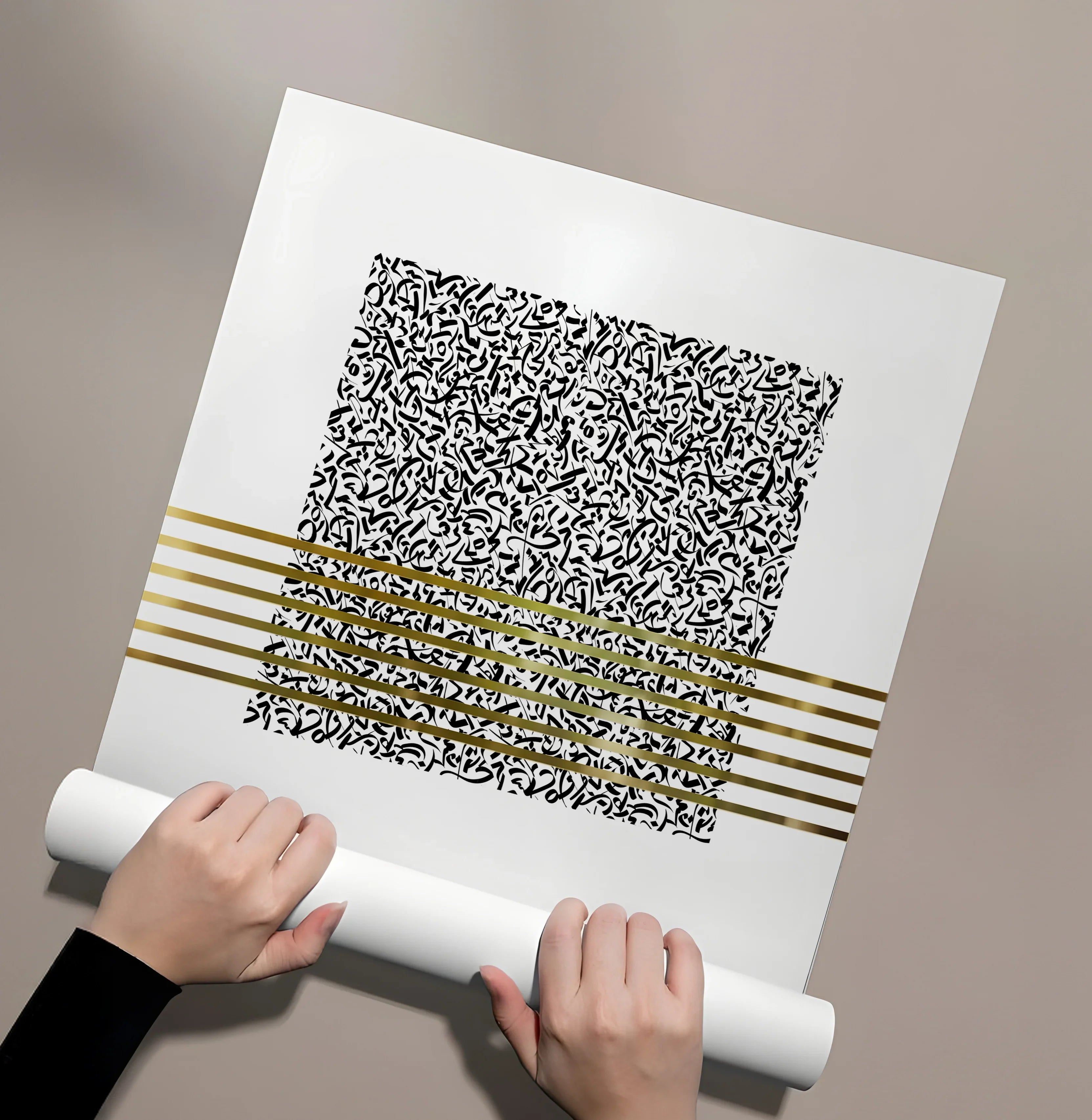 A dynamic composition of dense modern Arabic calligraphy, interrupted by linear bands of foiled gold. The interplay of texture and symmetry creates a rhythm that feels both ancient and contemporary. Perfect for structured yet expressive spaces.