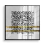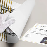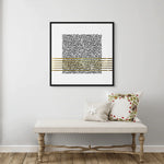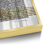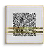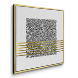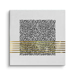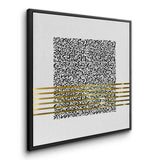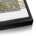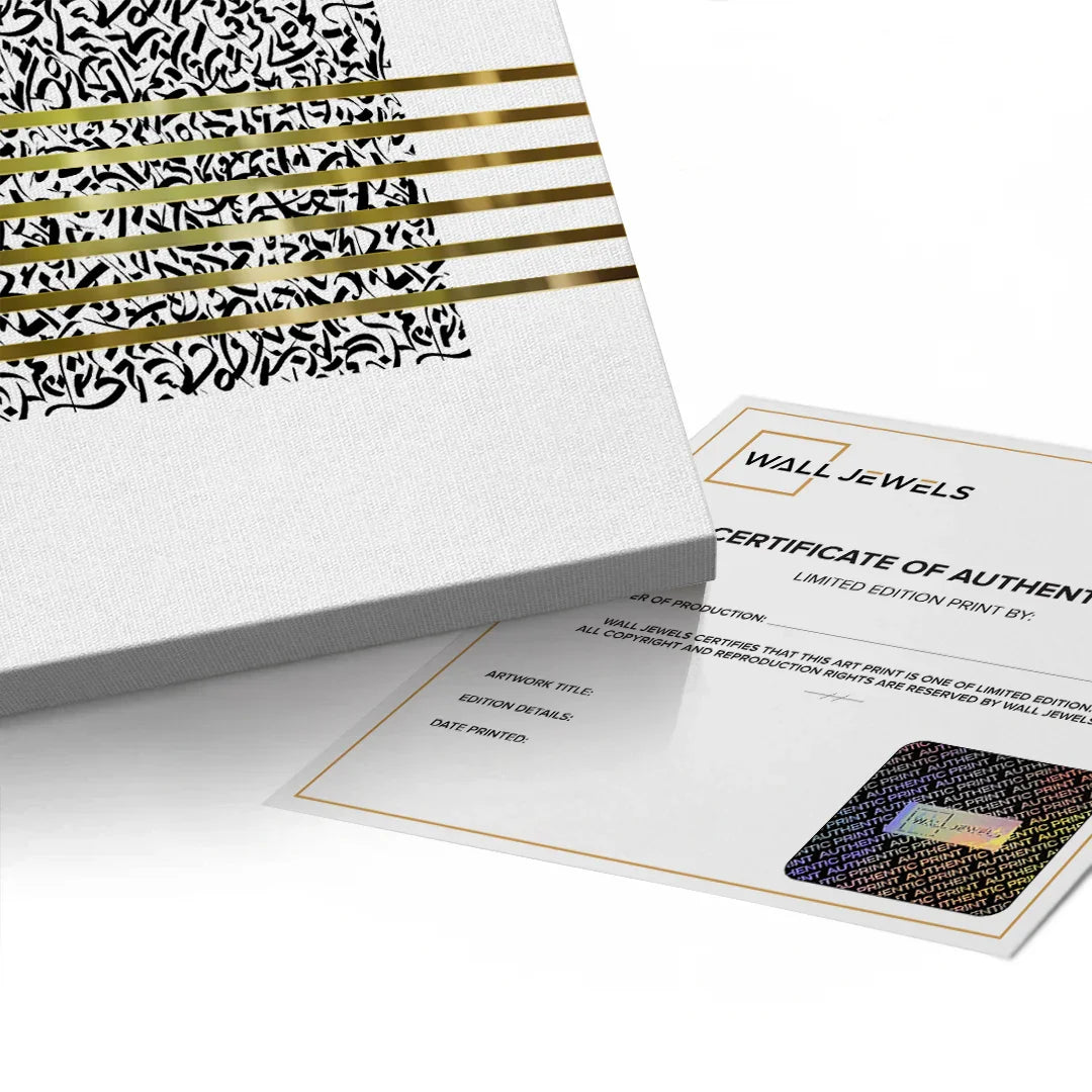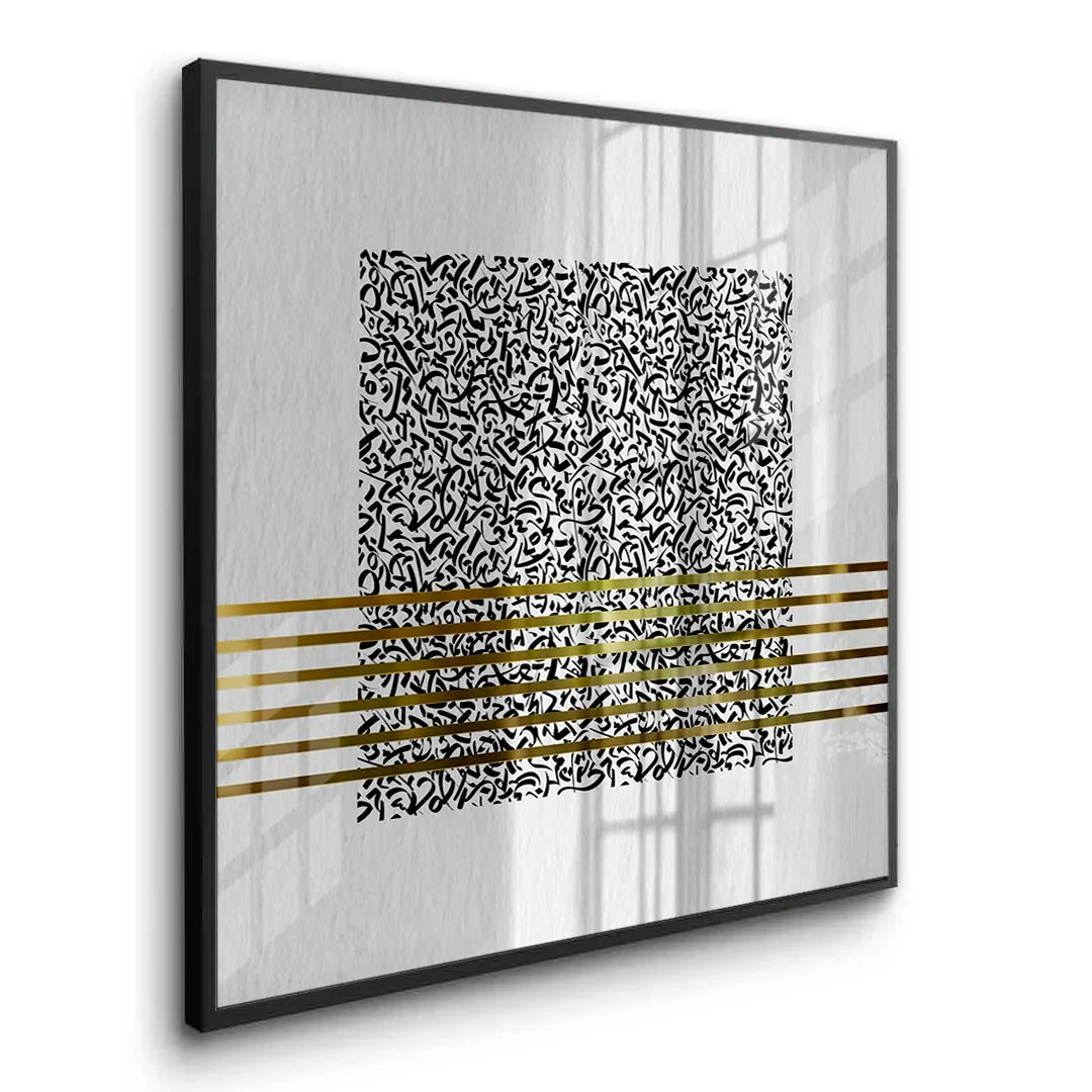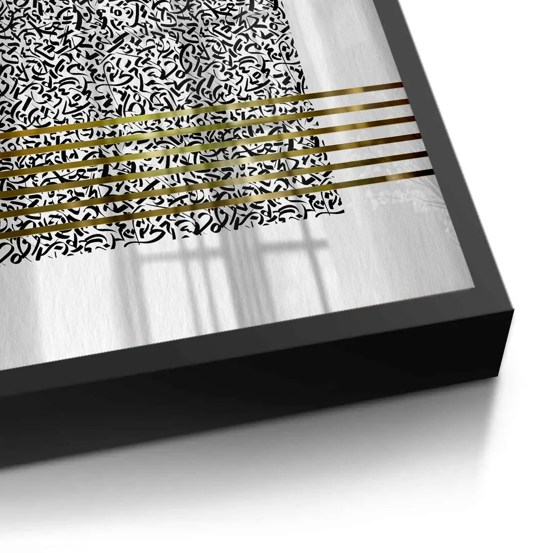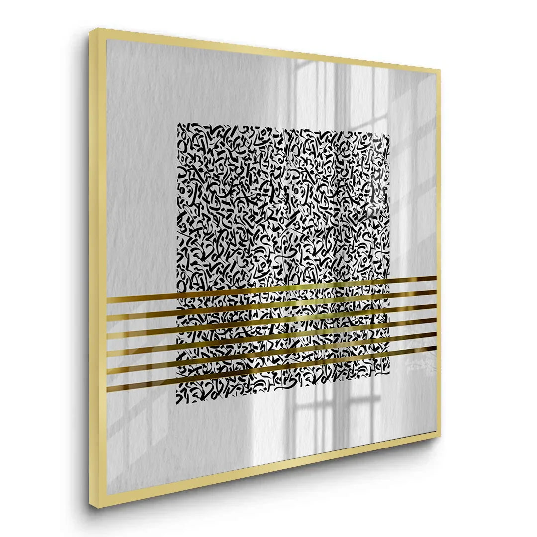 A dynamic composition of dense modern Arabic calligraphy, interrupted by linear bands of foiled gold. The interplay of texture and symmetry creates a rhythm that feels both ancient and contemporary. Perfect for structured yet expressive spaces.
