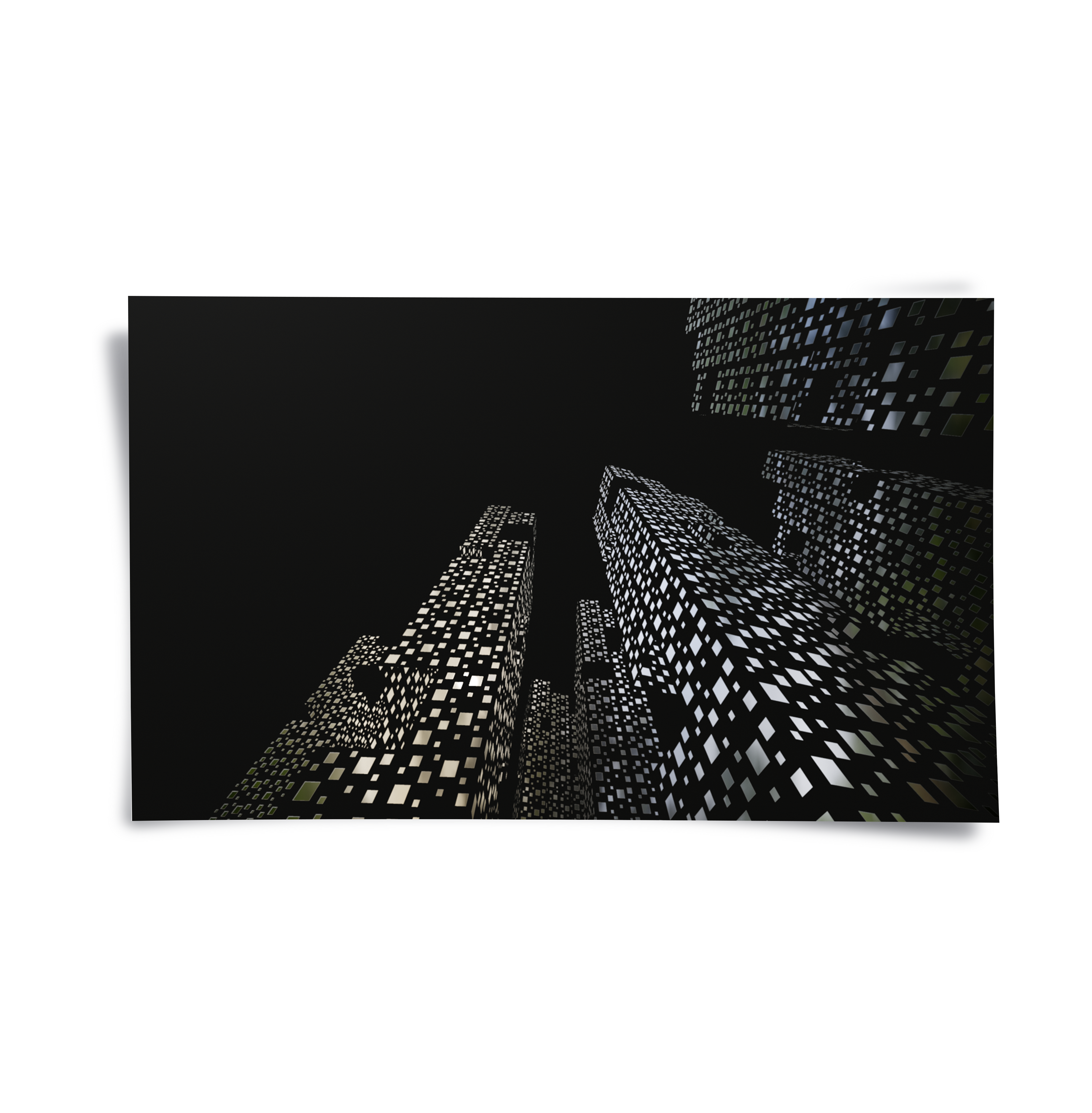 A dramatic upward view of illuminated skyscrapers in silver tones. This striking cityscape artwork captures the energy of modern architecture, perfect for offices, living rooms, or design-led interiors seeking a bold urban statement.