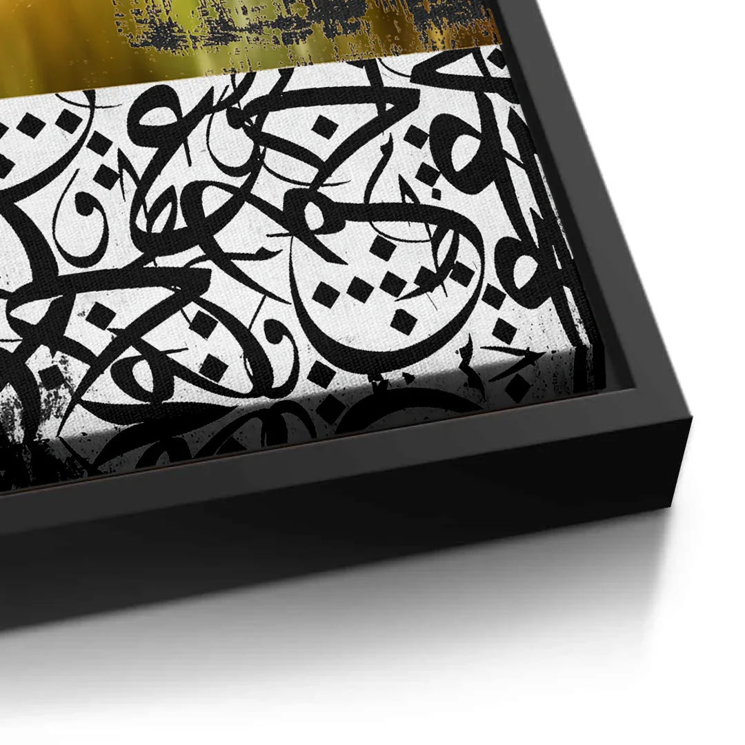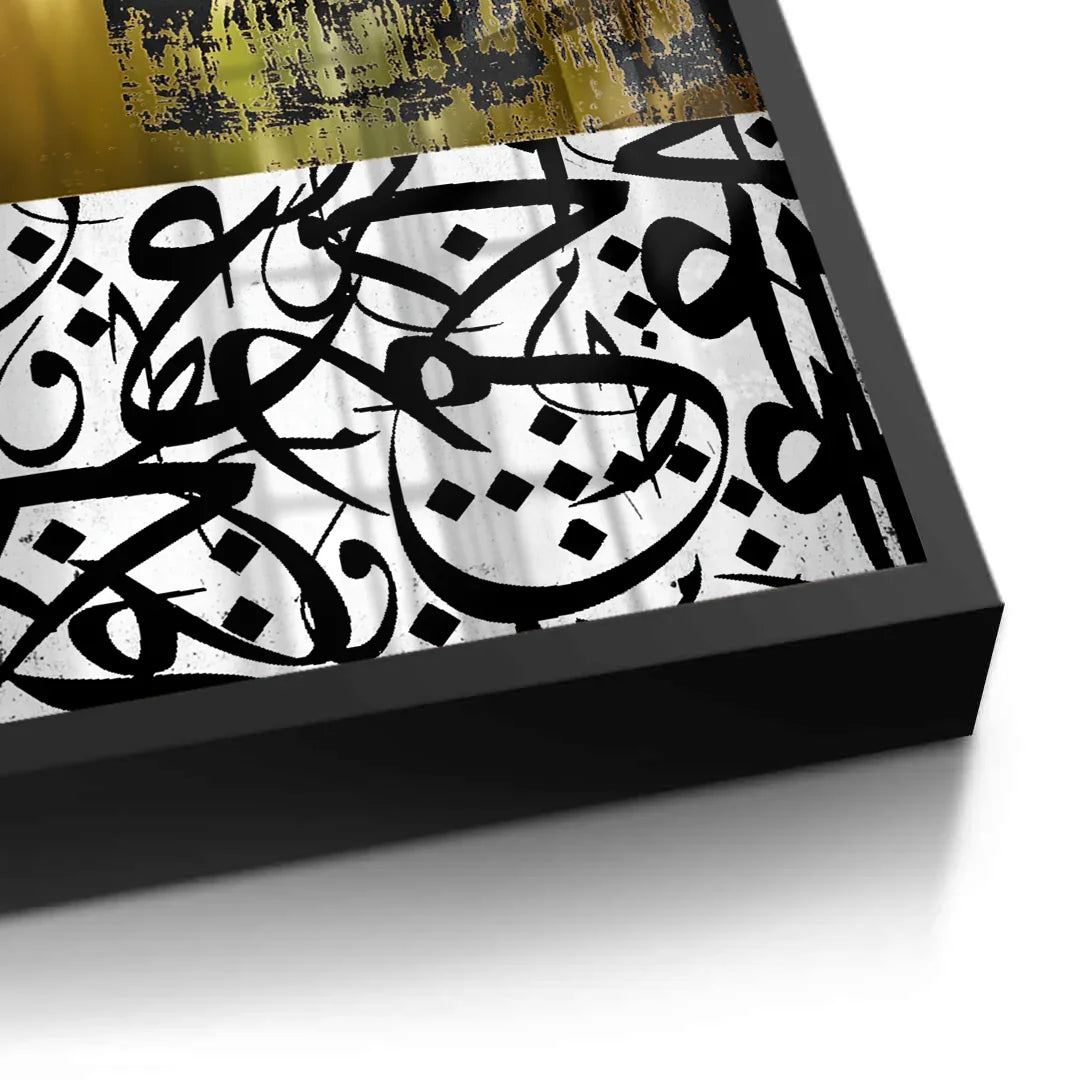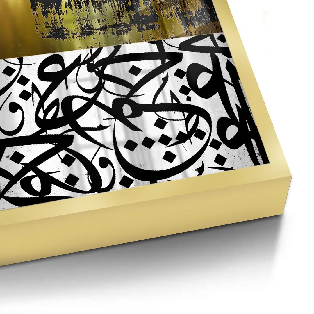 This artwork blends Thuluth Arabic calligraphy with abstract geometry and distressed gold. Gritty yet graceful, the composition weaves tradition and rebellion into bold rhythm. Perfect for statement walls in living rooms, hallways, or offices.