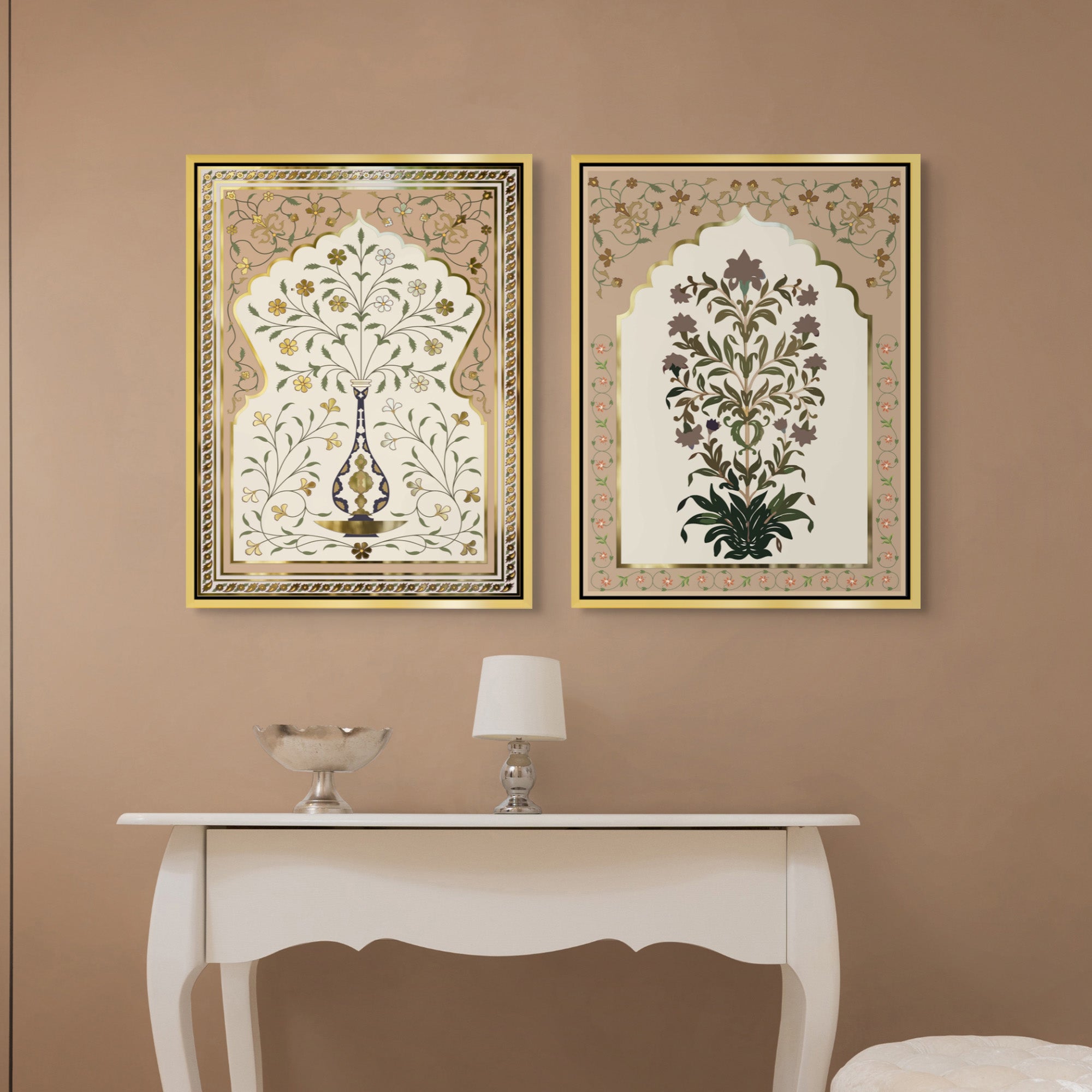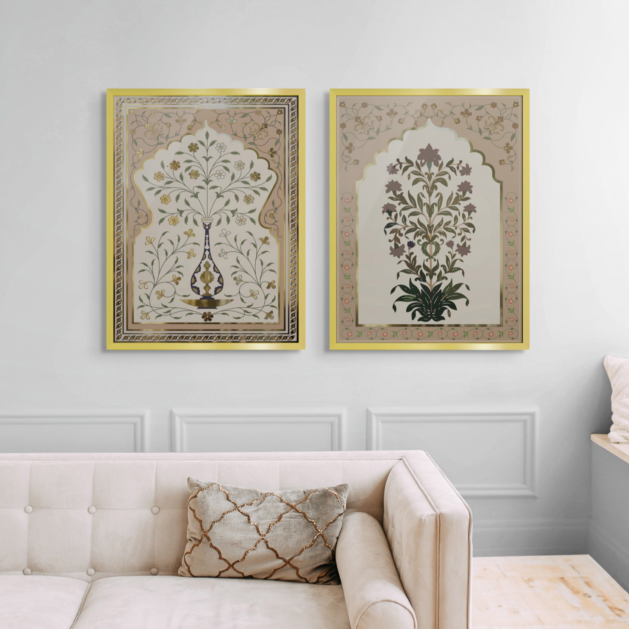 Zarkashi, meaning “golden artistry,” features two intricately framed floral compositions, rich in Mughal detail. With muted tones and gold foiled accents, this elegant pair enhances bedrooms, corridors, study spaces, or curated nooks with timeless