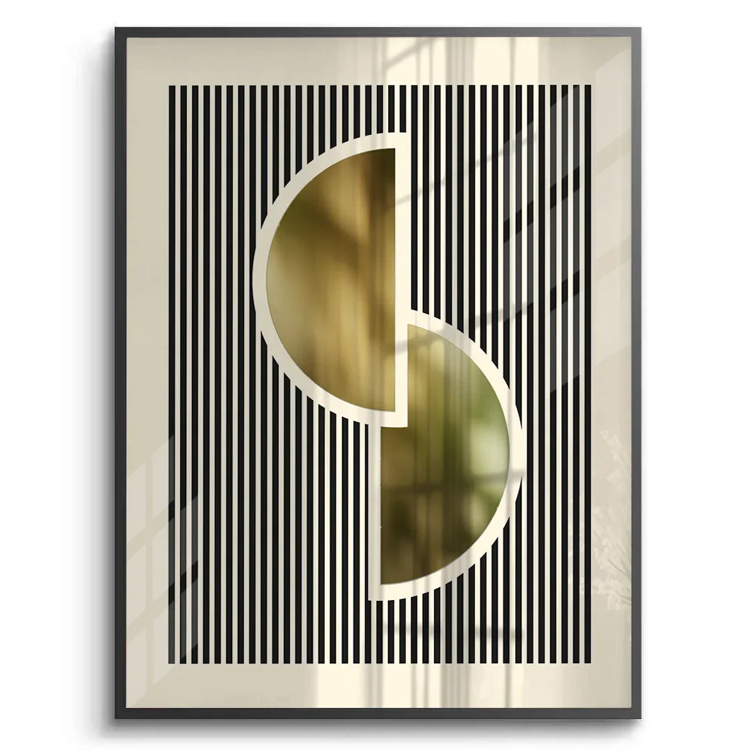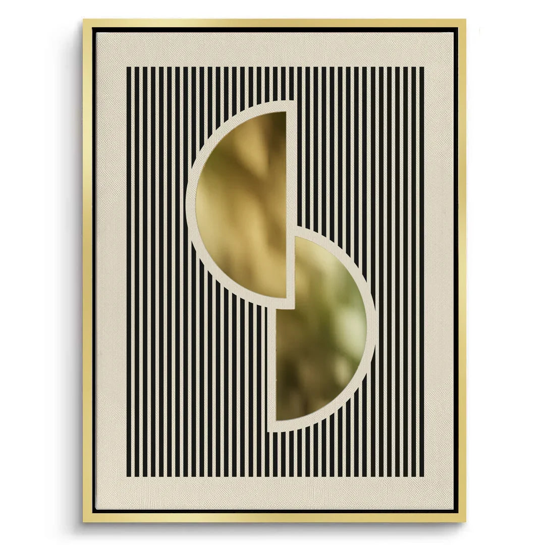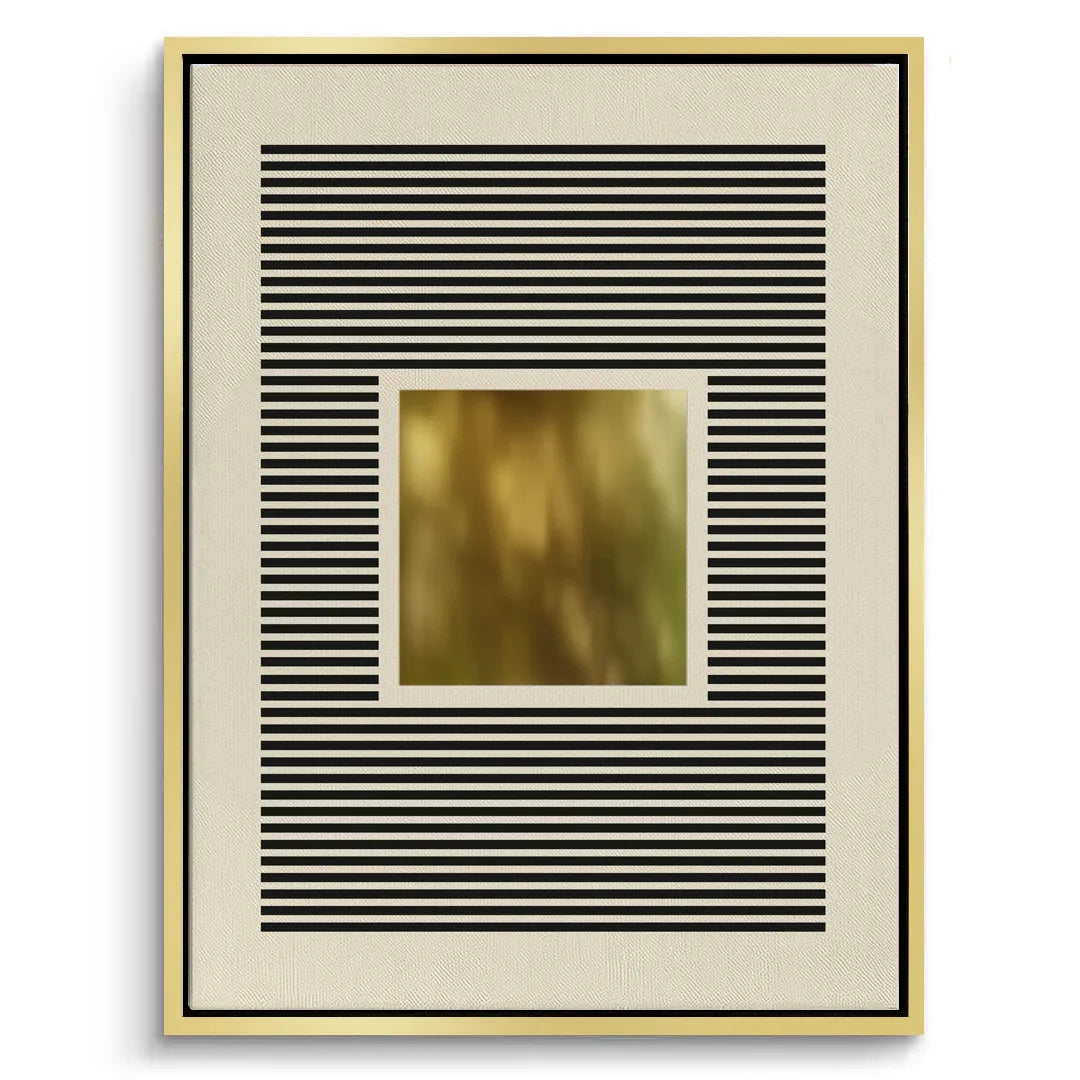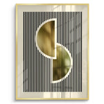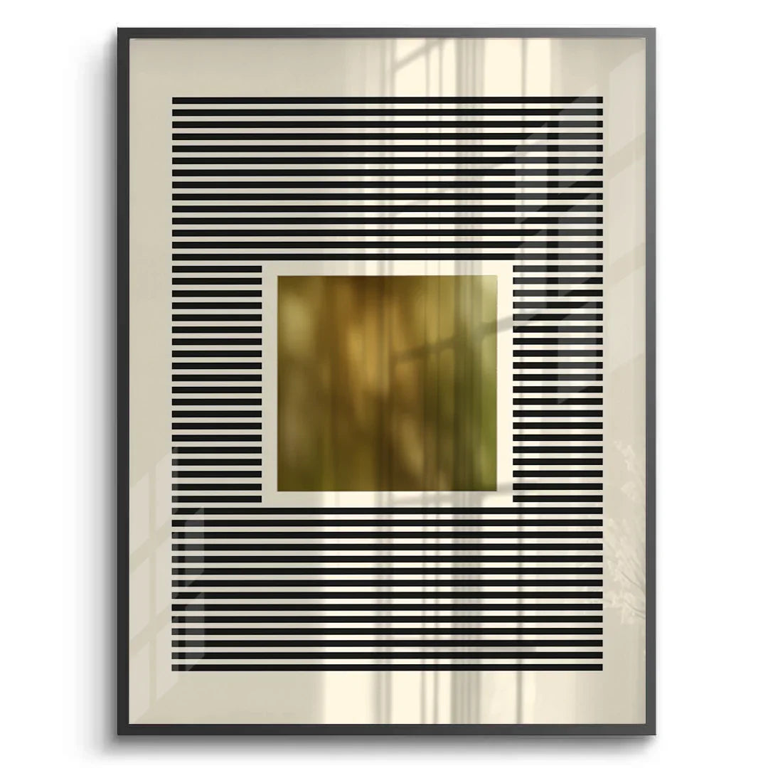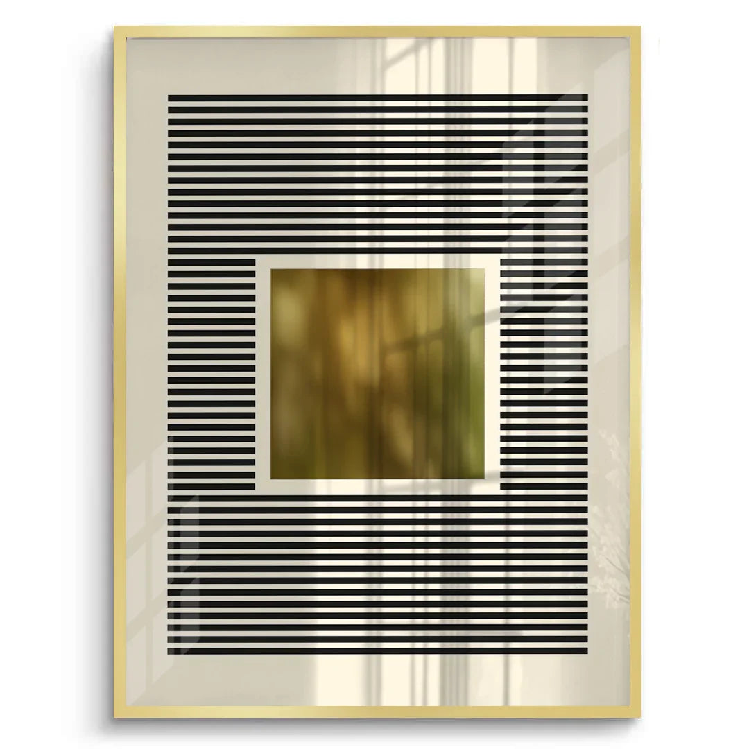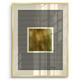 Bold black lines and structured forms contrast with a warm beige base, anchored by a gold-foiled centerpiece. This artwork adds rhythm and elegance—perfect for modern spaces seeking a clean, minimal look with a luxurious graphic accent.