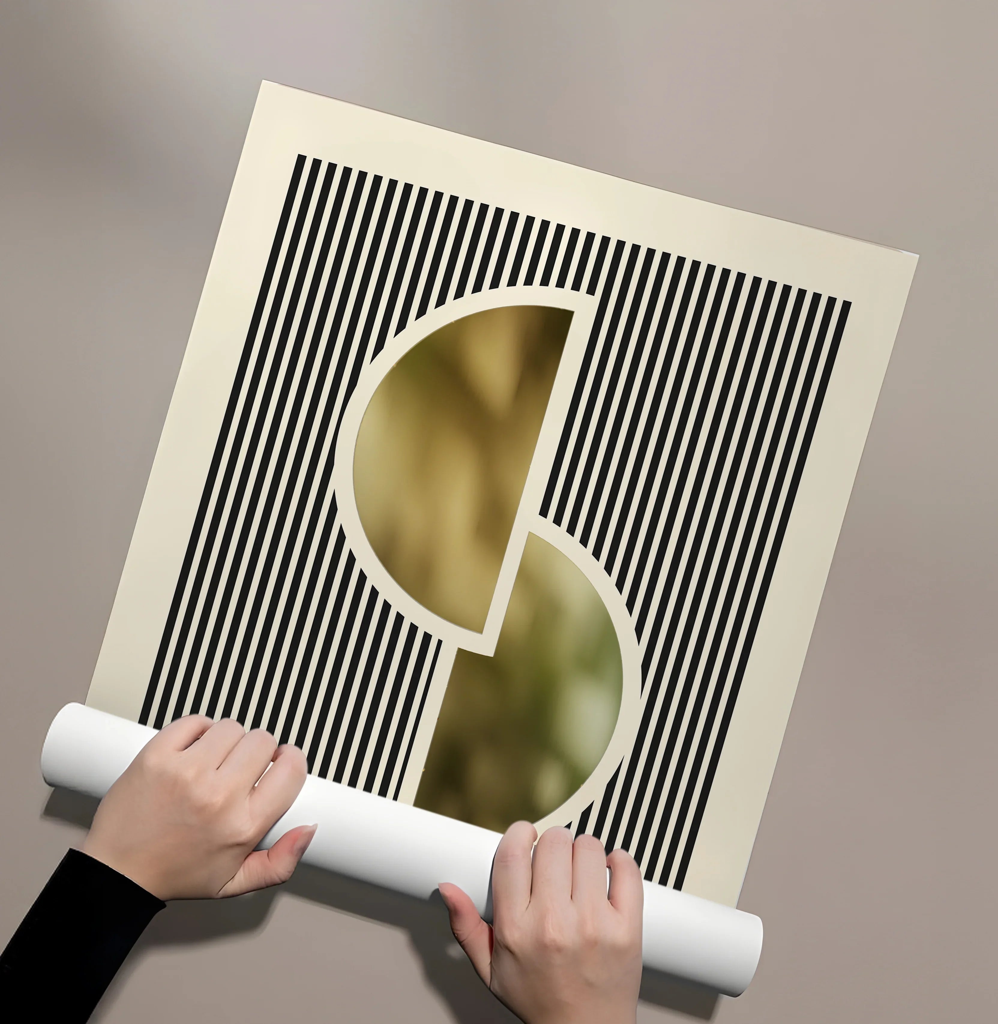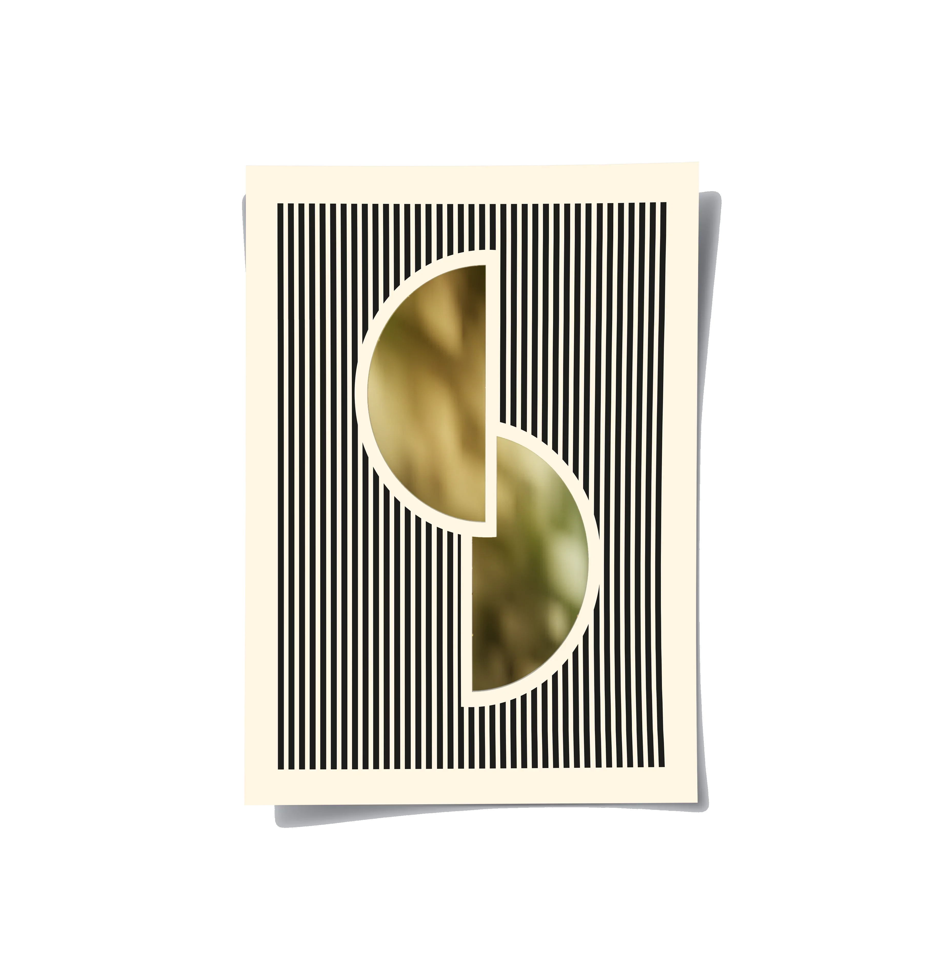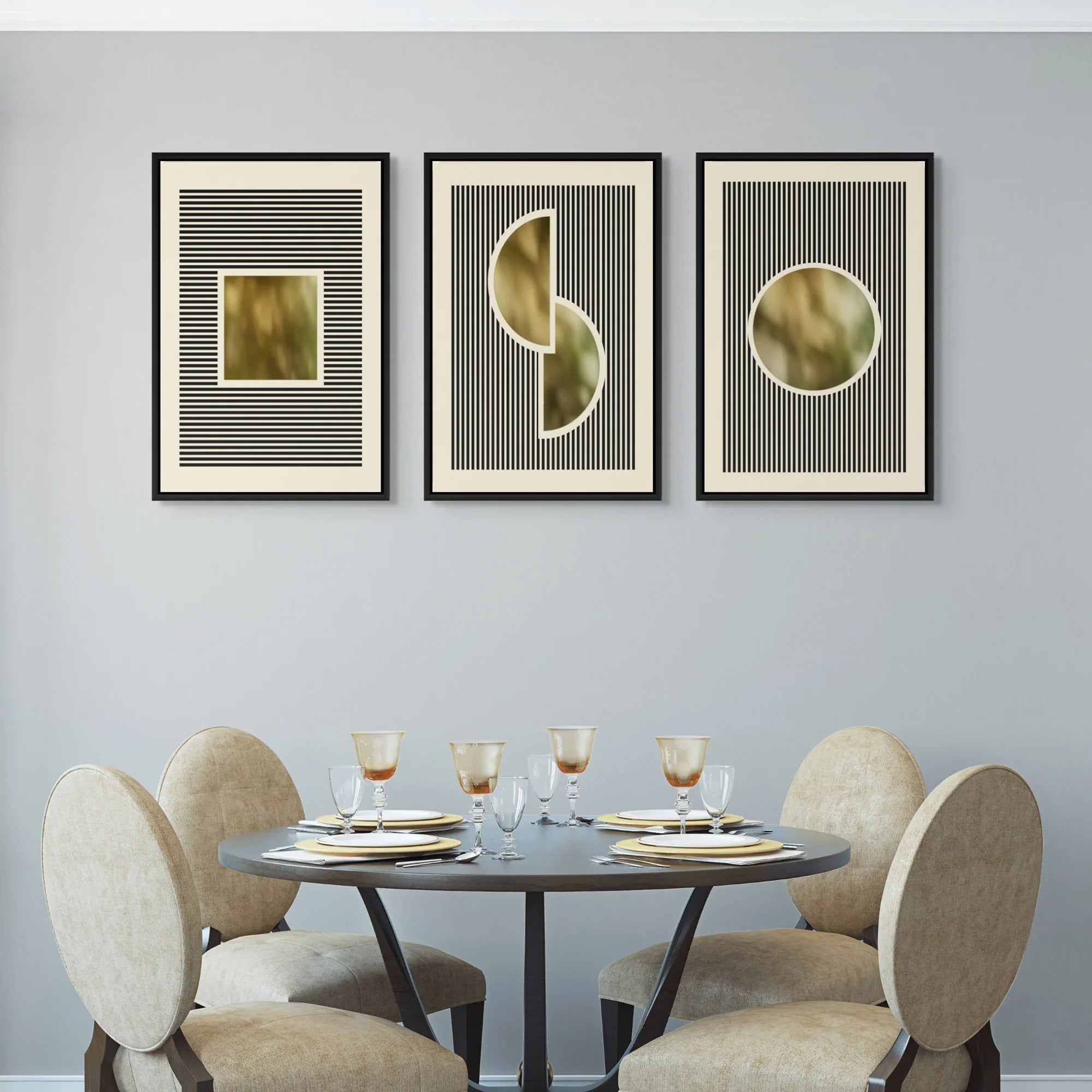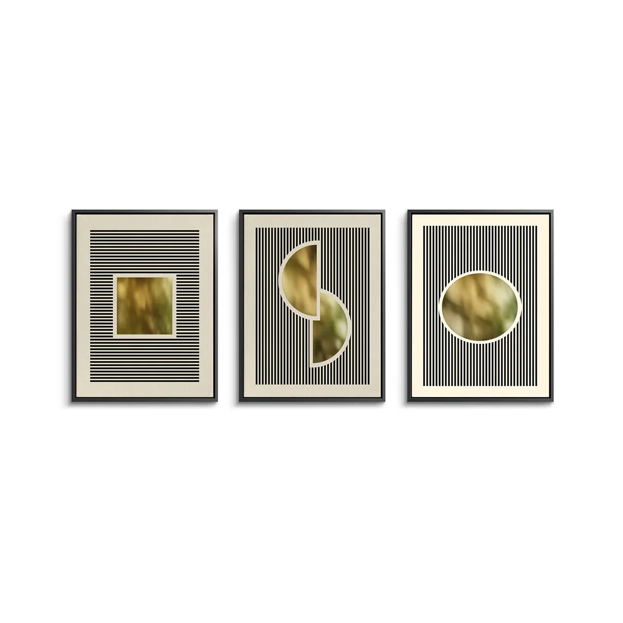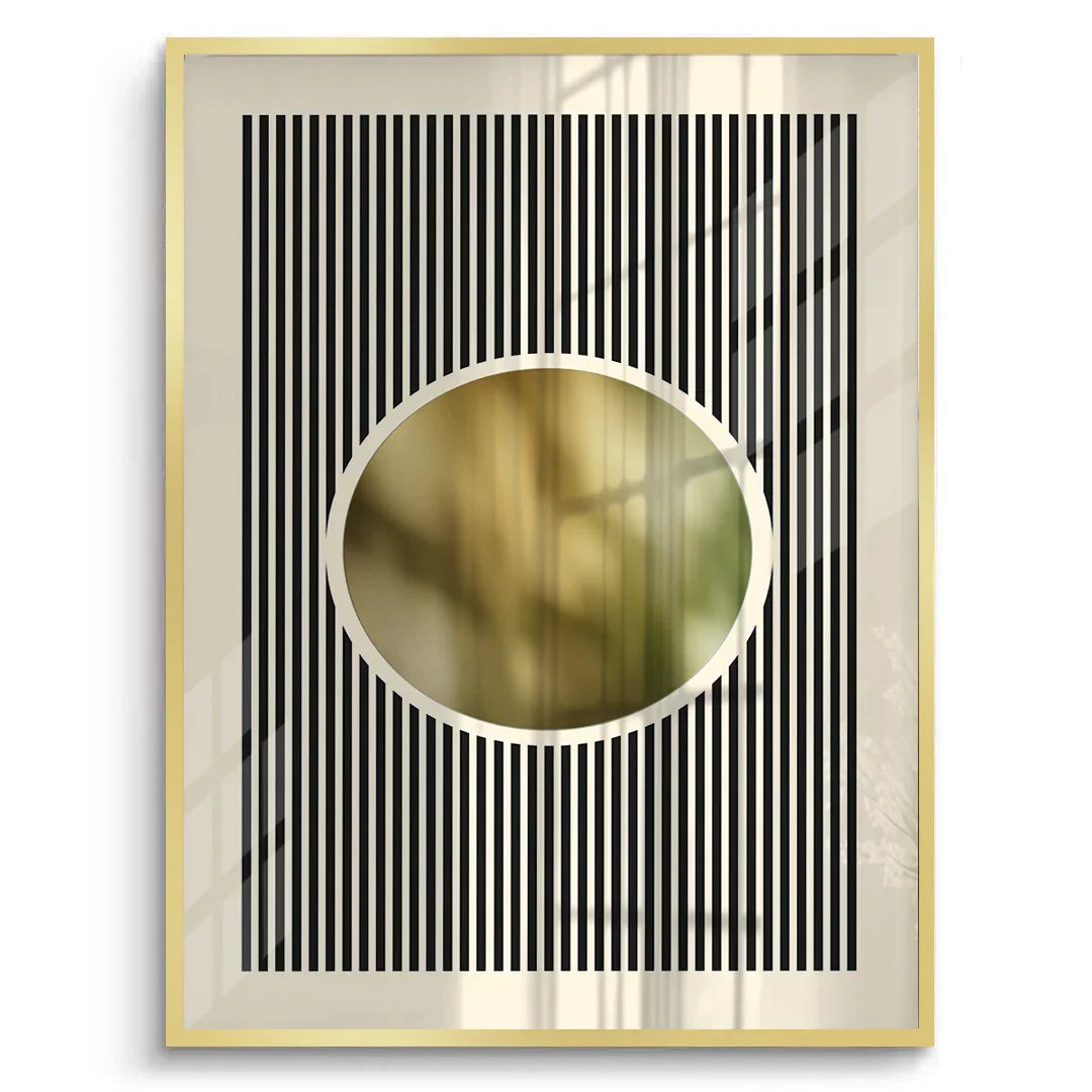 Bold black lines and structured forms contrast with a warm beige base, anchored by a gold-foiled centerpiece. This artwork adds rhythm and elegance—perfect for modern spaces seeking a clean, minimal look with a luxurious graphic accent.