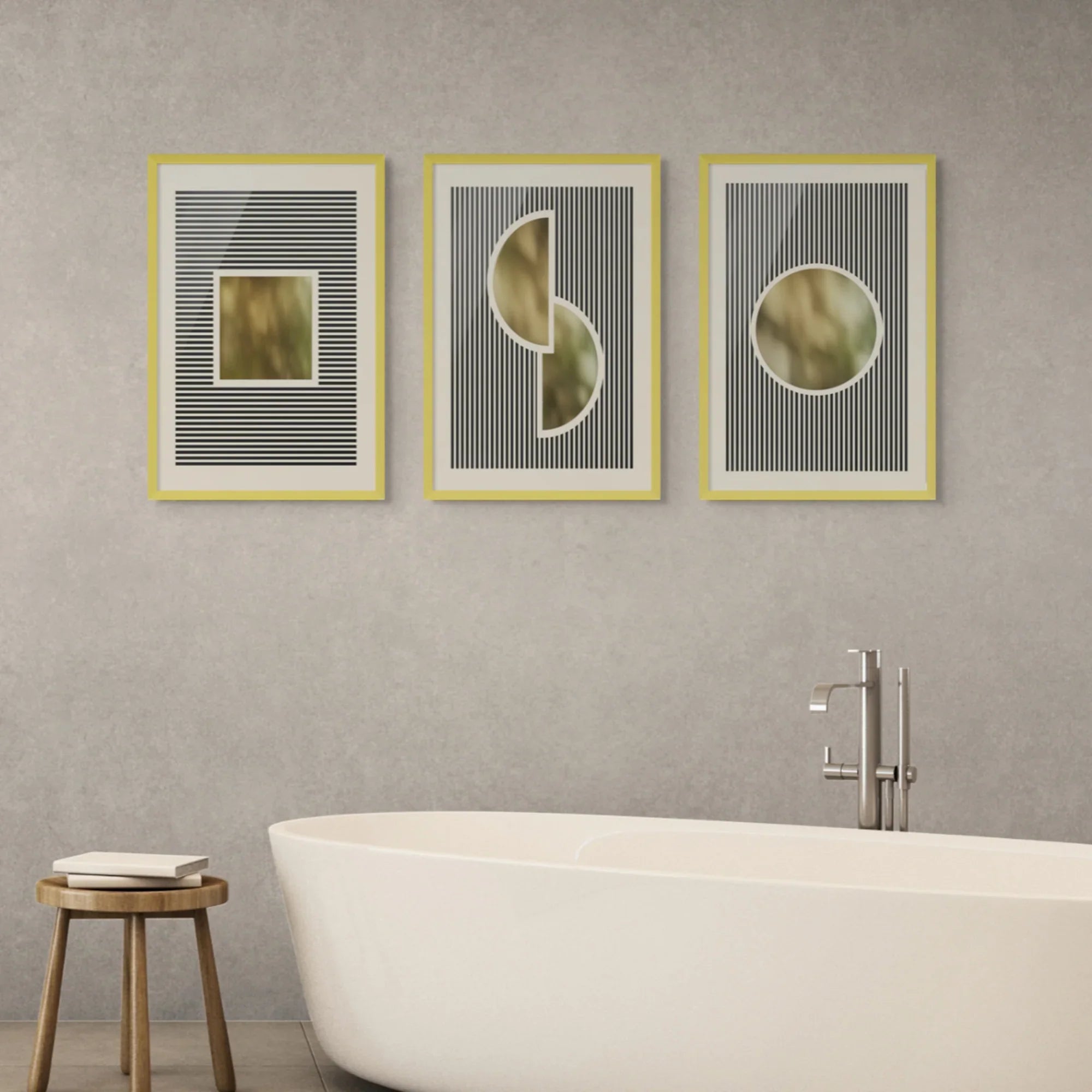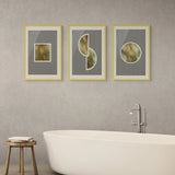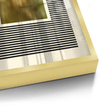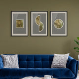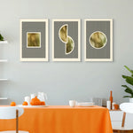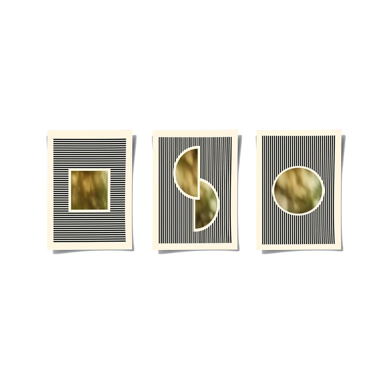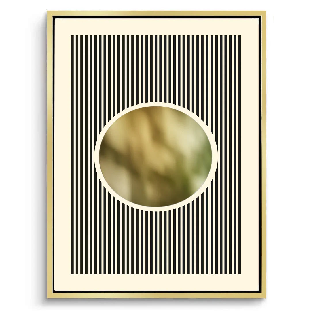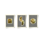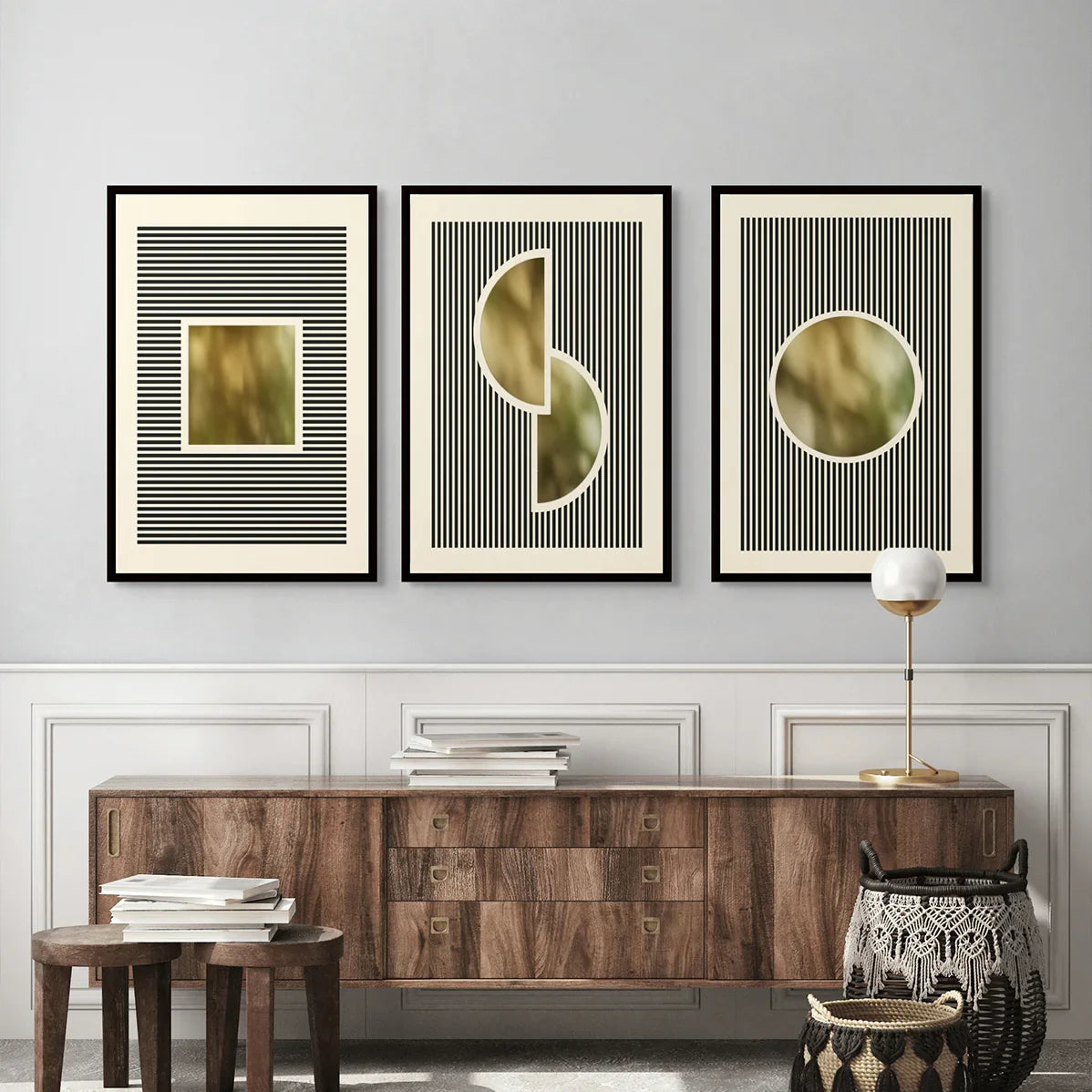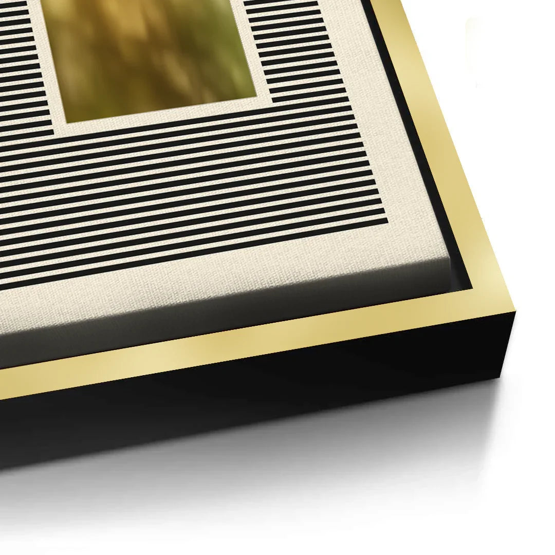 Bold black lines and structured forms contrast with a warm beige base, anchored by a gold-foiled centerpiece. This artwork adds rhythm and elegance—perfect for modern spaces seeking a clean, minimal look with a luxurious graphic accent.