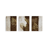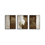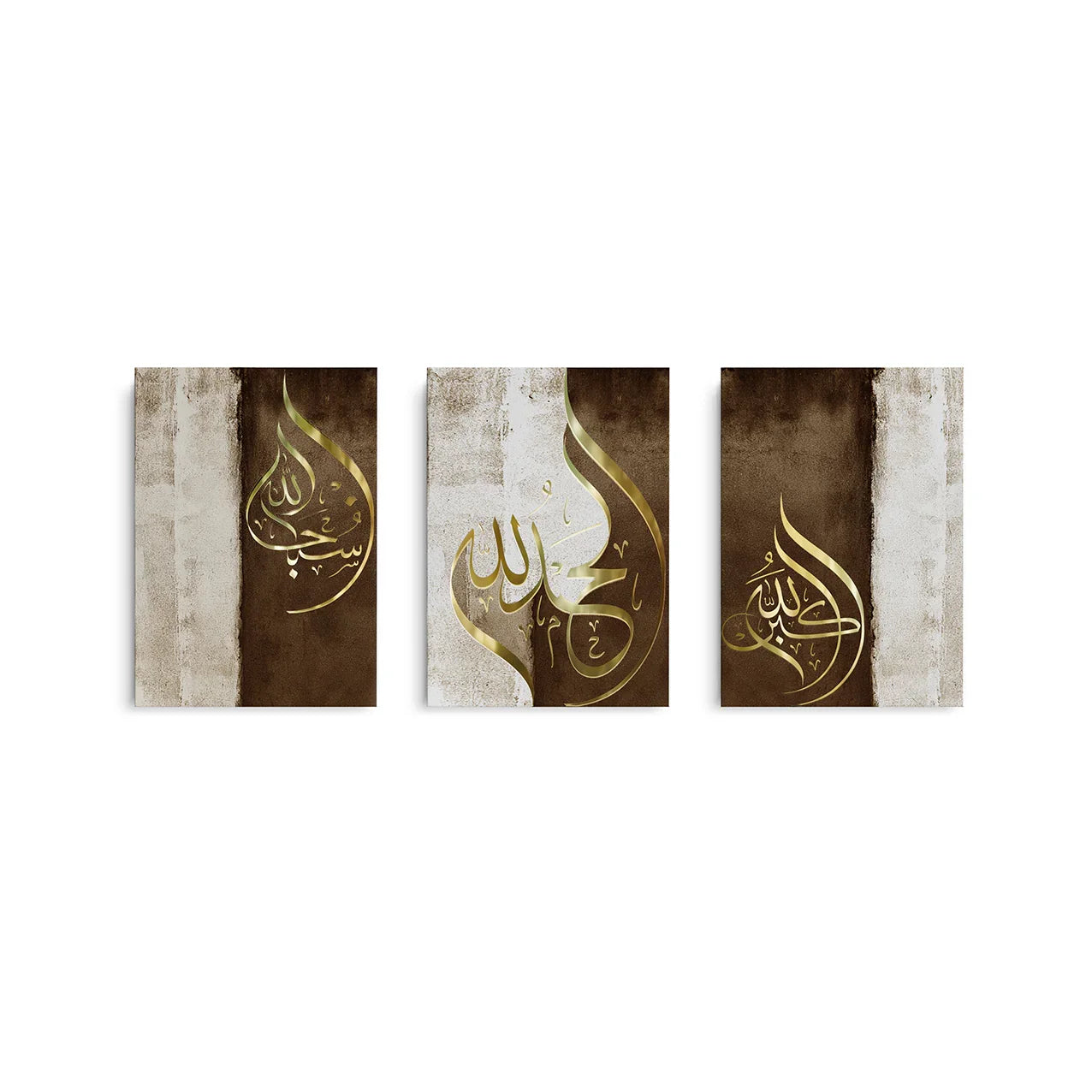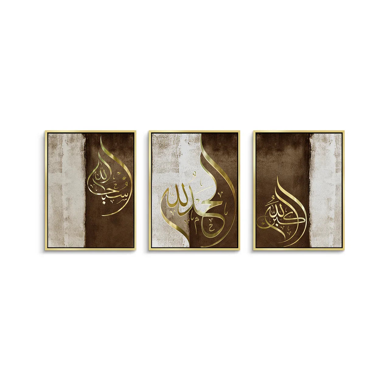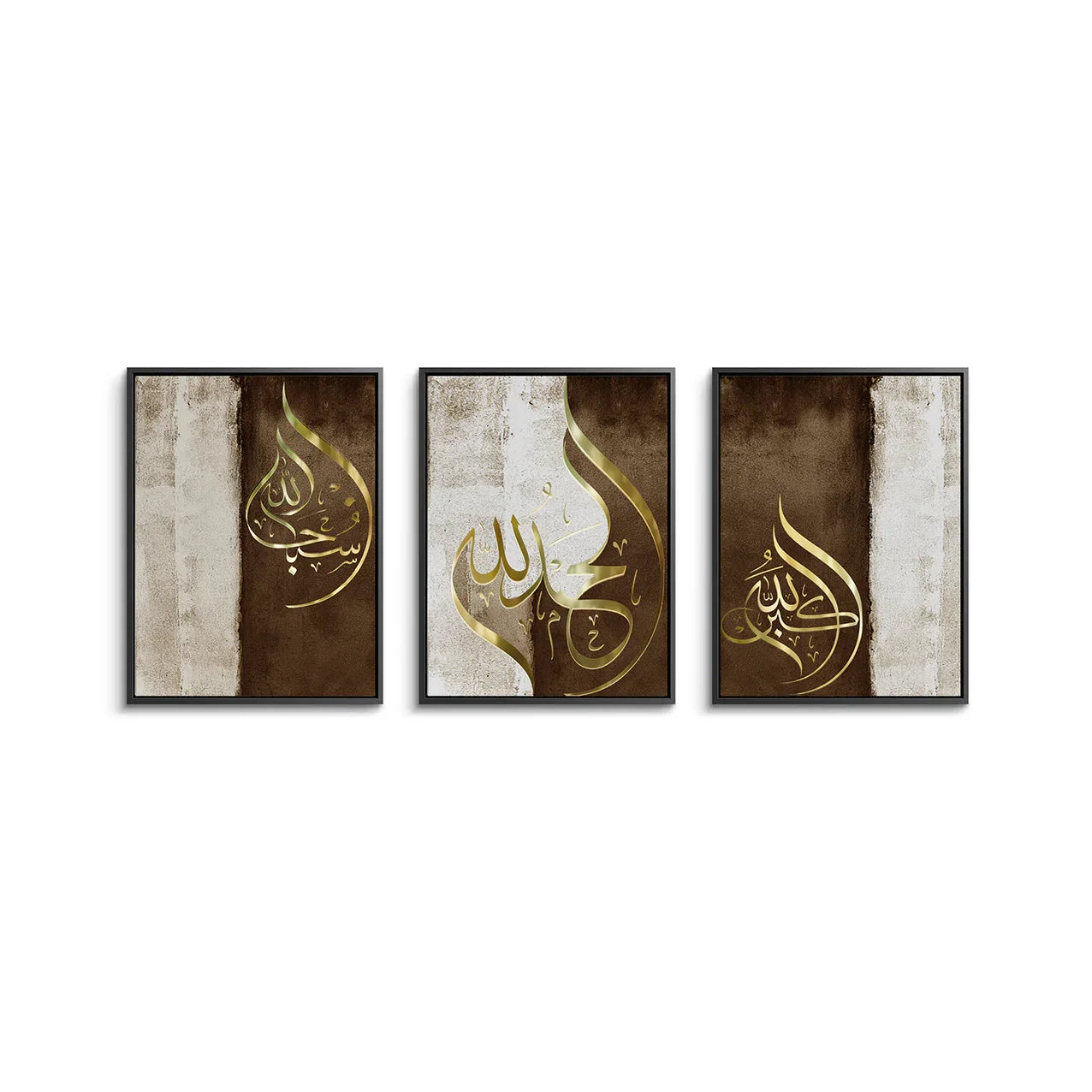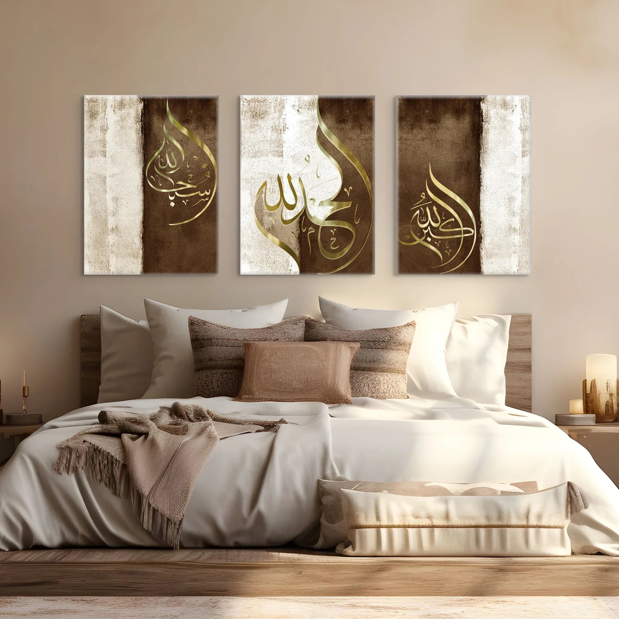 A timeless set of SubhanAllah, Alhamdulillah, and Allahu Akbar in graceful gold foiled Arabic calligraphy. Rich brown tones blend into textured beige, creating a warm, earthy finish. Perfect for living rooms, bedrooms, or prayer nooks.