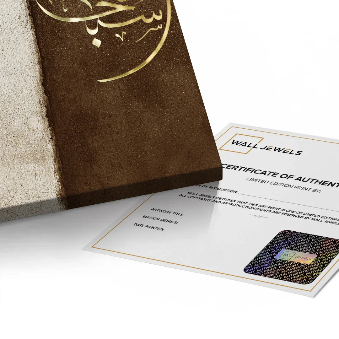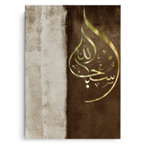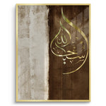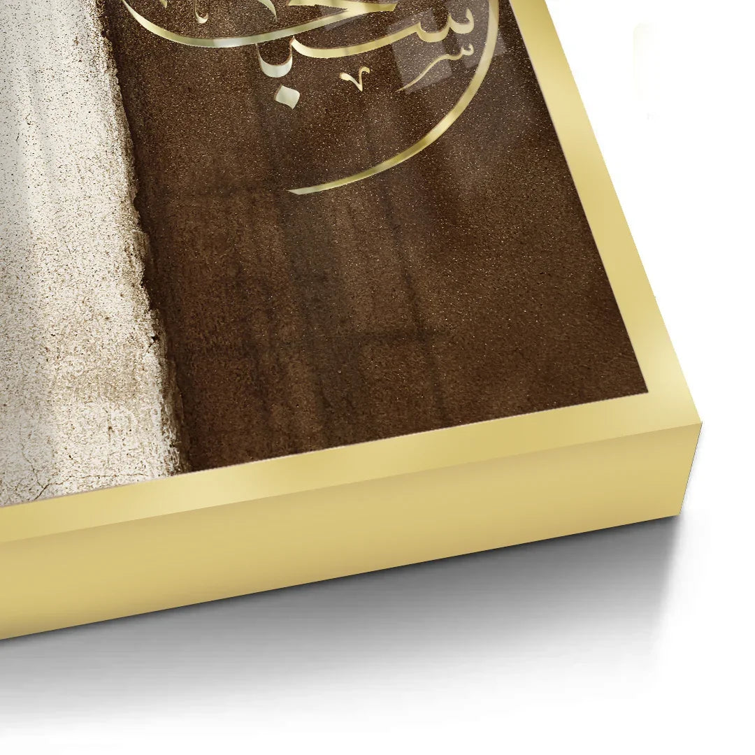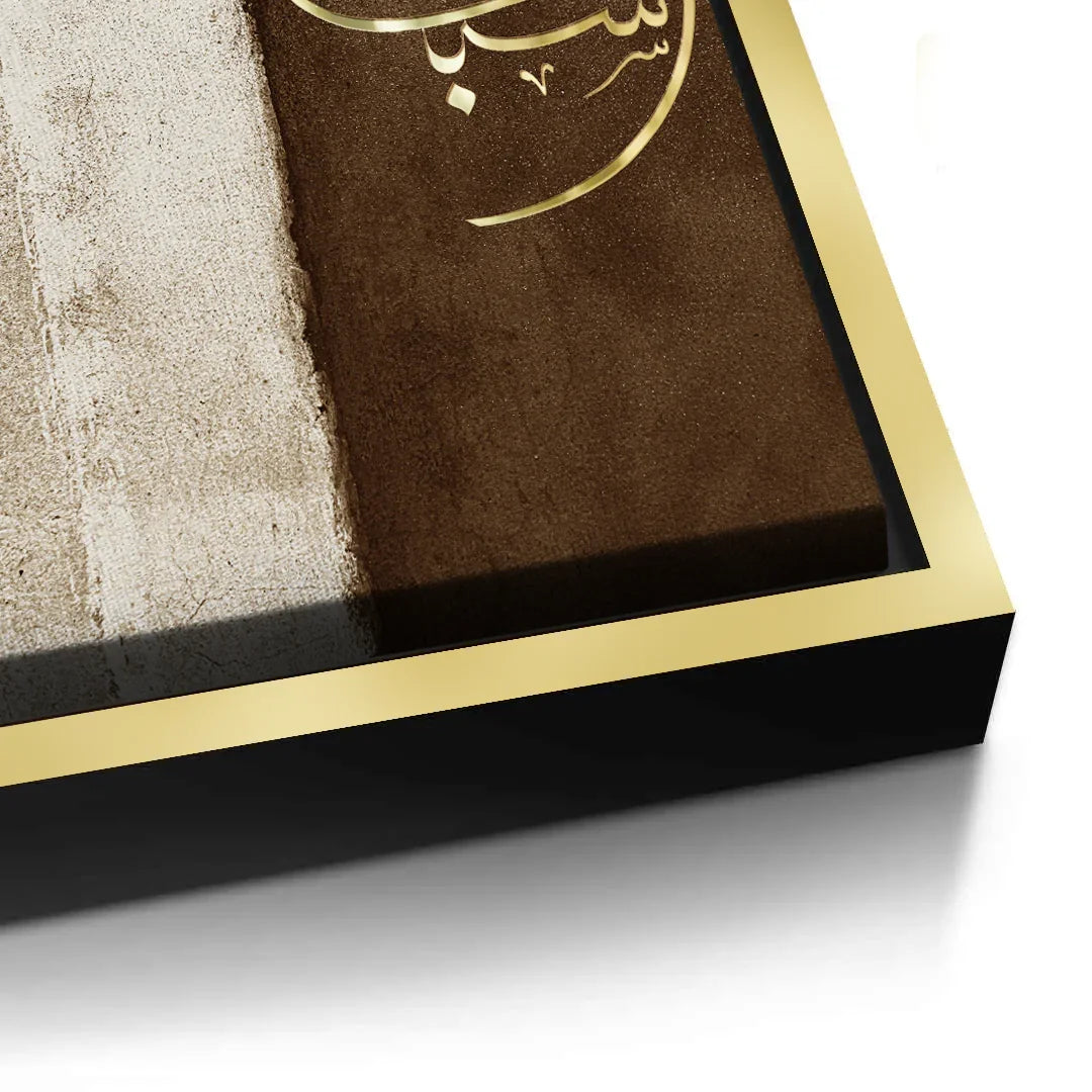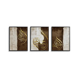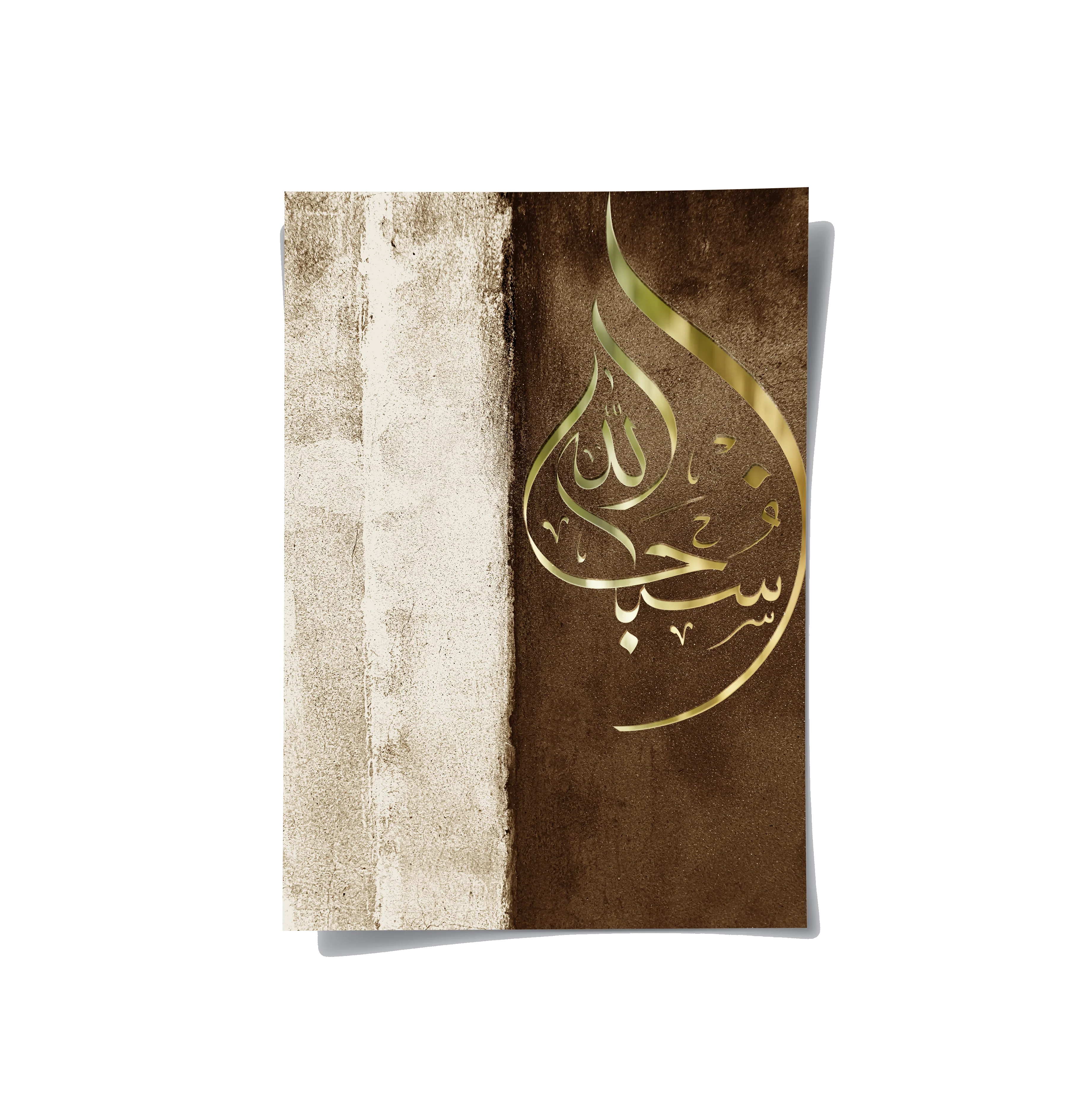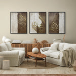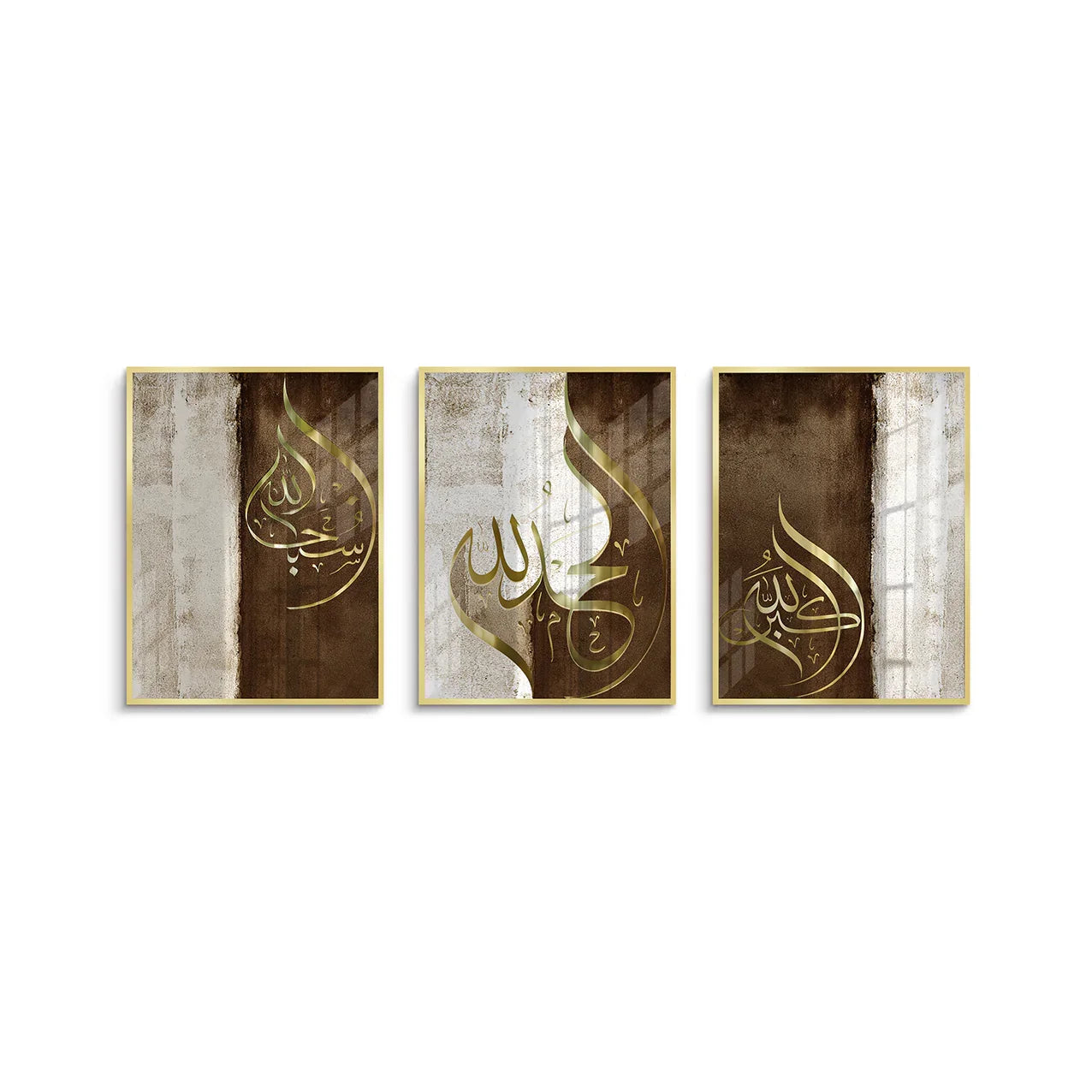 A timeless set of SubhanAllah, Alhamdulillah, and Allahu Akbar in graceful gold foiled Arabic calligraphy. Rich brown tones blend into textured beige, creating a warm, earthy finish. Perfect for living rooms, bedrooms, or prayer nooks.