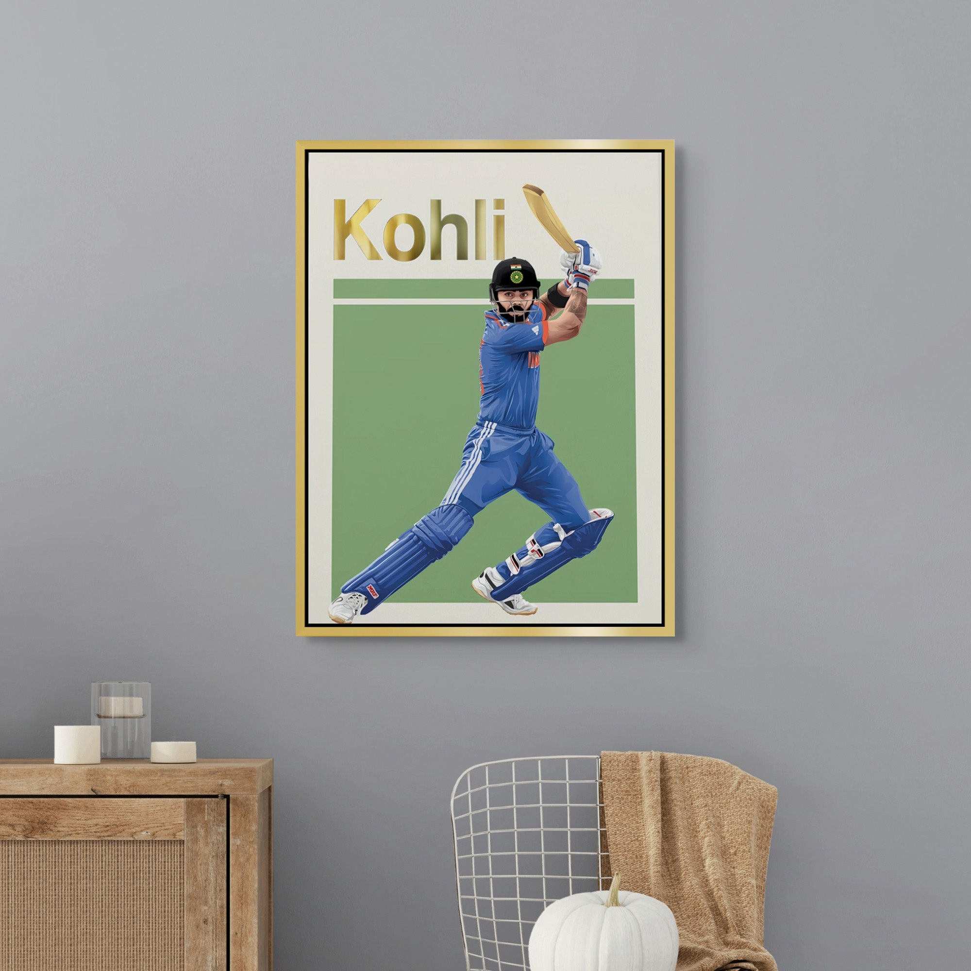 Virat Kohli unleashes a signature cover drive in this stylized, high-detail artwork that blends sharp action with clean design. Finished with gold foiling, it’s ideal for modern fan walls, lounges, or cricket-inspired interiors.