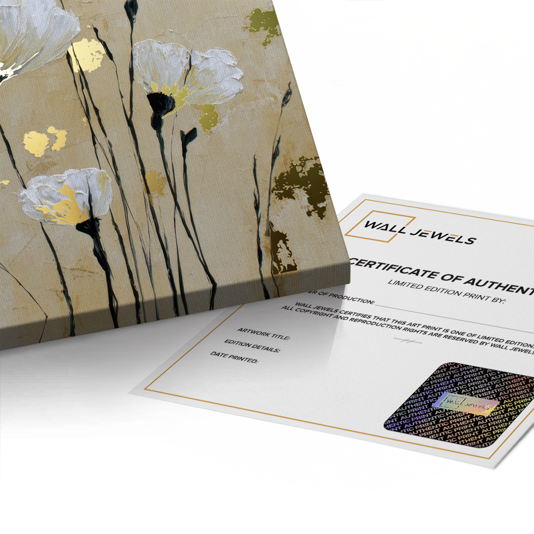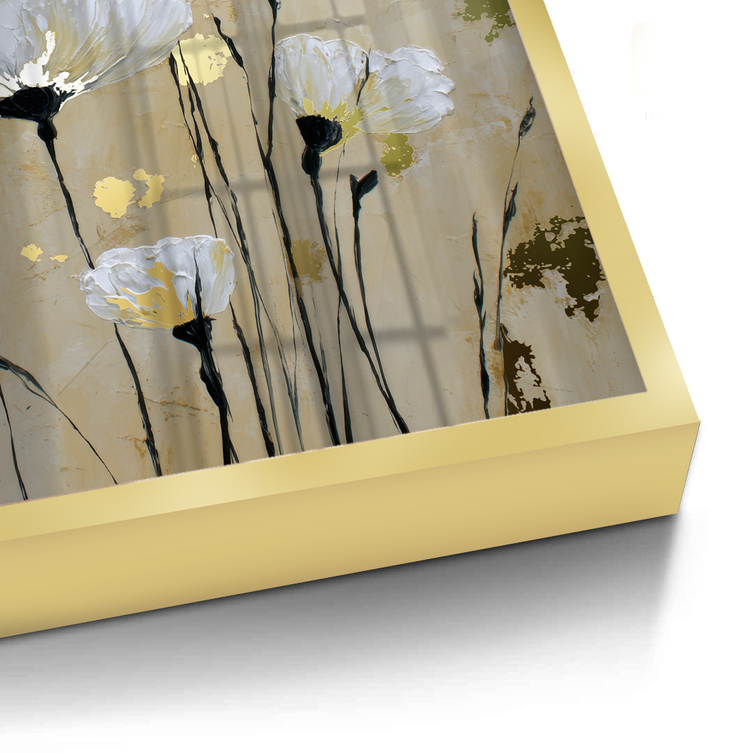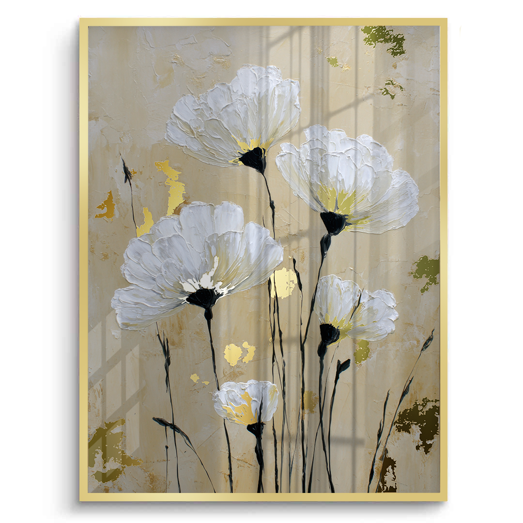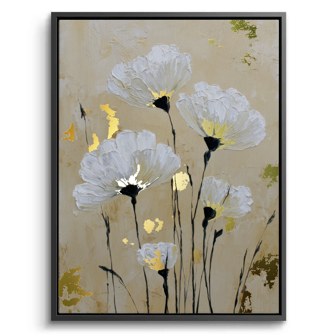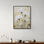 Soft white anemones rise gently against a warm beige background, creating a calm and dreamy floral composition. Gold foiling illuminates the flower centers, adding subtle luxury and warmth, while delicate stems bring balance, elegance, and timeless serenity to the artwork.