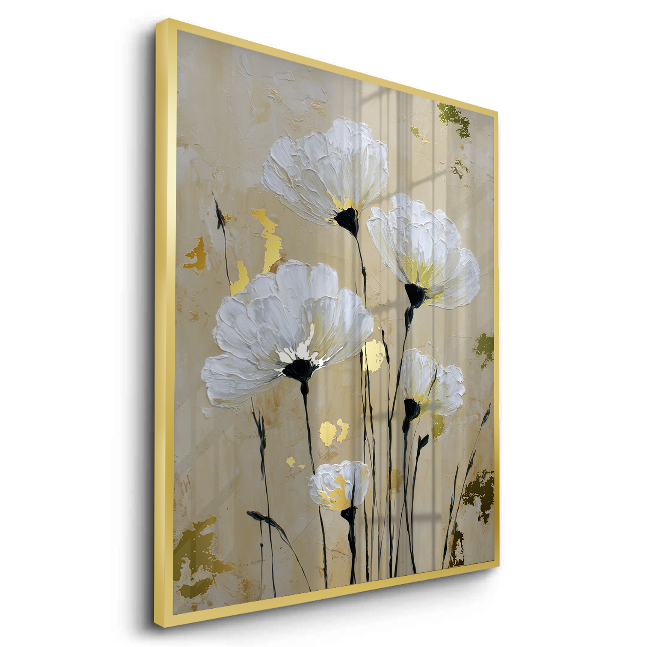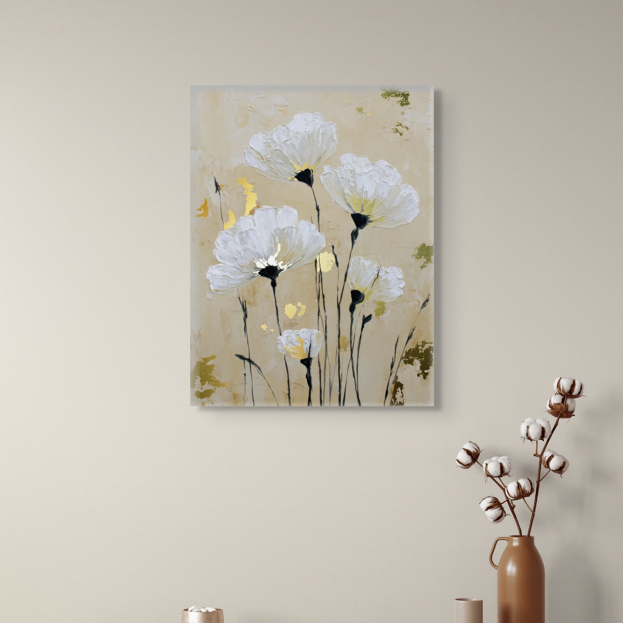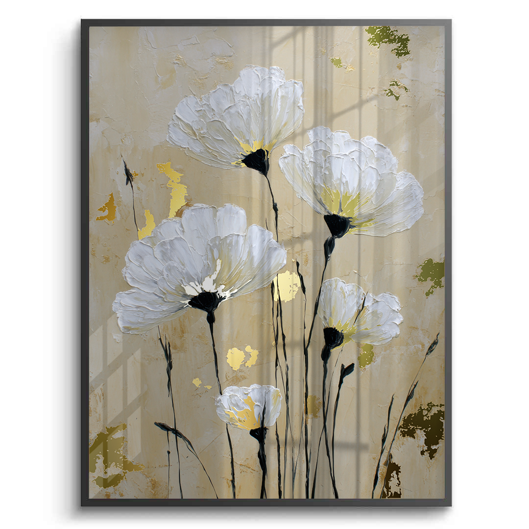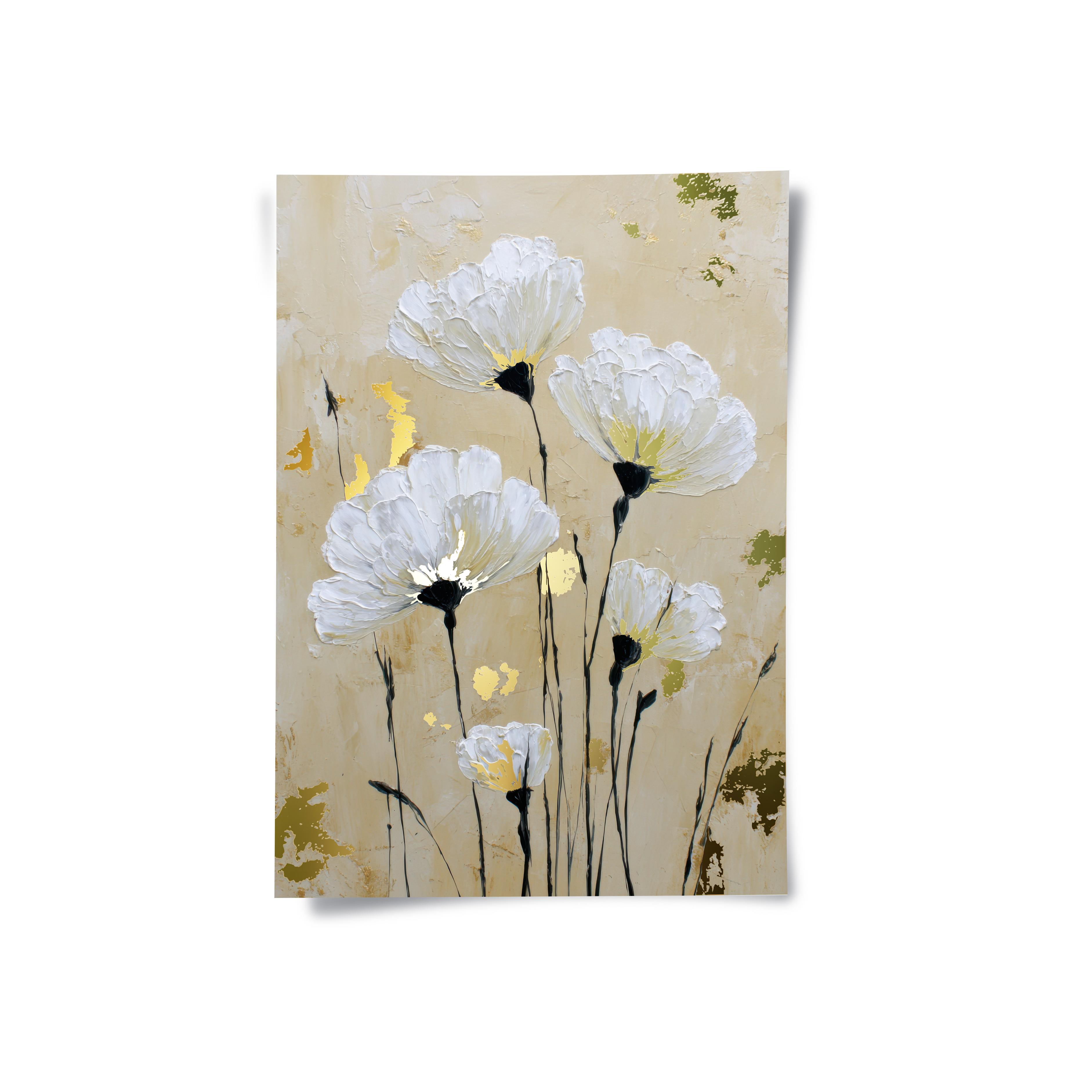 Soft white anemones rise gently against a warm beige background, creating a calm and dreamy floral composition. Gold foiling illuminates the flower centers, adding subtle luxury and warmth, while delicate stems bring balance, elegance, and timeless serenity to the artwork.