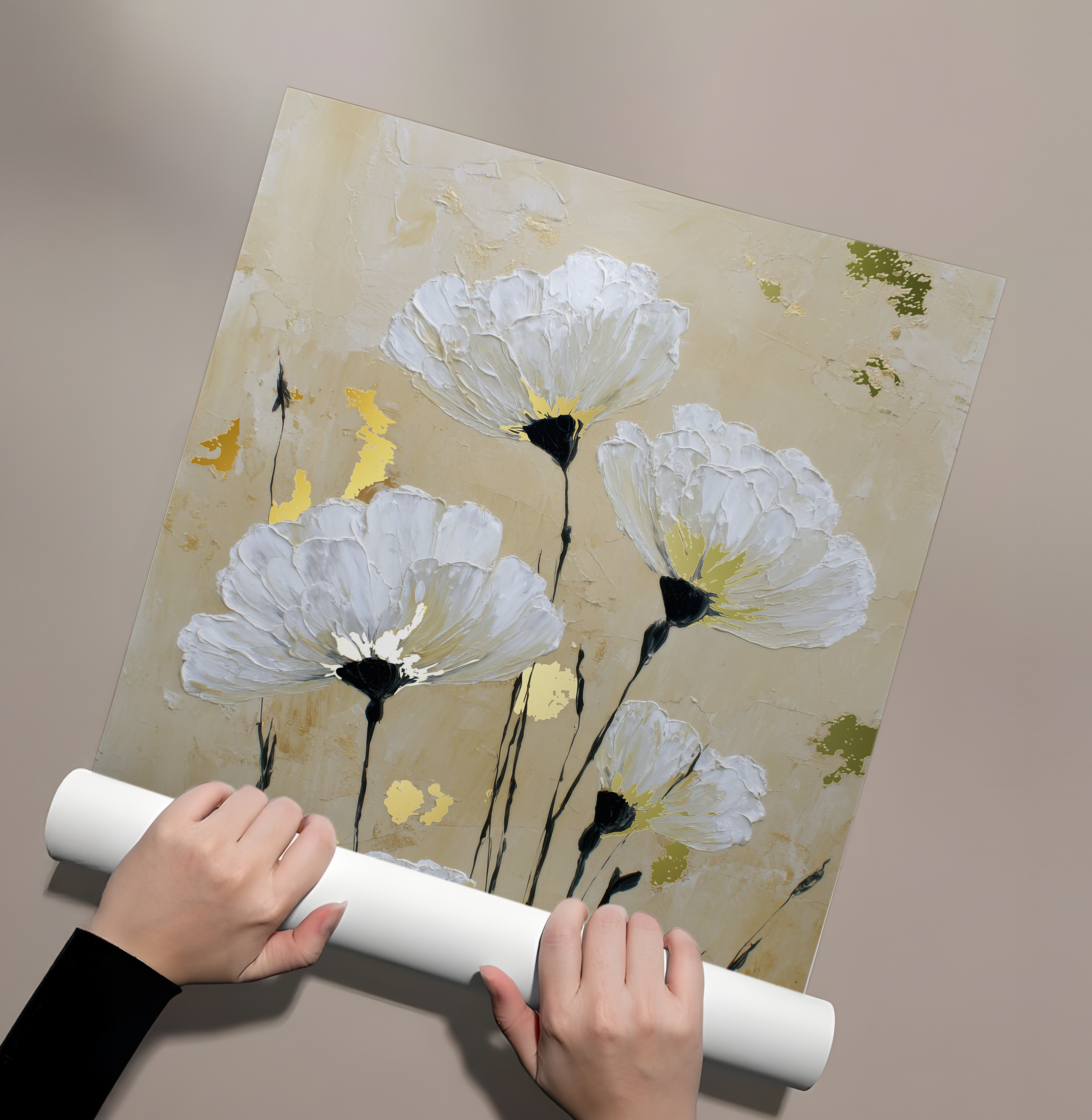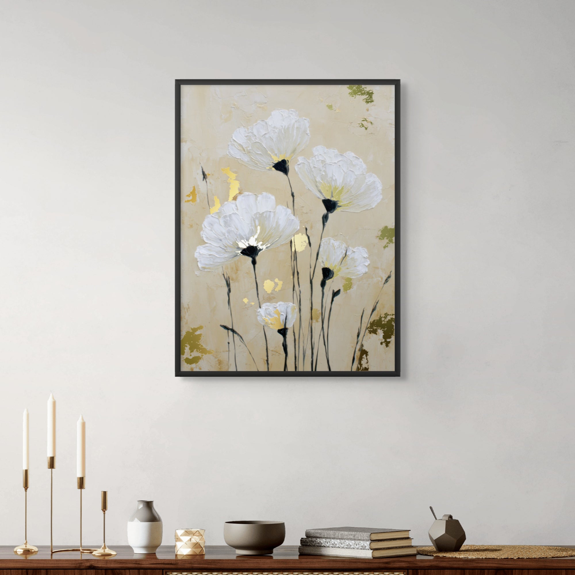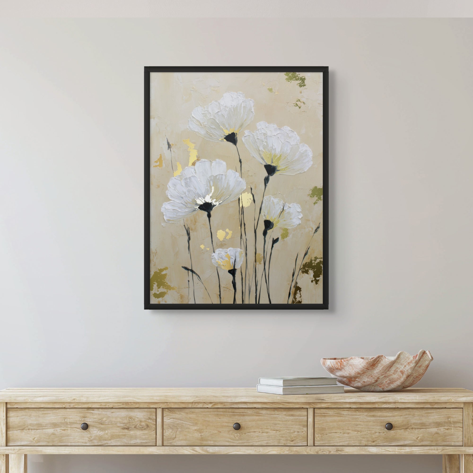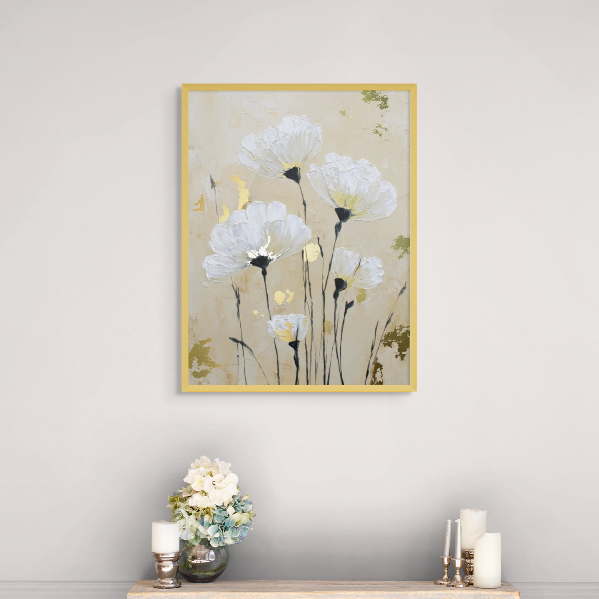 Soft white anemones rise gently against a warm beige background, creating a calm and dreamy floral composition. Gold foiling illuminates the flower centers, adding subtle luxury and warmth, while delicate stems bring balance, elegance, and timeless serenity to the artwork.