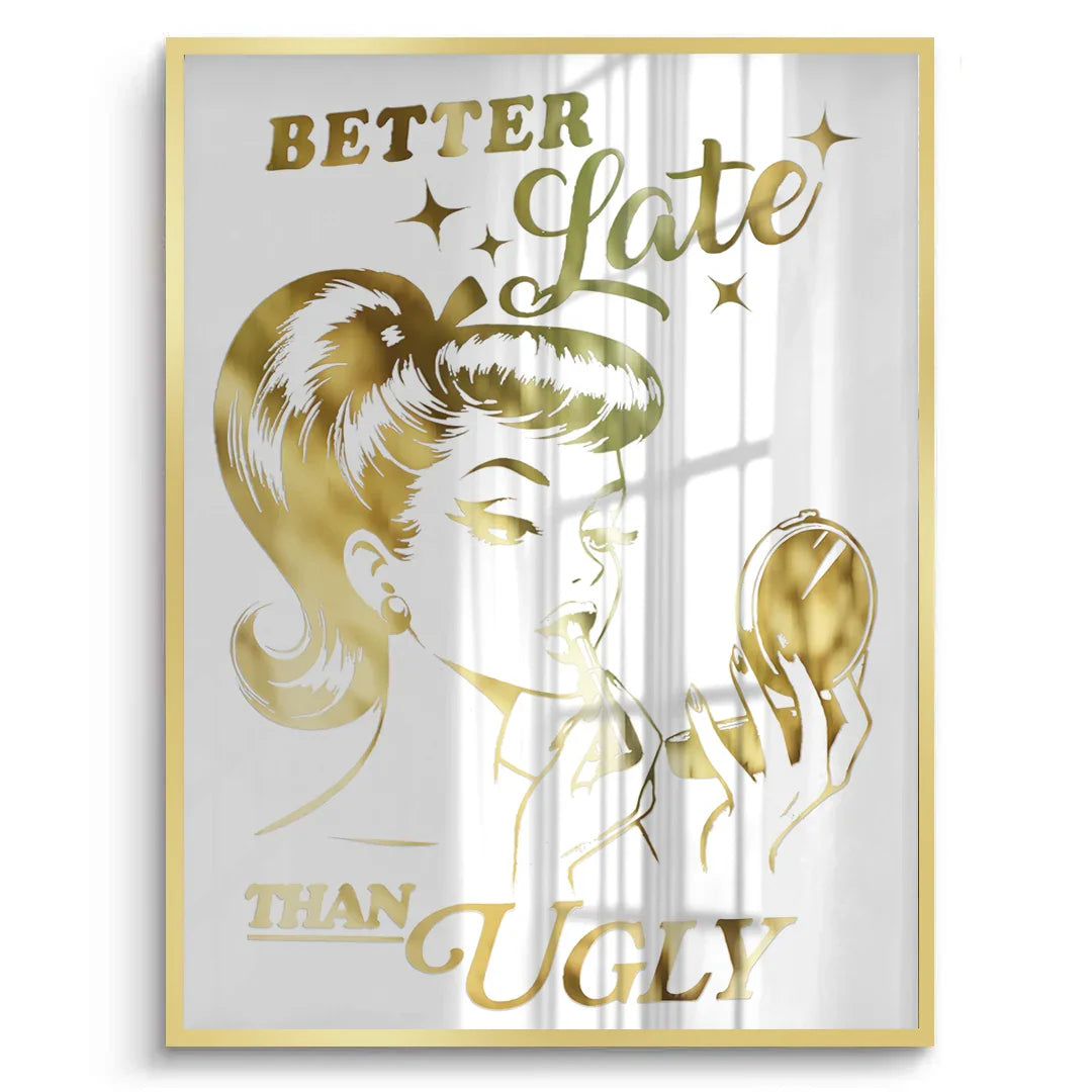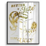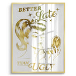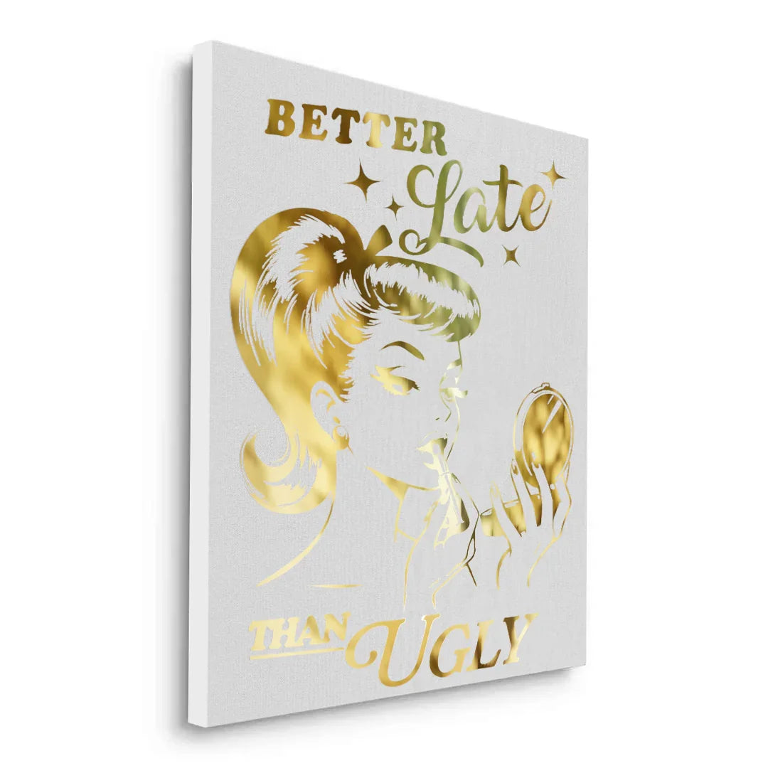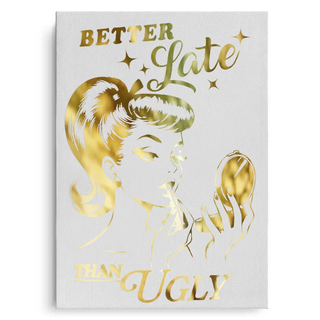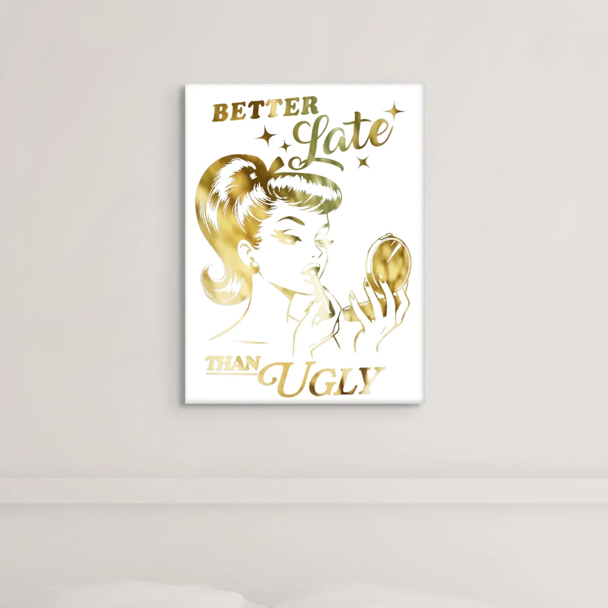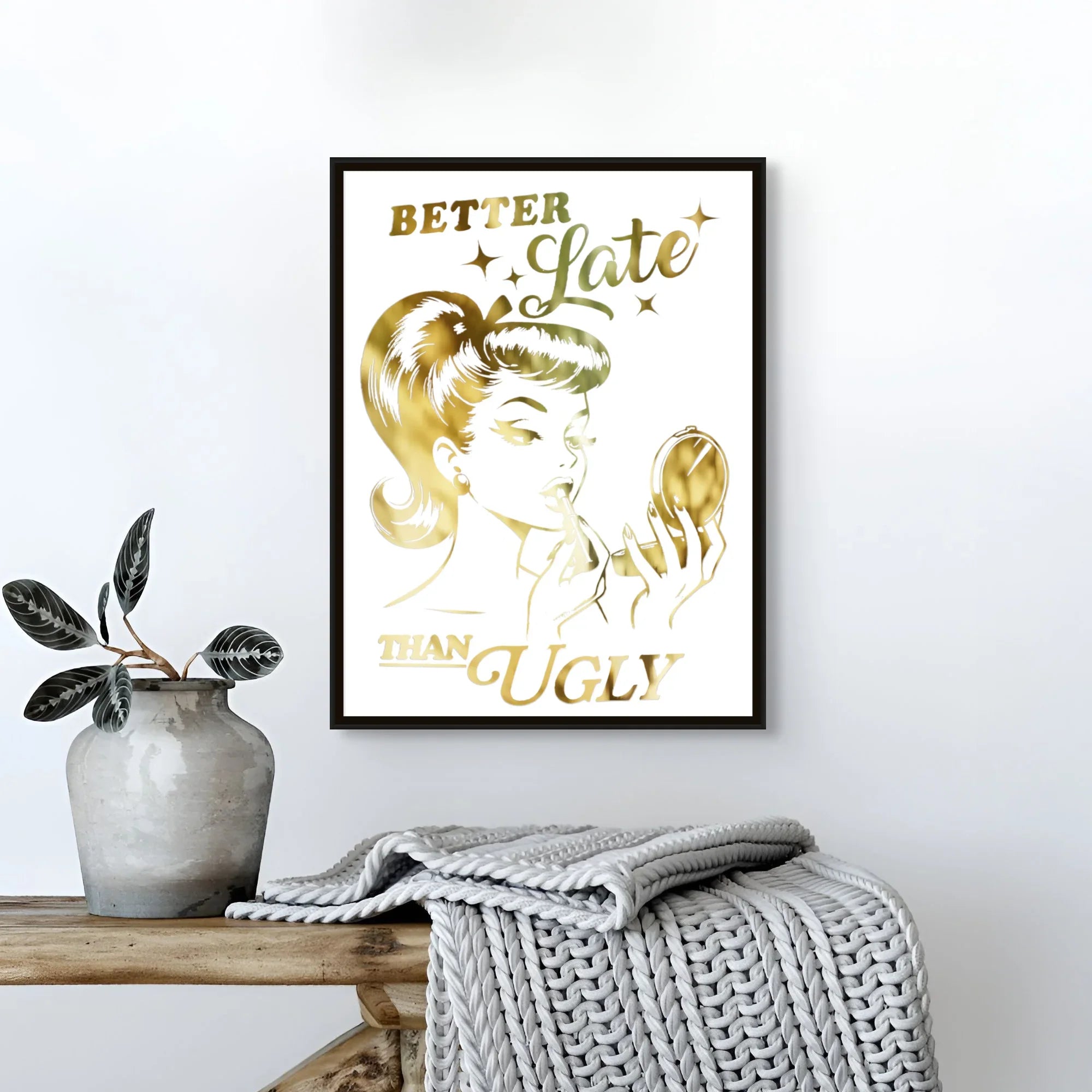 A fun and fabulous artwork celebrating the motto “Better Late Than Ugly,” this gold-foiled beauty piece is perfect for makeup lovers and glam queens. Ideal for vanities, salons, or dressing spaces that thrive on style.