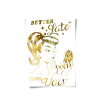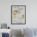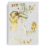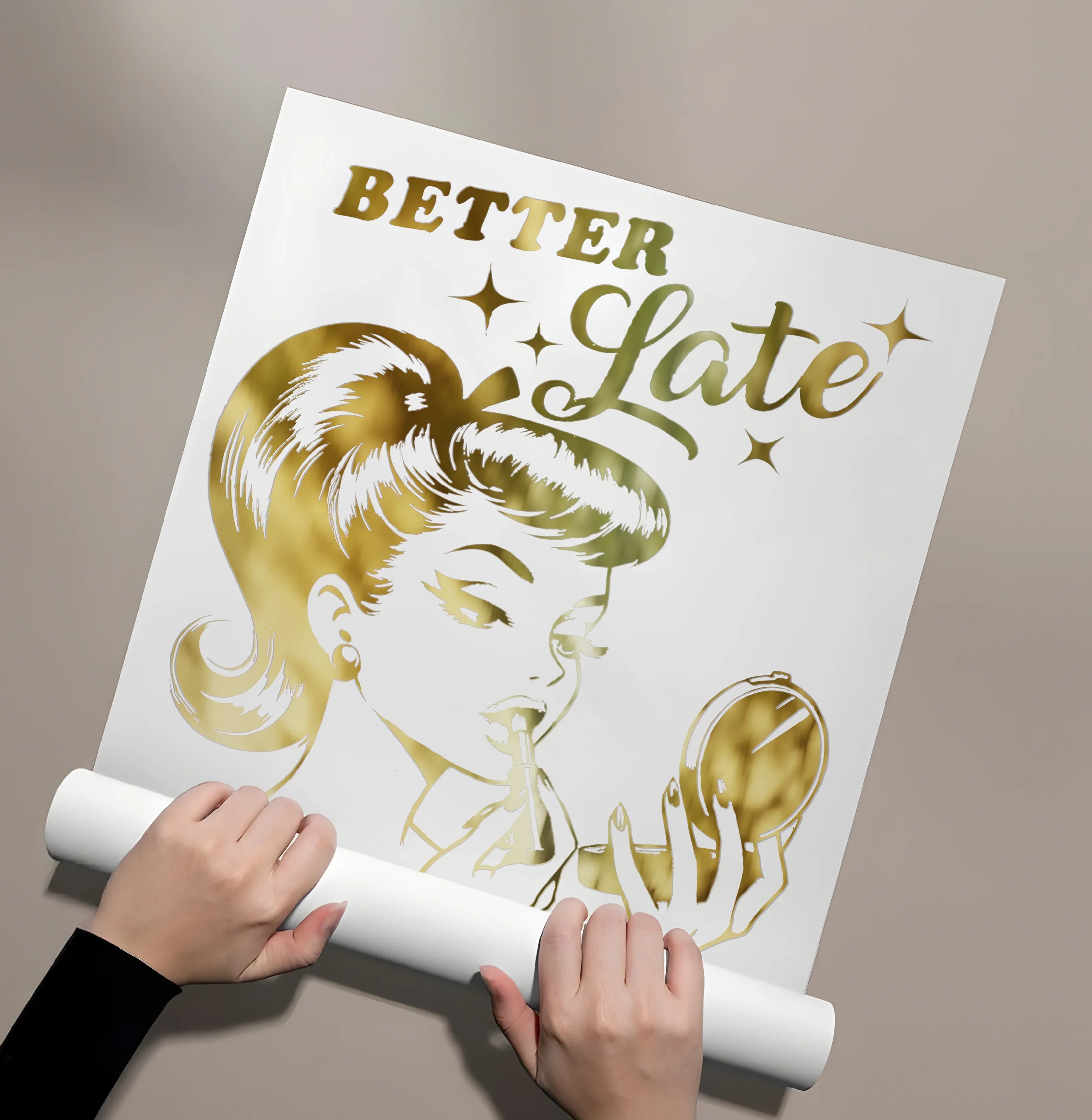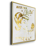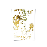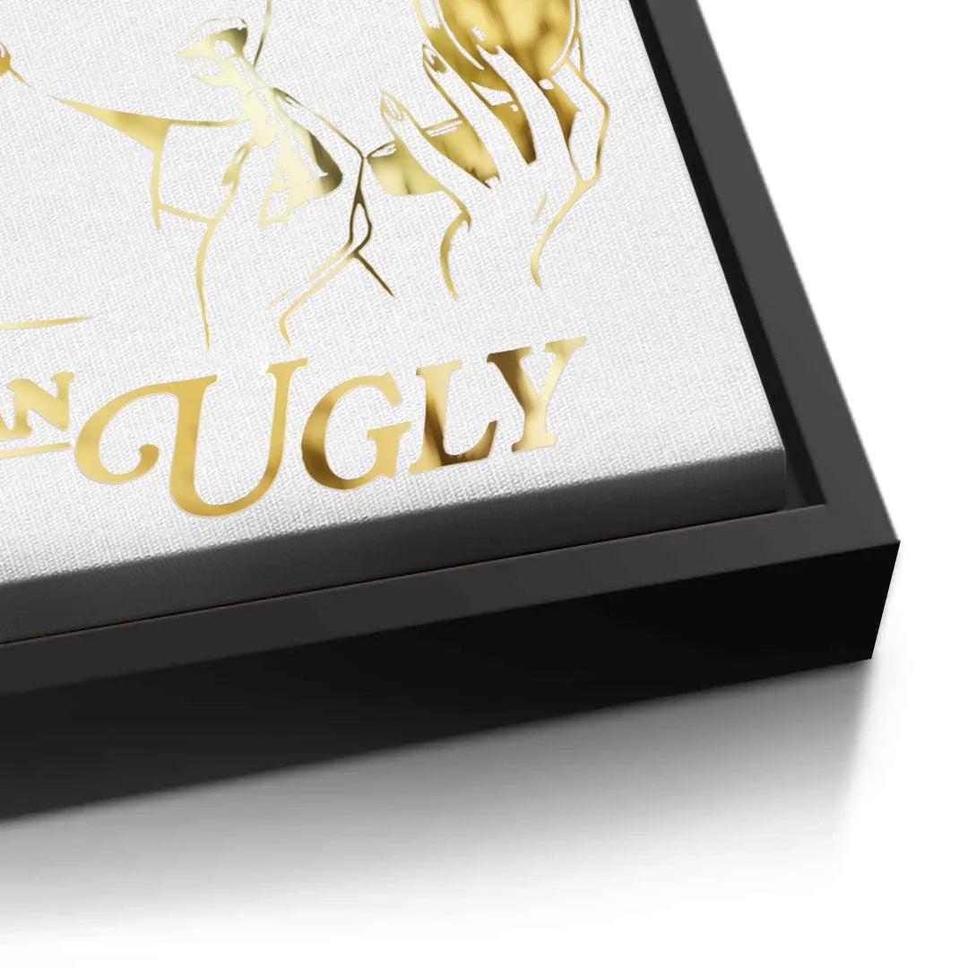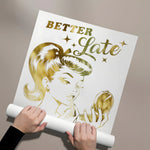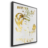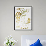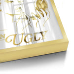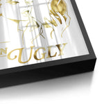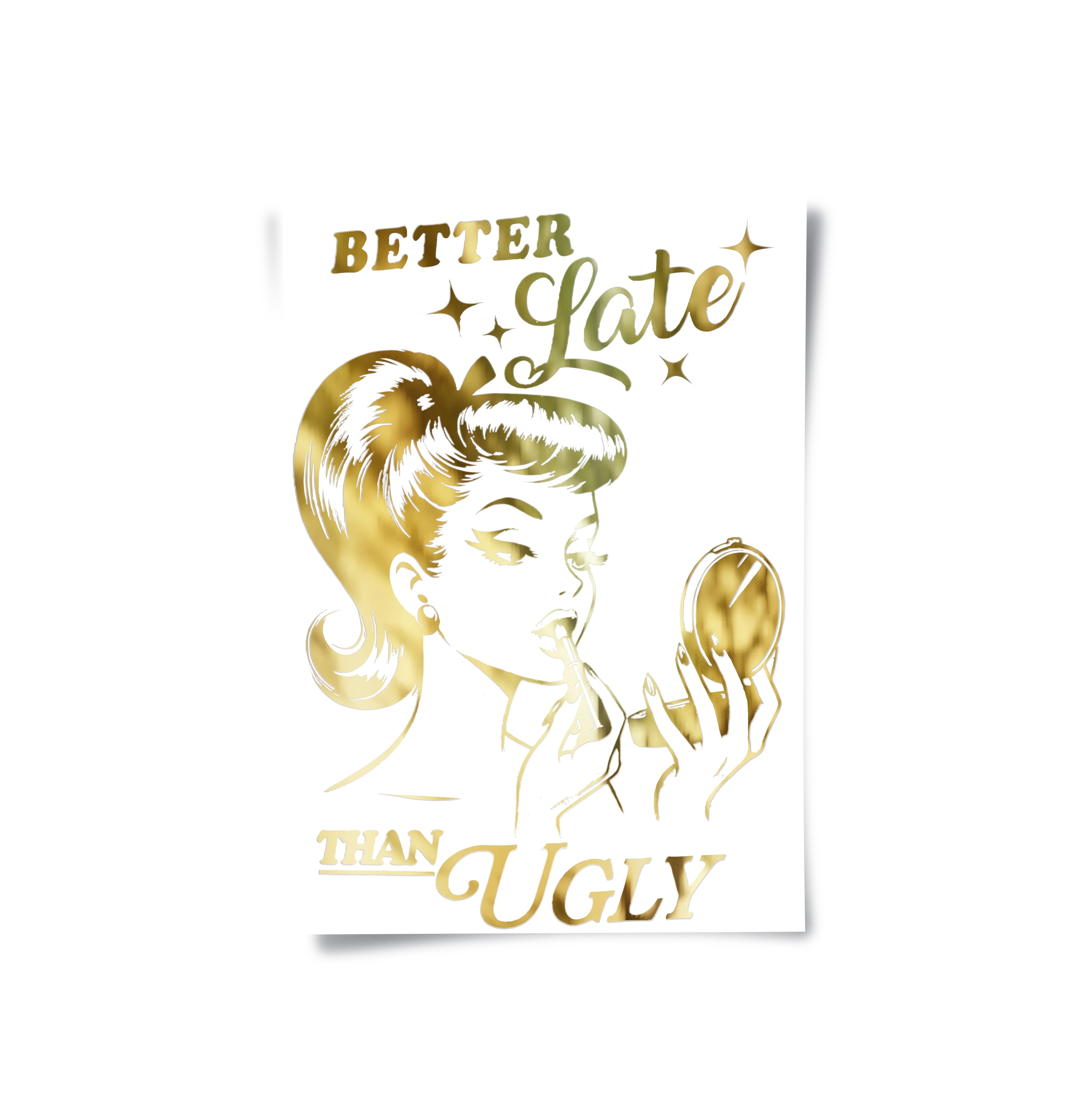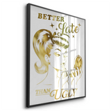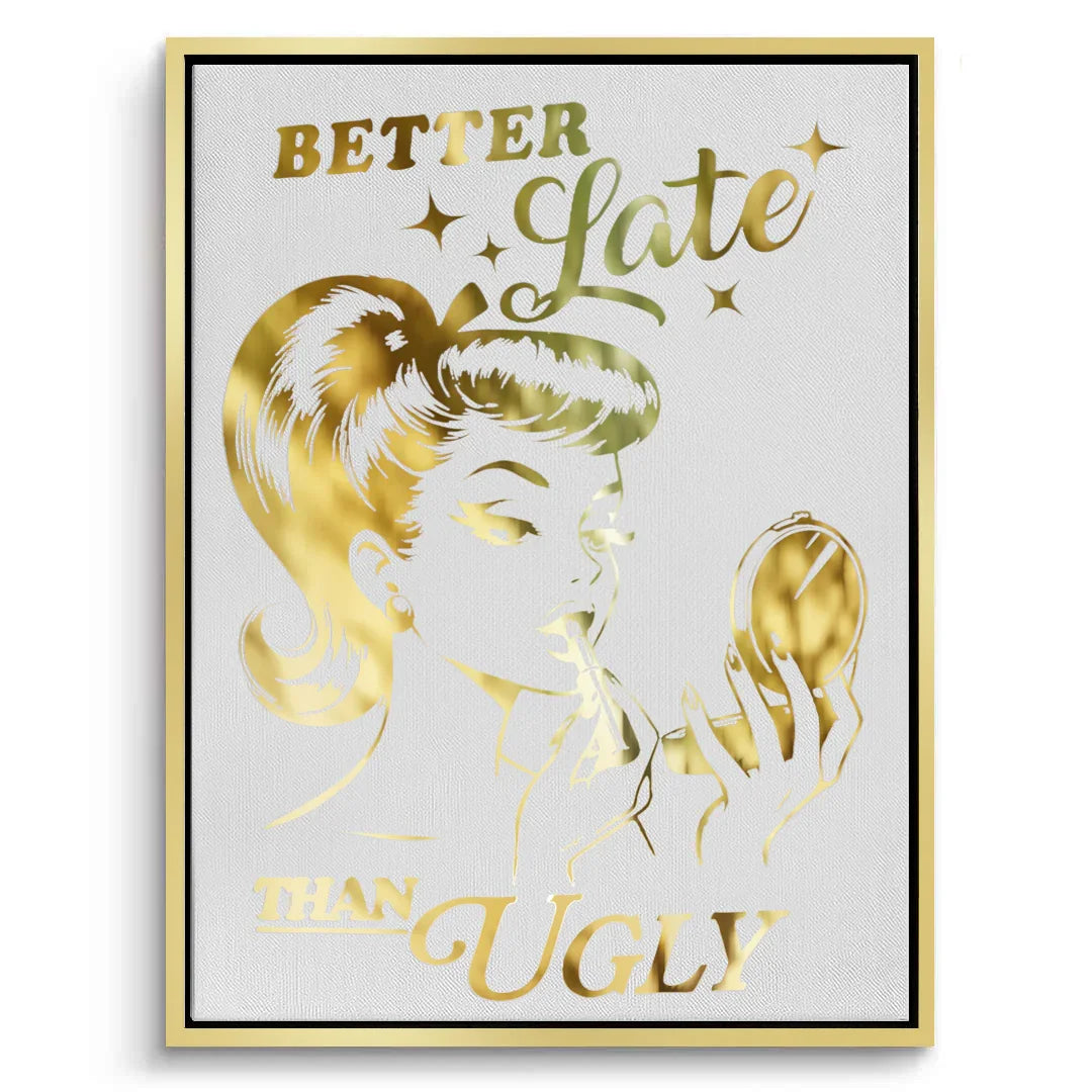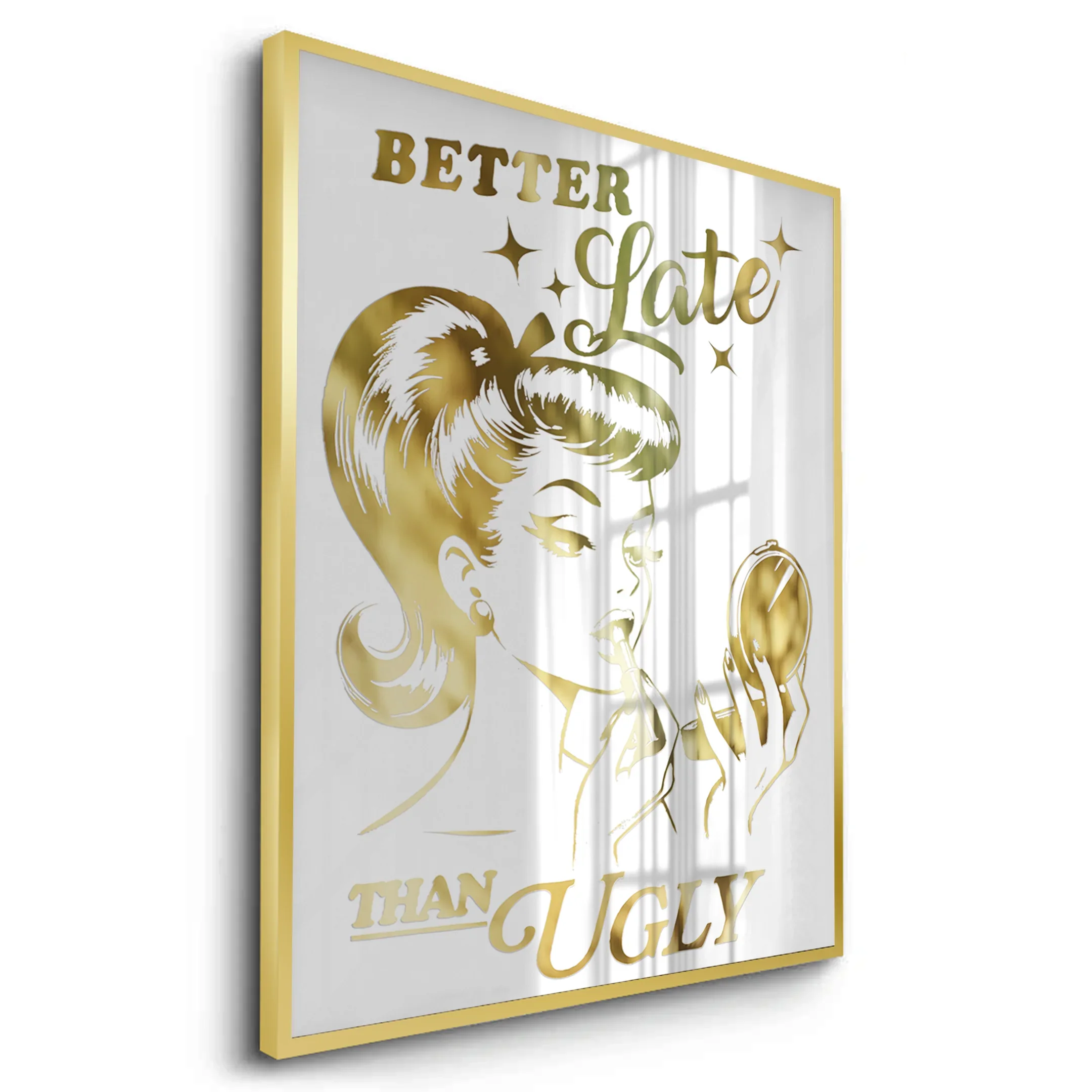 A fun and fabulous artwork celebrating the motto “Better Late Than Ugly,” this gold-foiled beauty piece is perfect for makeup lovers and glam queens. Ideal for vanities, salons, or dressing spaces that thrive on style.