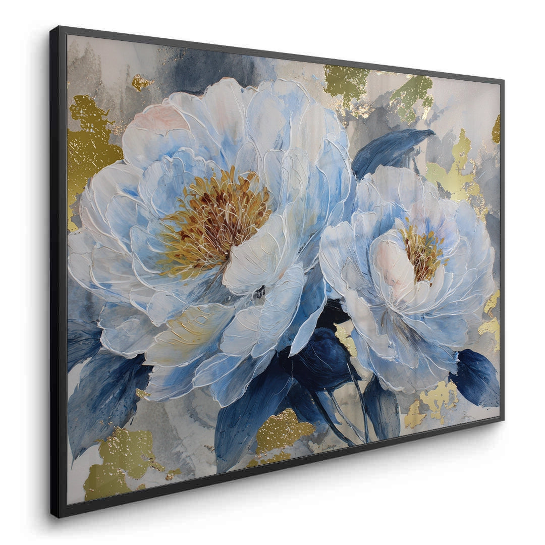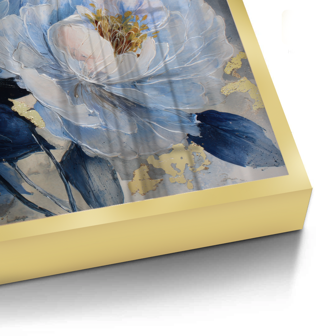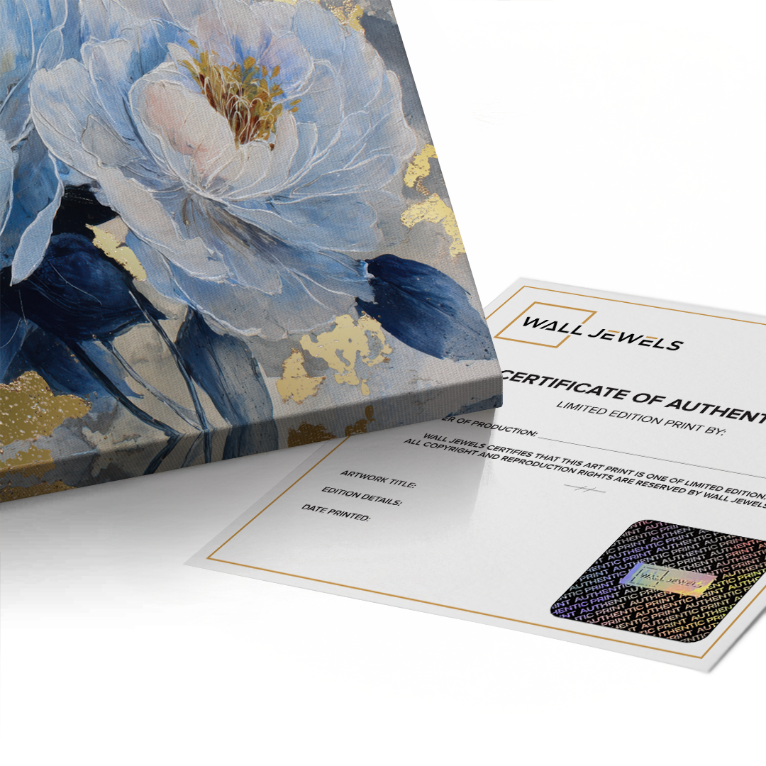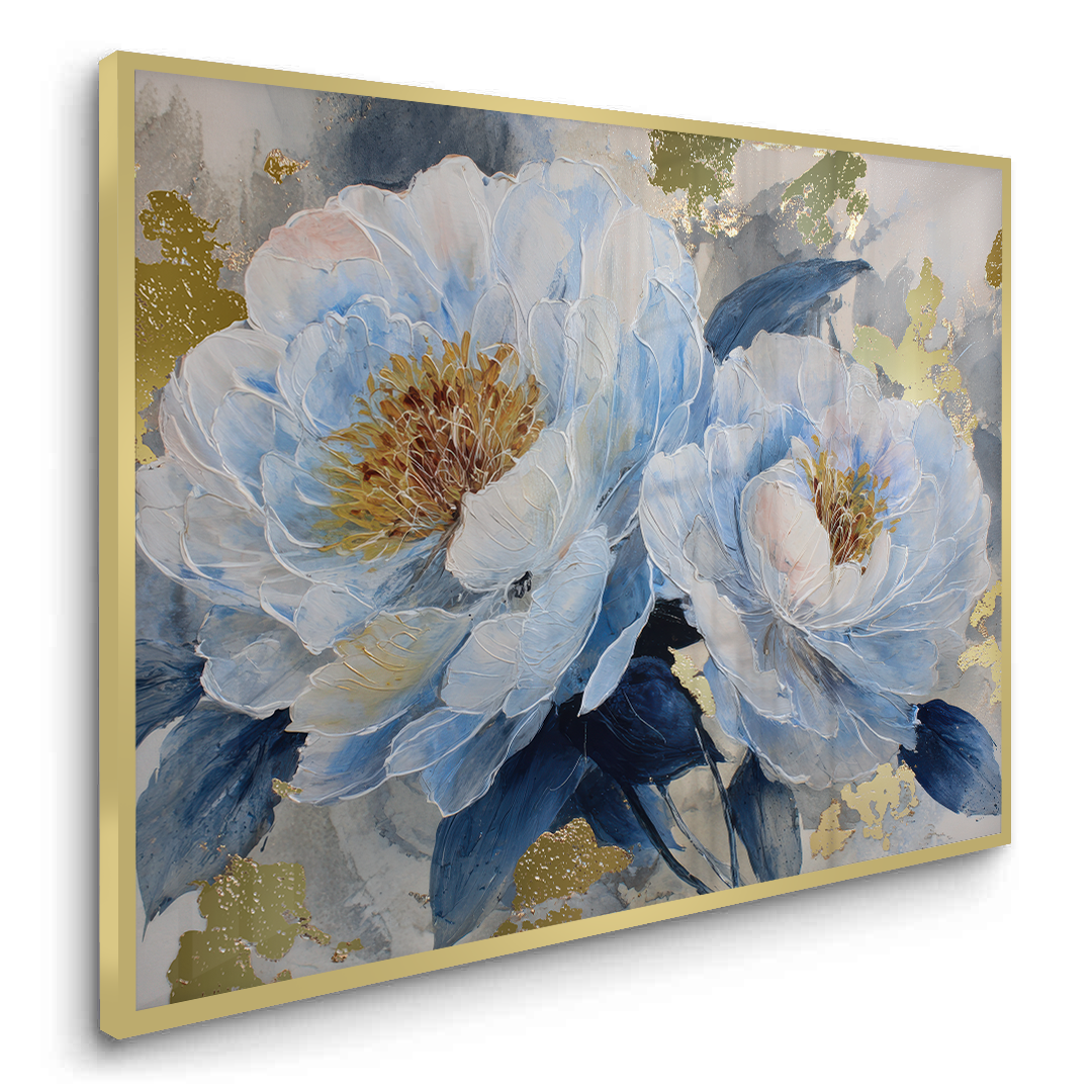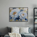 Blue Reverie captures layered peony blooms in soft blue and ivory tones, accented with subtle gold highlights against a textured grey backdrop. The artwork evokes calm and quiet elegance, making it ideal for bedrooms, living spaces, and refined contemporary interiors.