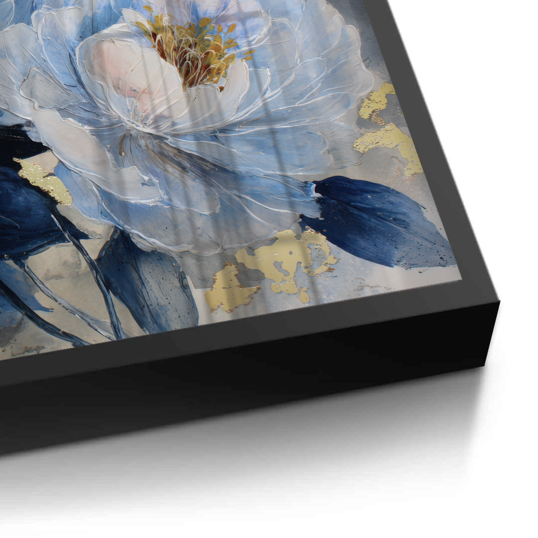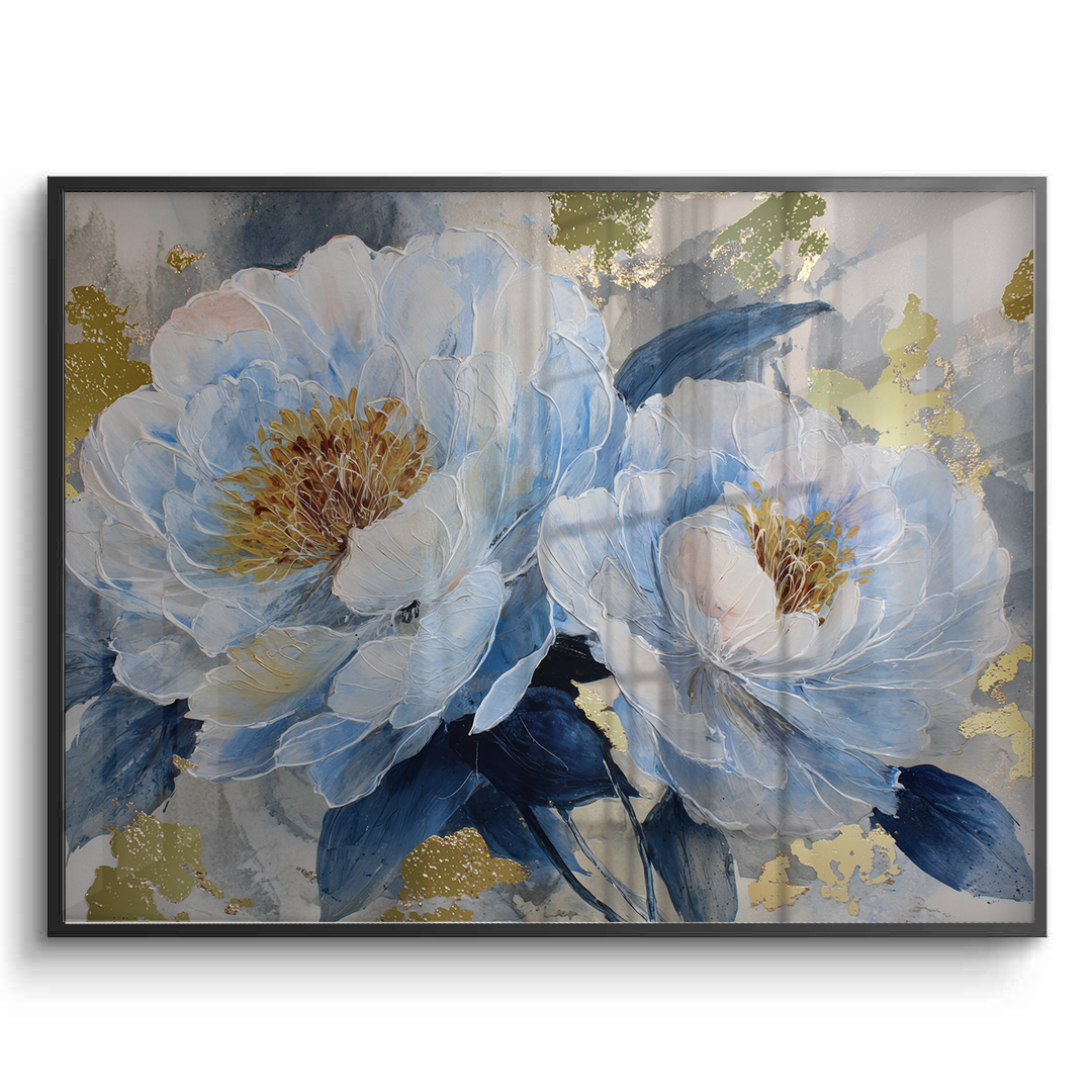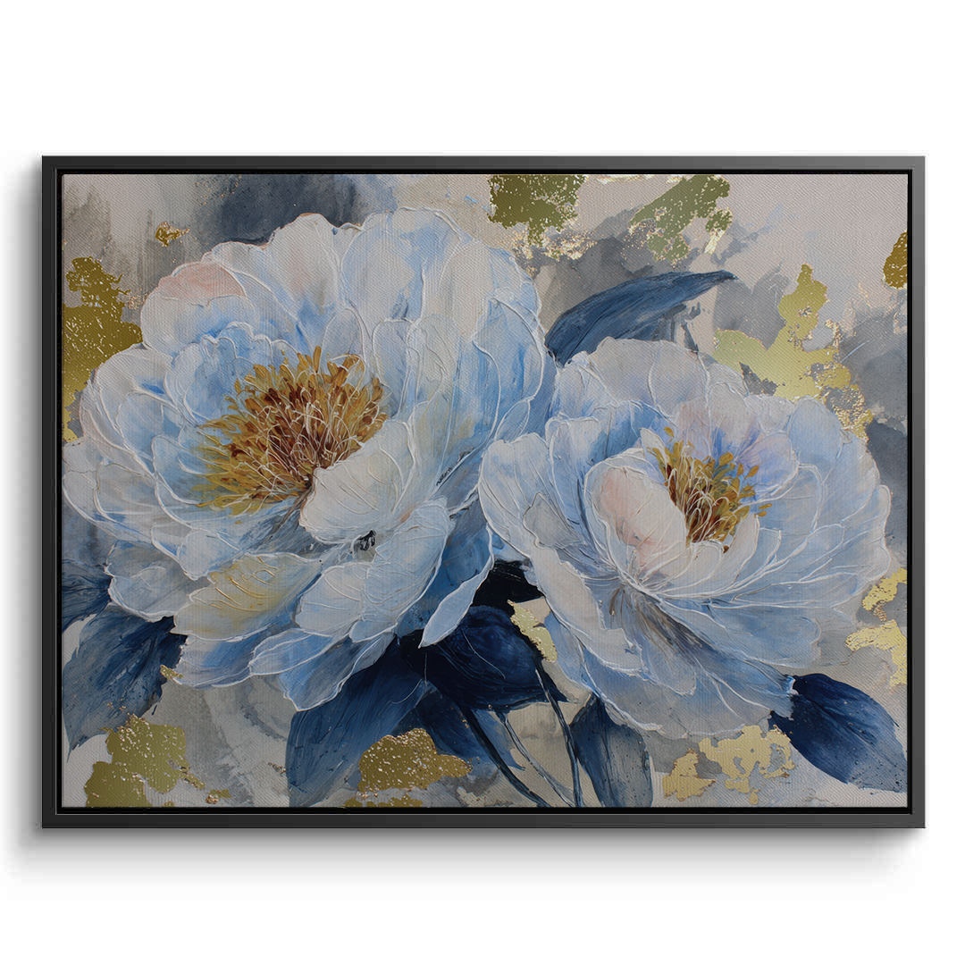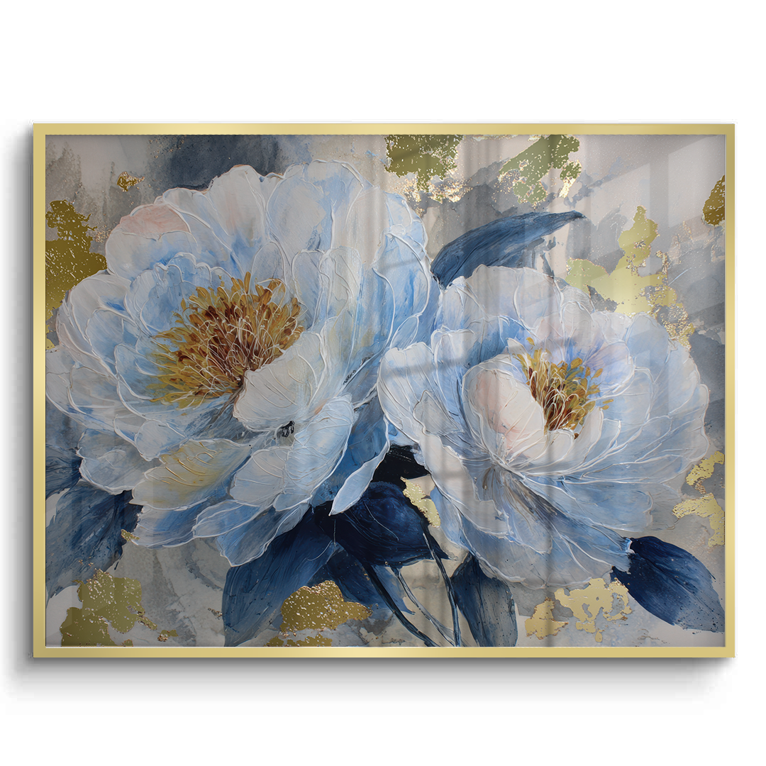 Blue Reverie captures layered peony blooms in soft blue and ivory tones, accented with subtle gold highlights against a textured grey backdrop. The artwork evokes calm and quiet elegance, making it ideal for bedrooms, living spaces, and refined contemporary interiors.
