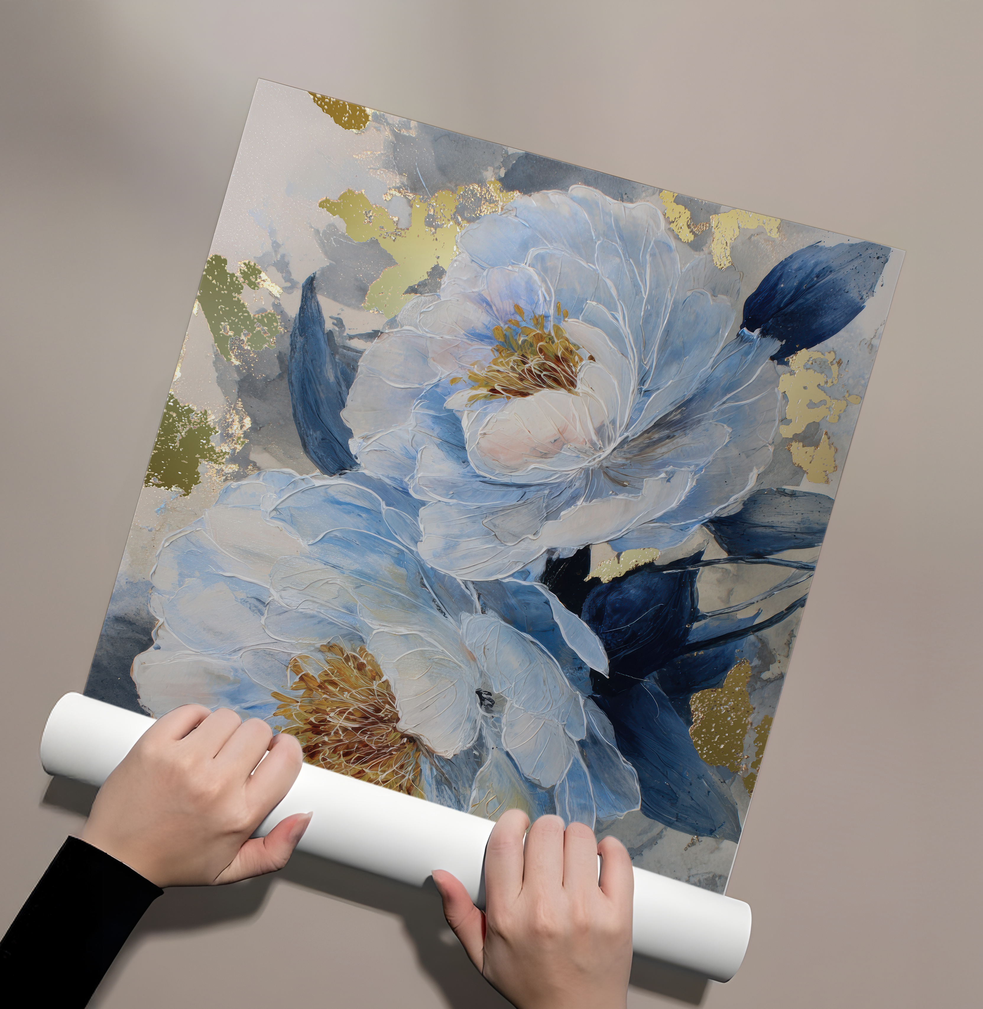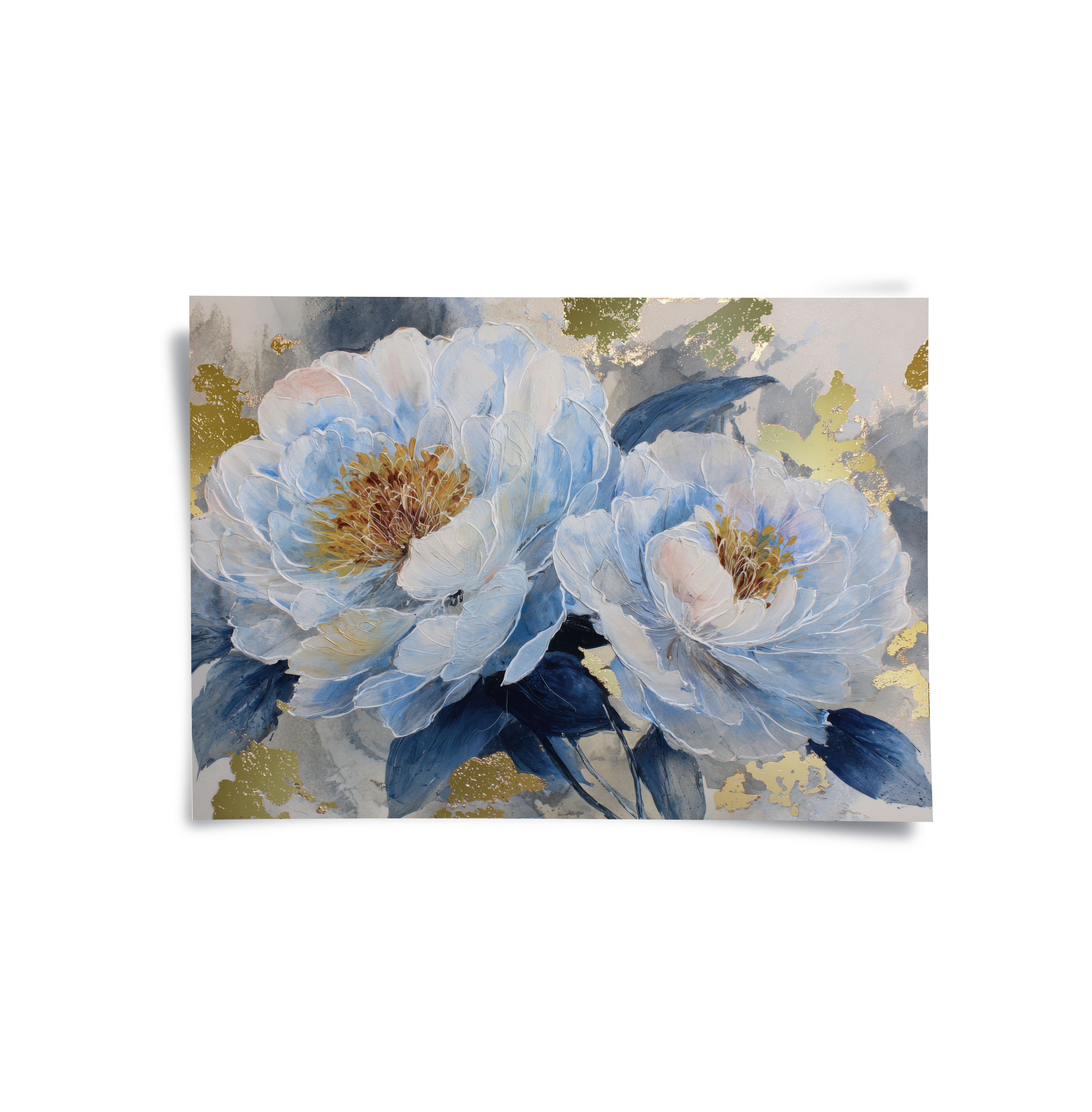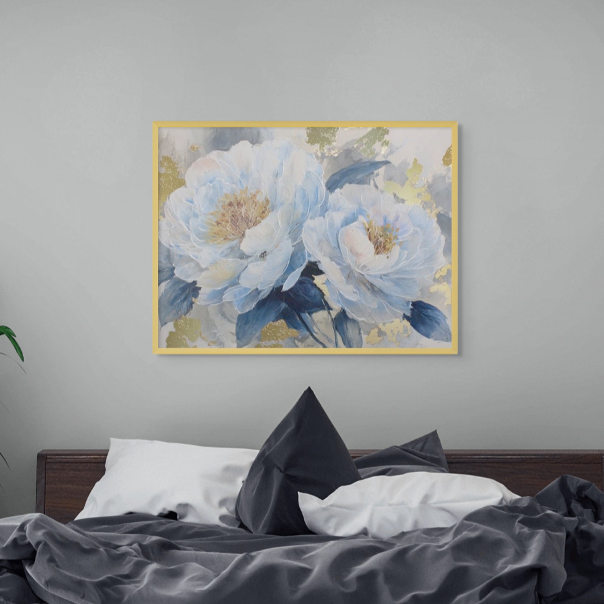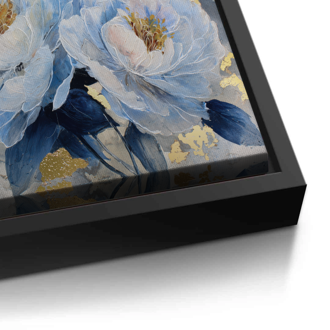 Blue Reverie captures layered peony blooms in soft blue and ivory tones, accented with subtle gold highlights against a textured grey backdrop. The artwork evokes calm and quiet elegance, making it ideal for bedrooms, living spaces, and refined contemporary interiors.