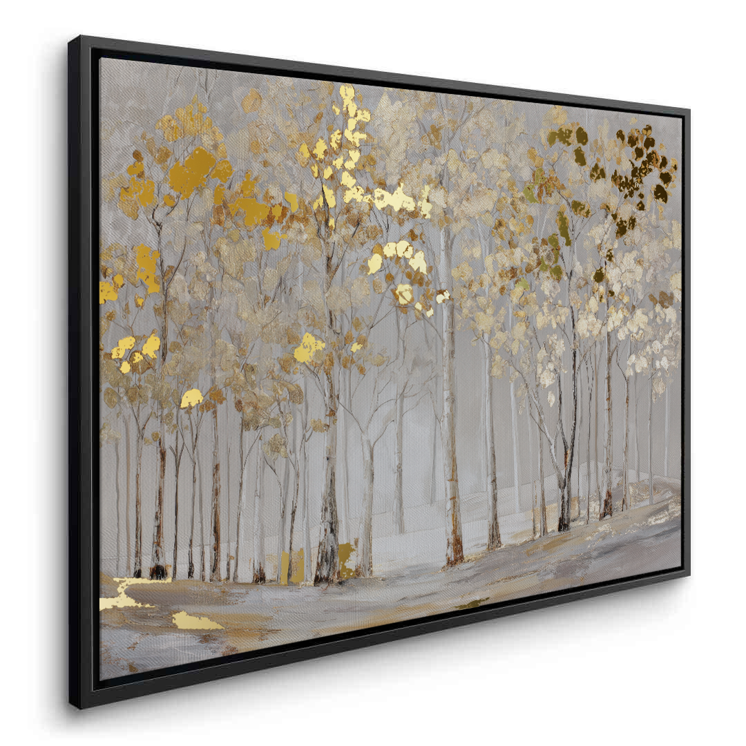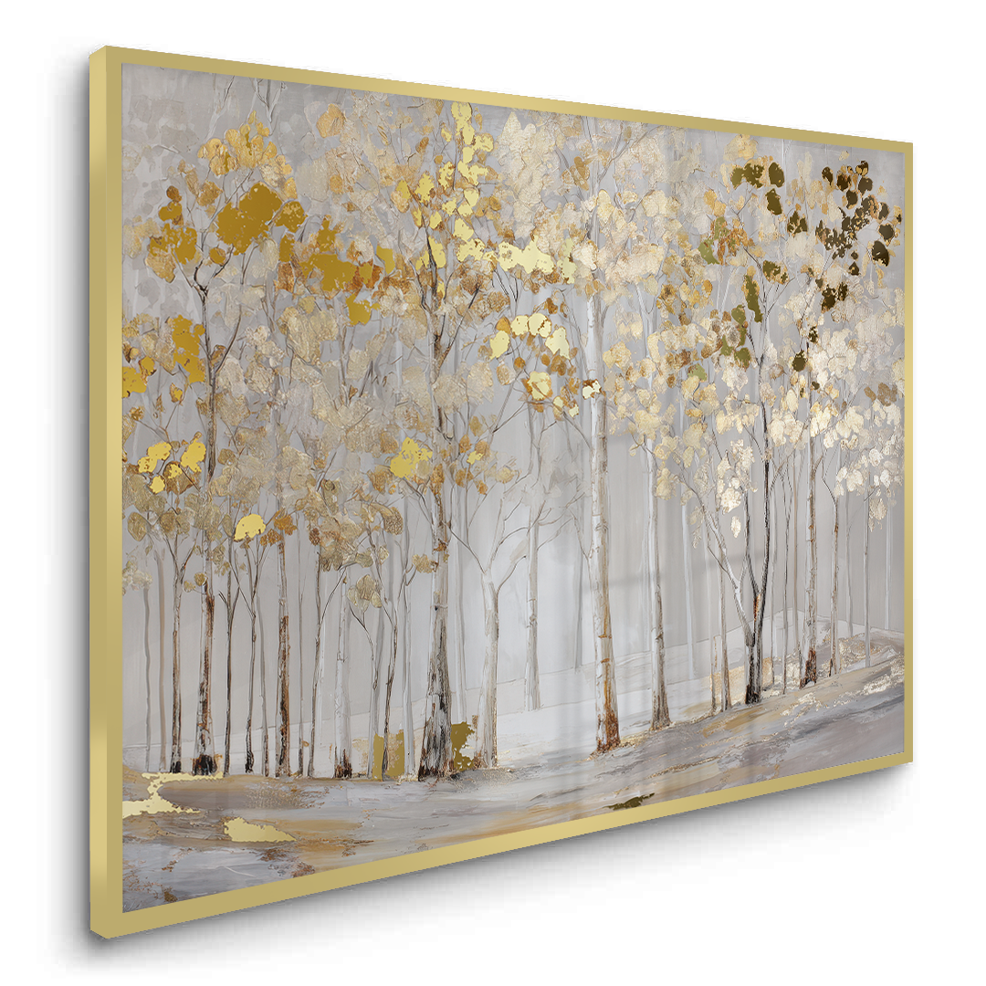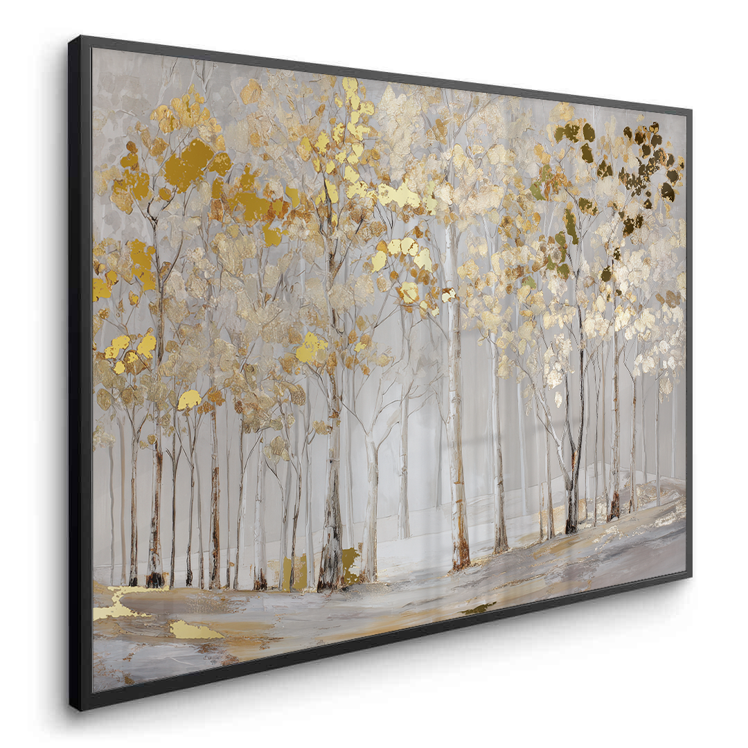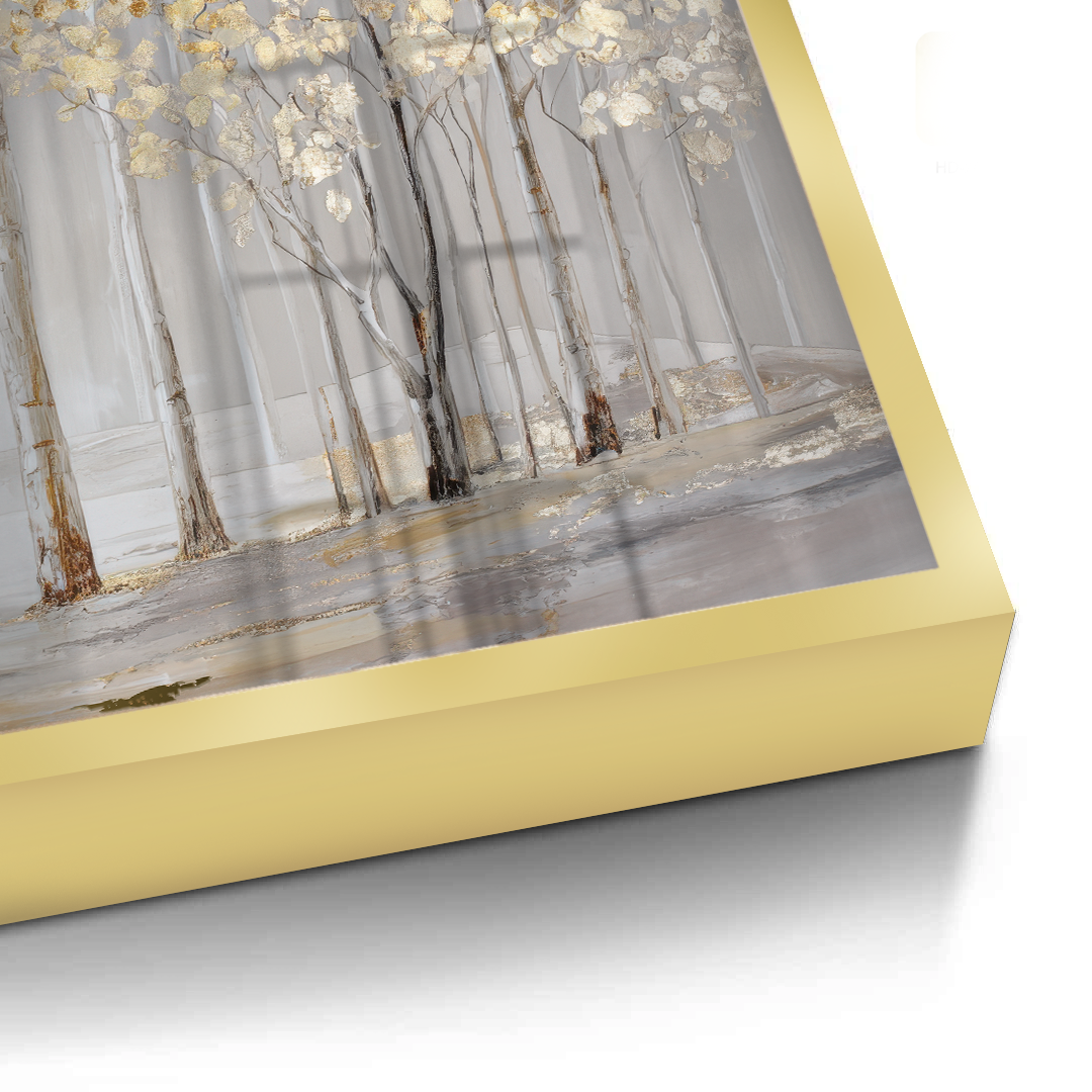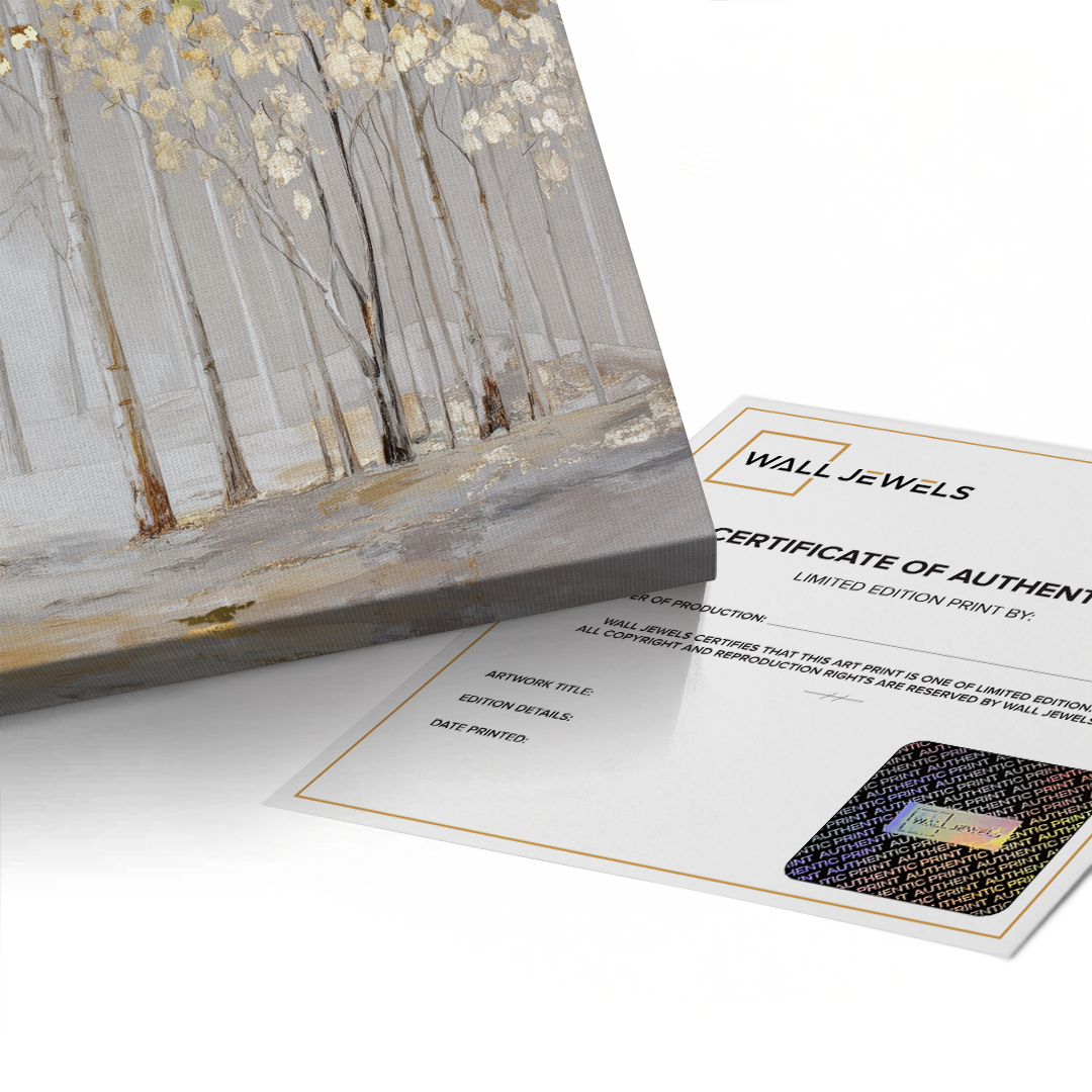 Elderlight Grove captures a serene stand of pale trees bathed in soft winter light, where delicate gold accents glimmer through a misted landscape. The artwork brings an airy sense of calm and quiet elegance, making it ideal for bright living rooms, tranquil bedrooms, and refined hallway spaces.